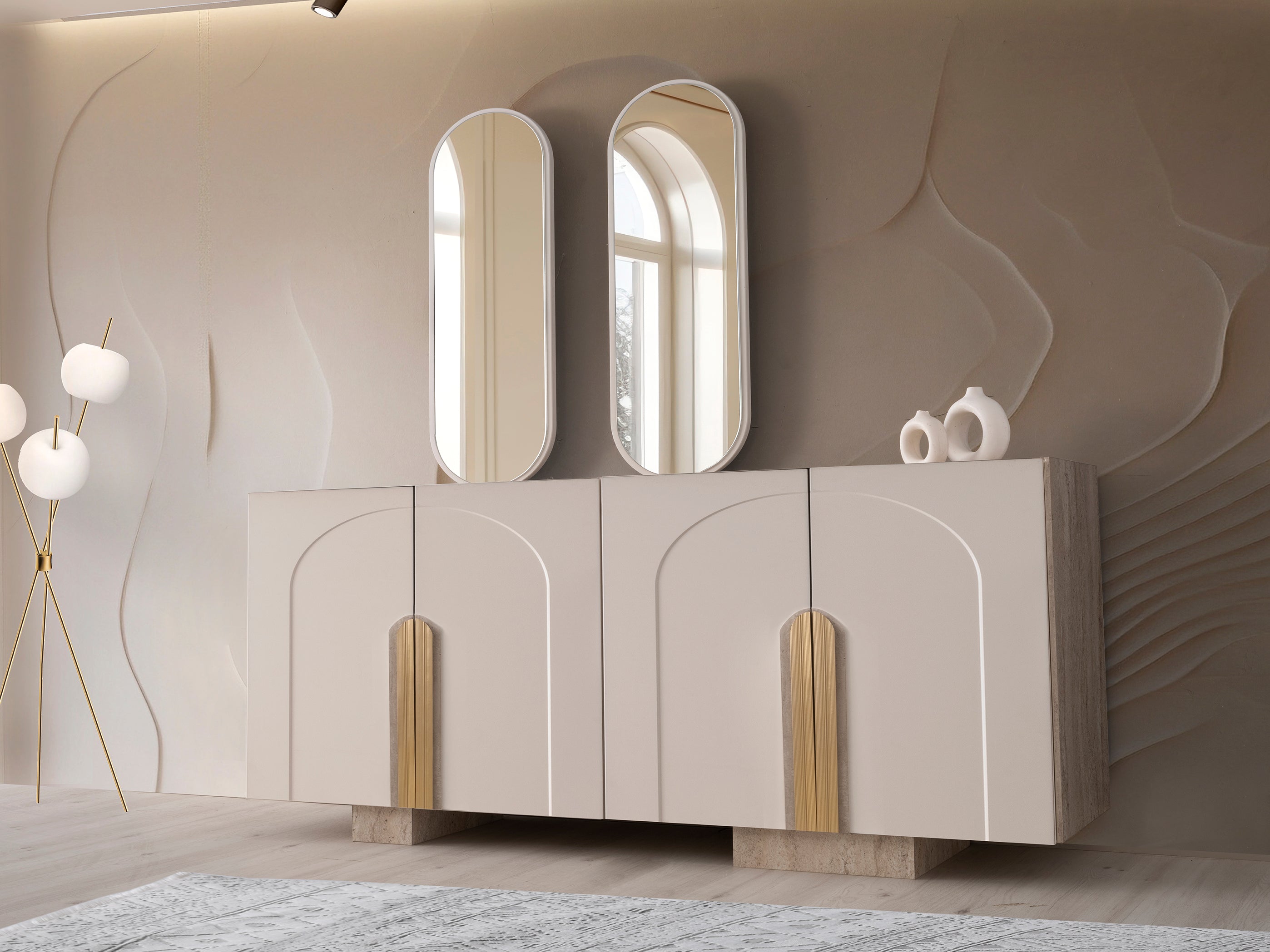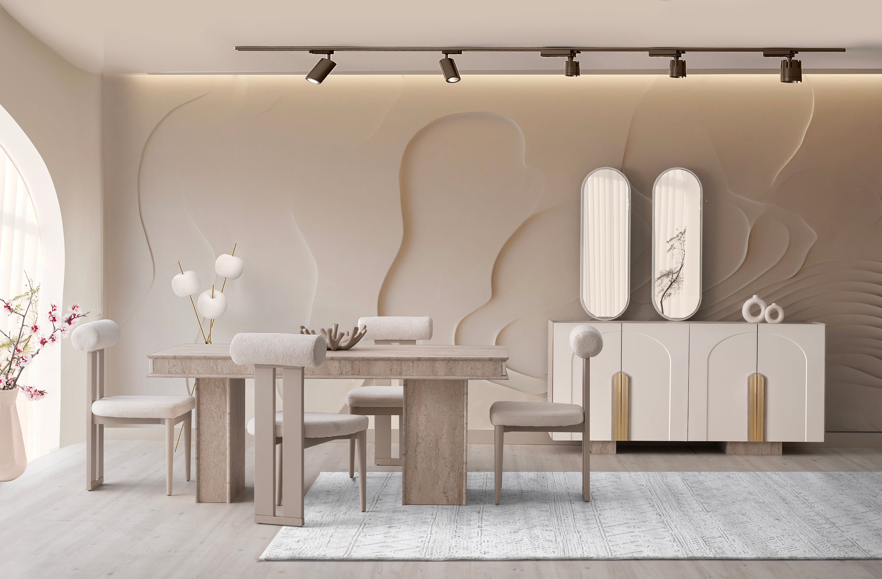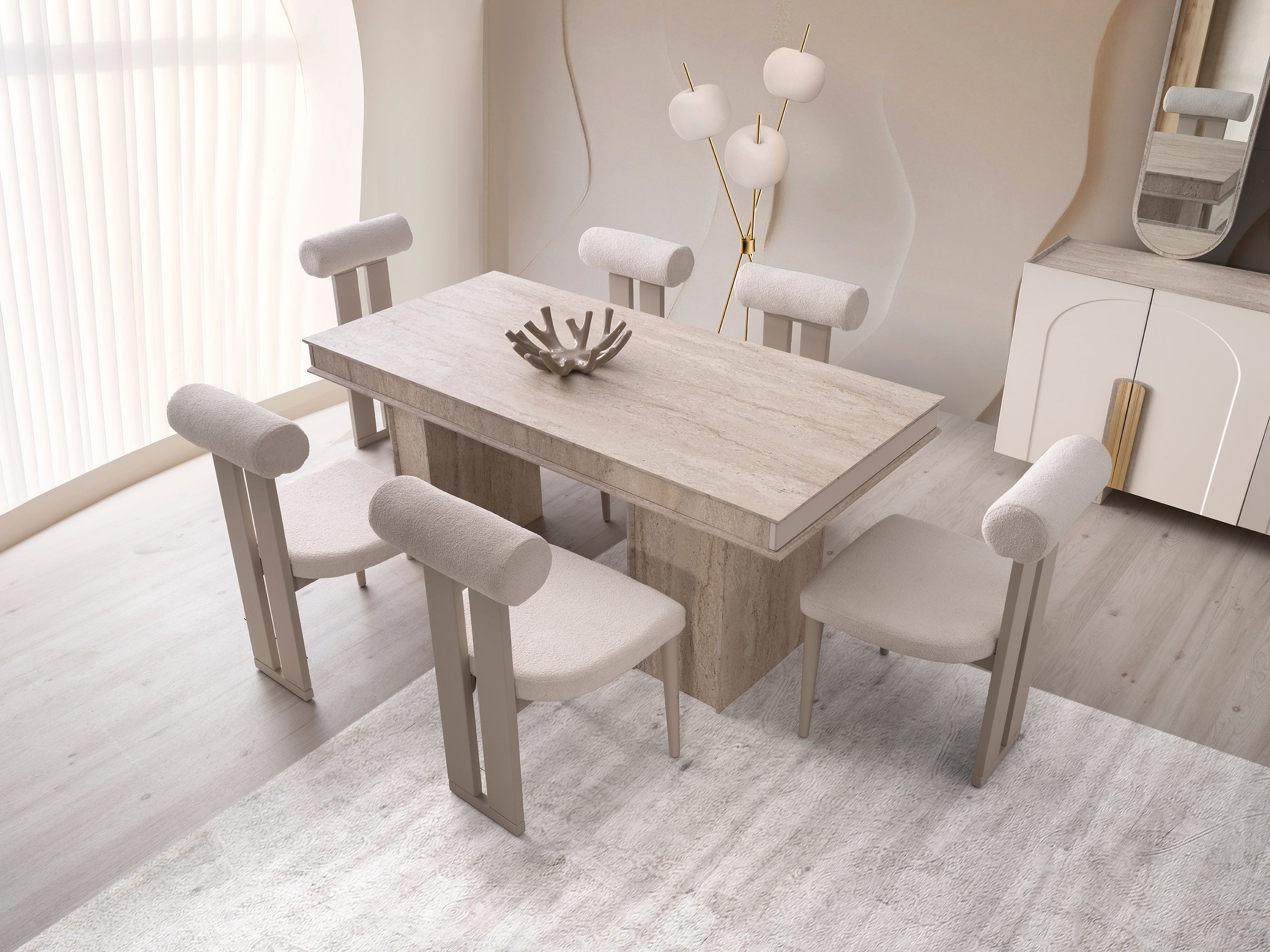 Преобразете вашата трапезария в галерия на модерното изкуство с трапезен комплект "Визон". Вдъхновен от органичните форми в природата и топлината на травертиновия камък, този комплект съчетава смел, скулптурен дизайн с изключителна функционалност. Всеки елемент е проектиран, за да внесе усещане за лукс и хармония във вашия интериор. "Визон" не е просто обзавеждане, а изявление – перфектният център за вашите специални вечери и незабравими спомени.