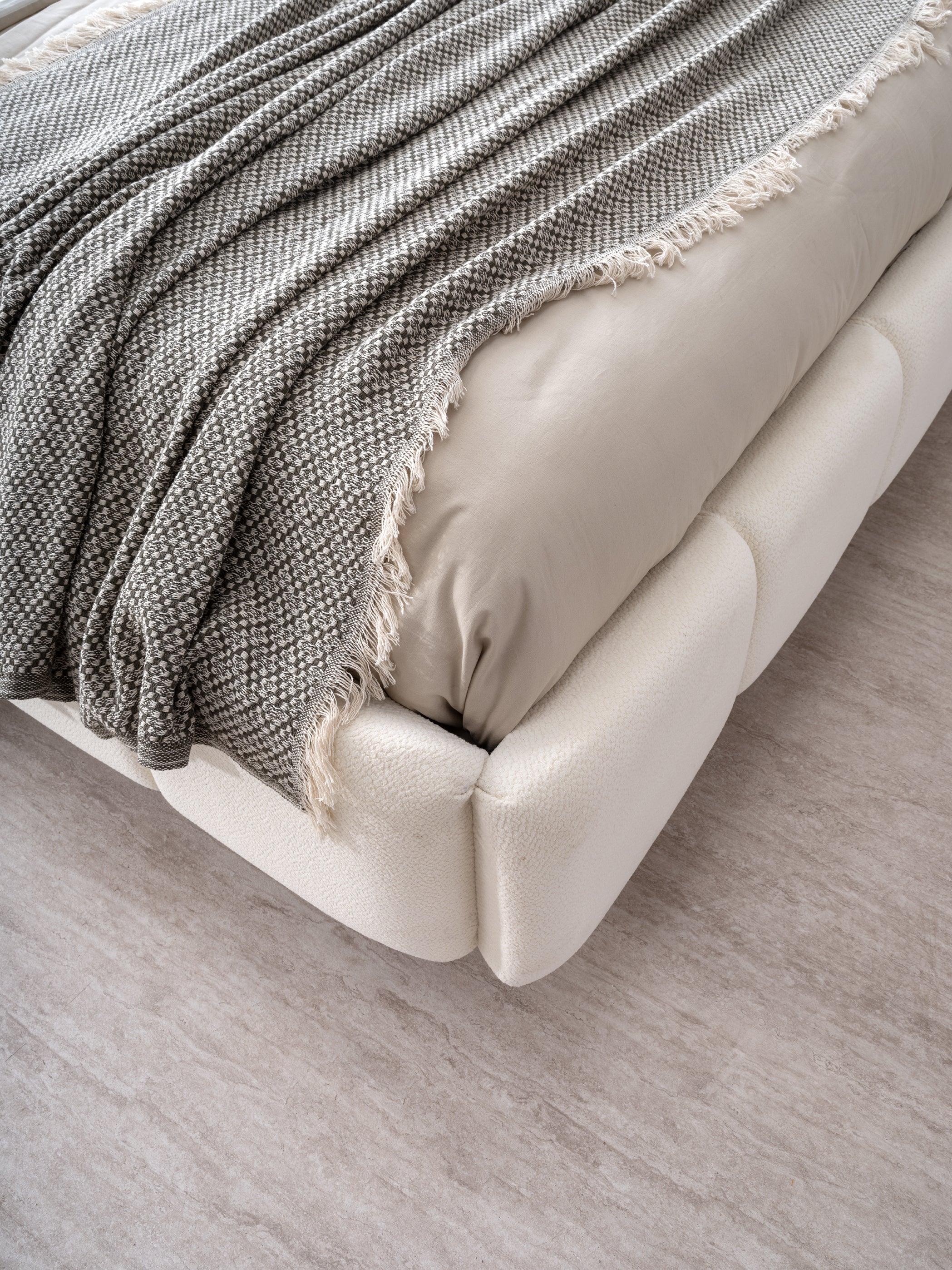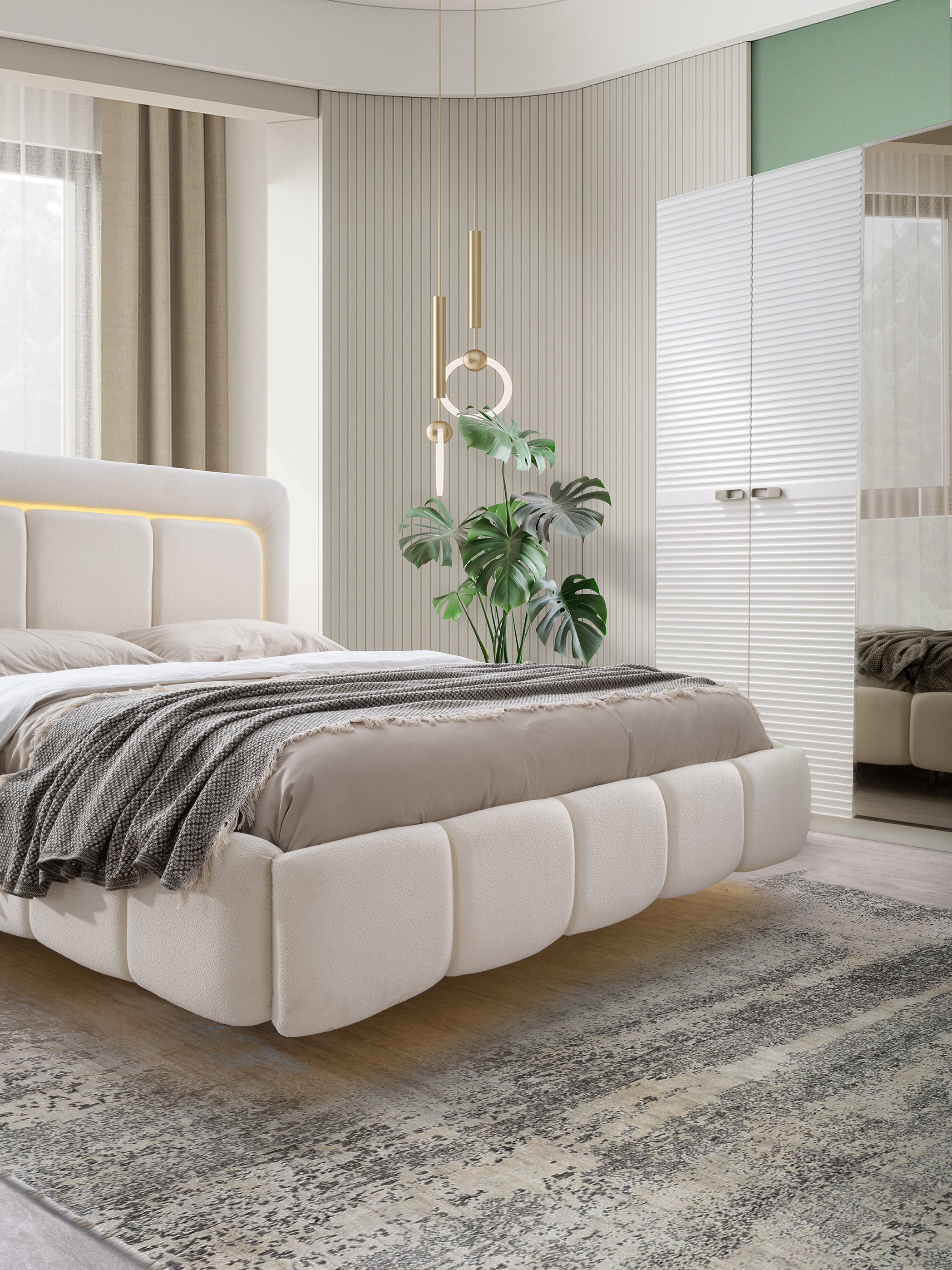 Легло ИДИЛ е проектирано да внесе спокойствие и мекота във вашата спалня. Дизайнът залага на заоблени линии и деликатни вертикални релефи, които придават на мебелите модерен, но същевременно топъл и гостоприемен вид. Високата табла е тапицирана с мека дамаска в неутрален тон, осигуряваща максимален комфорт при почивка. Нощните шкафчета следват плавните форми на леглото, създавайки завършена и хармонична визия на цялото пространство.