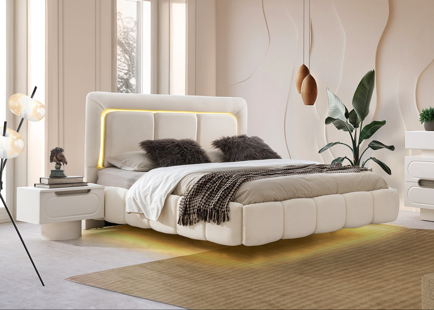 Легло СЕВИЛЯ е олицетворение на съвременната елегантност и лукс, което внася уникално арт усещане във всяка спалня. Най-впечатляващата характеристика на този модел е неговата масивна, тапицирана табла, която е стилно извита и разполага с вградено LED осветление. Тази амбиентна светлина не само подчертава меките форми на леглото, но и създава неповторим уют и изискана атмосфера в стаята. Овалните линии и стилните метални акценти придават на модела завършен и луксозен вид.