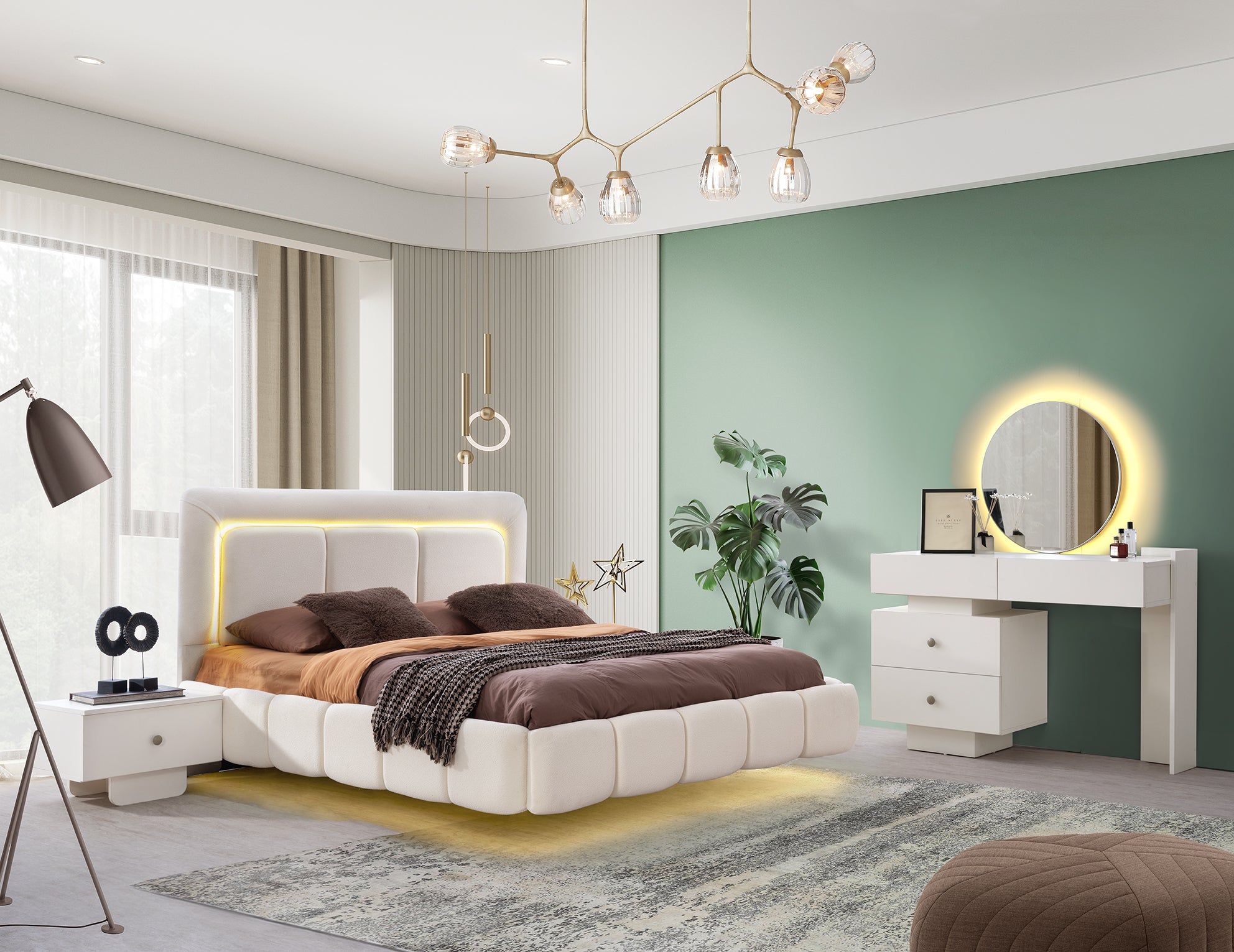 Акценти: Тапицирана табла с LED осветление, Огледала с арки на гардероба, Гланцови/Светли покрития.