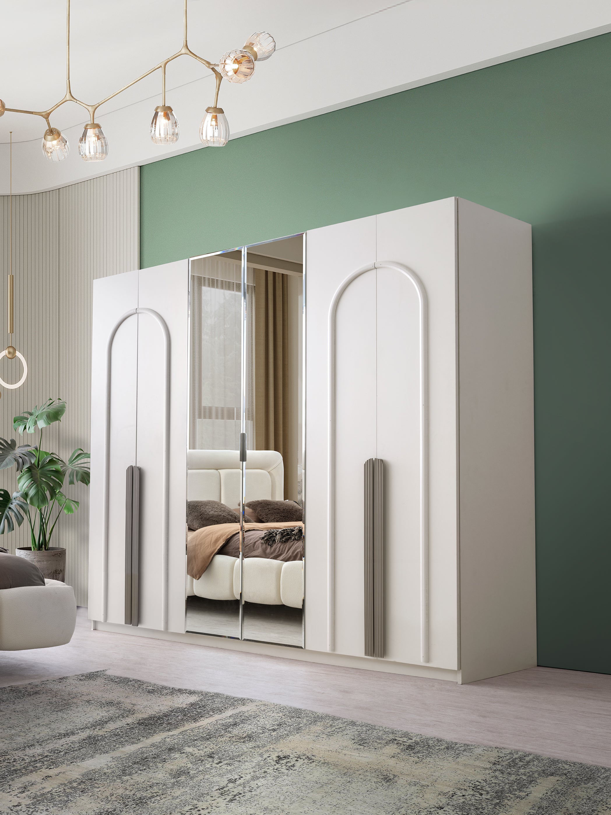 Акцентът пада върху внушителната тапицирана табла на леглото, която често включва дискретно LED осветление за създаване на уютна атмосфера. Гардеробът е с голям обем и впечатляващи огледални врати, обрамчени от стилни арки, които придават изискан вид и визуално разширяват стаята. Комплектът е завършен с модерно проектирани нощни шкафчета и тоалетка.