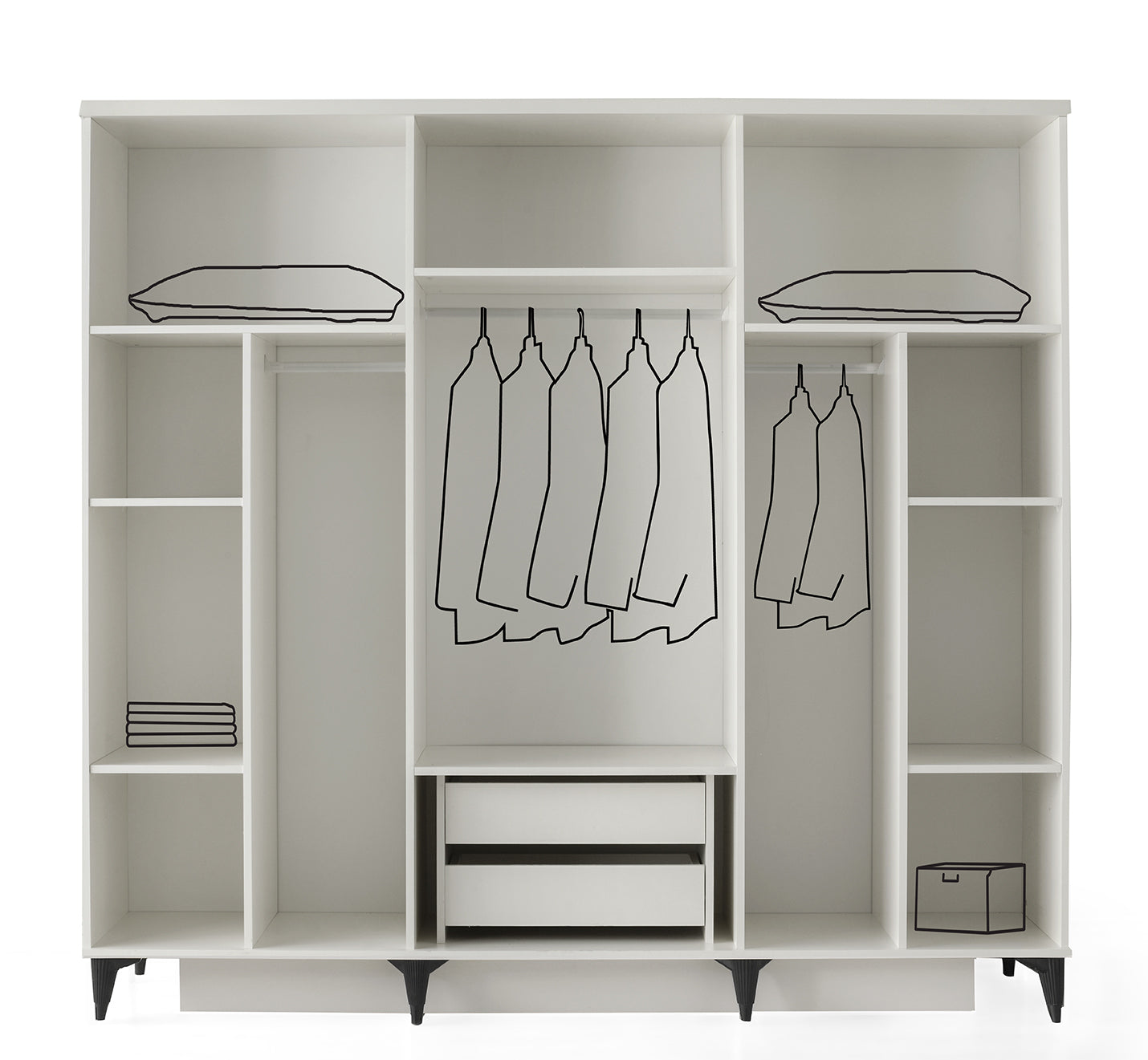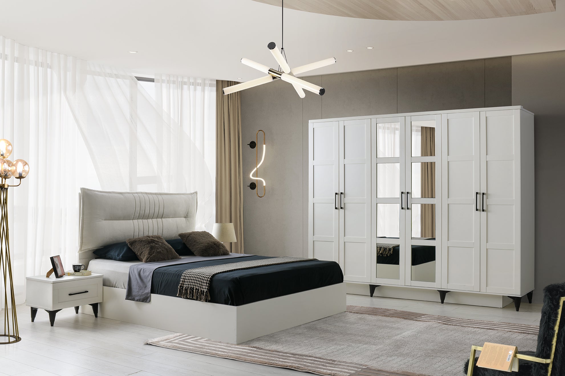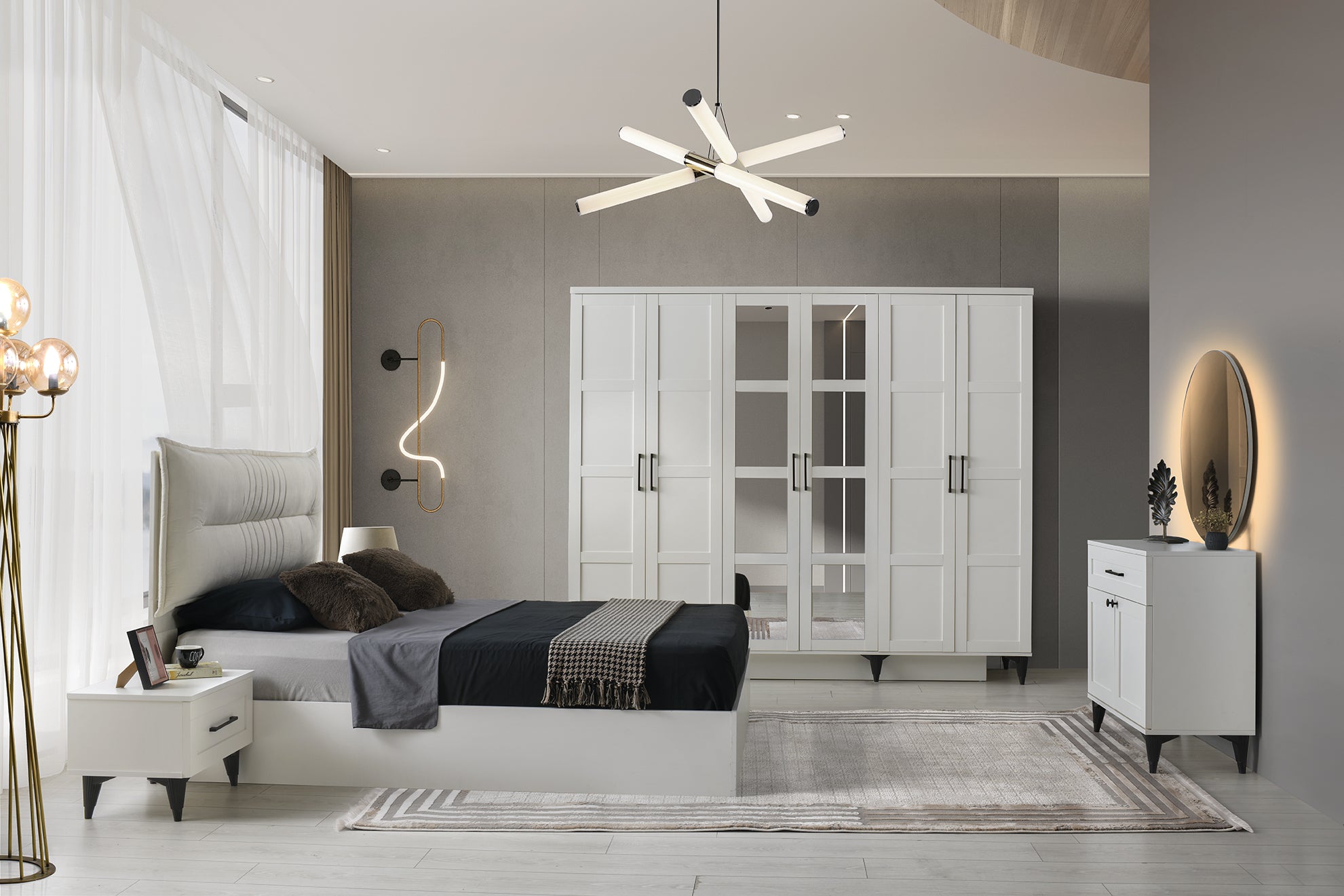 Стилен гардероб: Големият гардероб със своите гланцови врати и огледални панели е изключително практичен и същевременно елегантен. Той предлага изобилие от място за съхранение на дрехи и аксесоари.