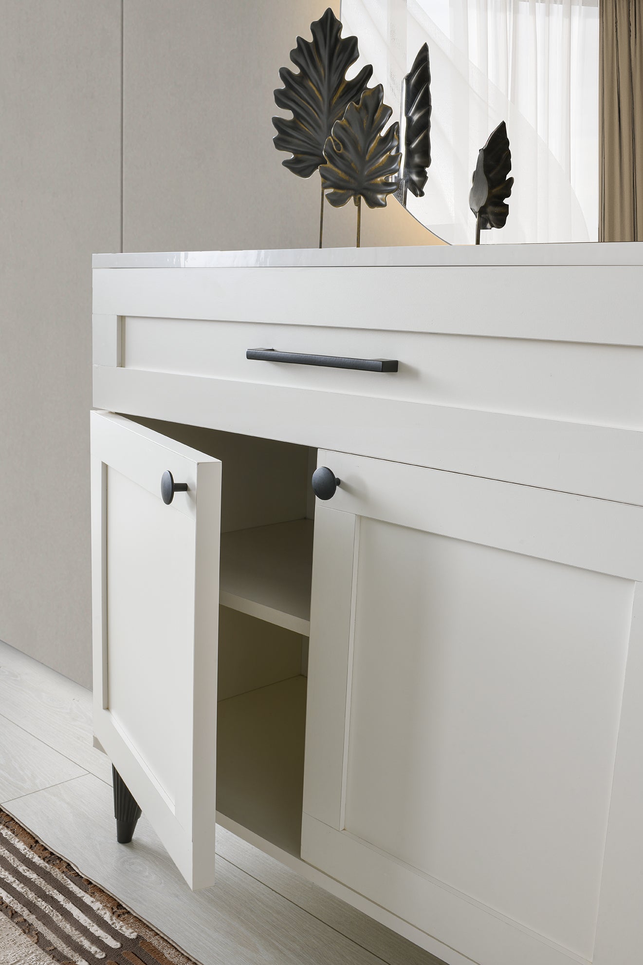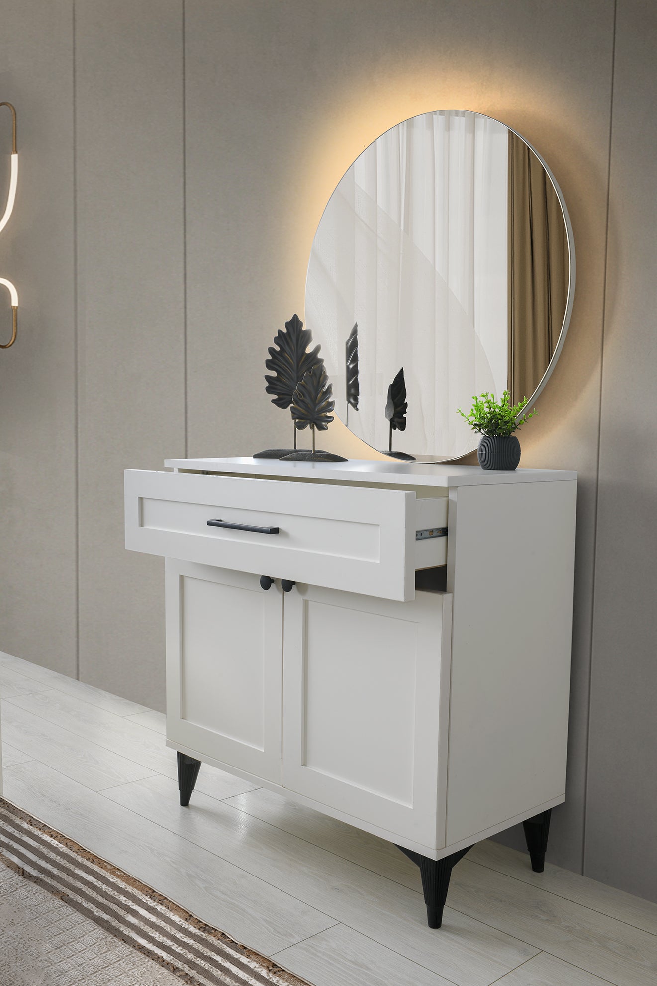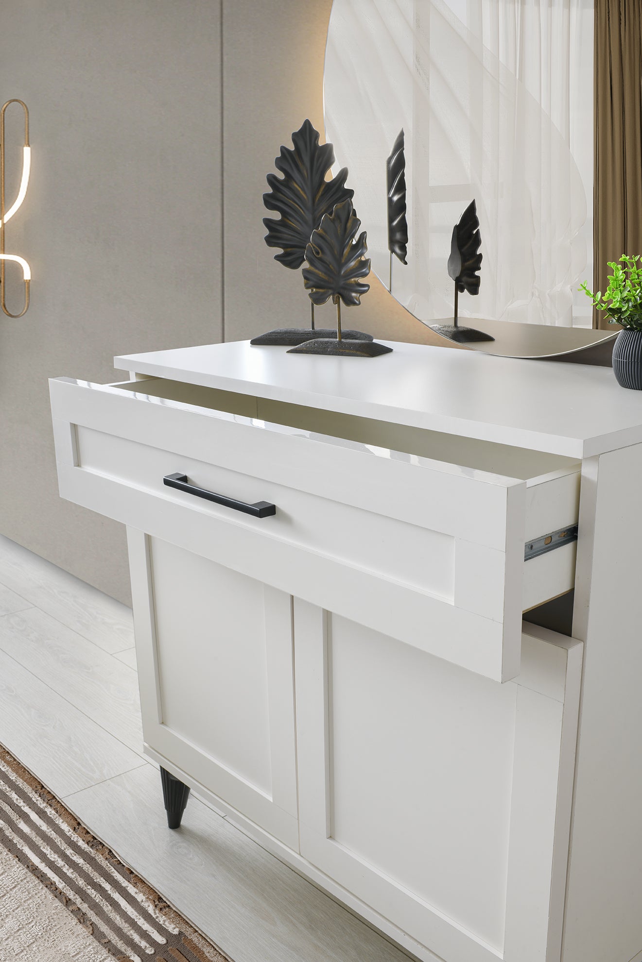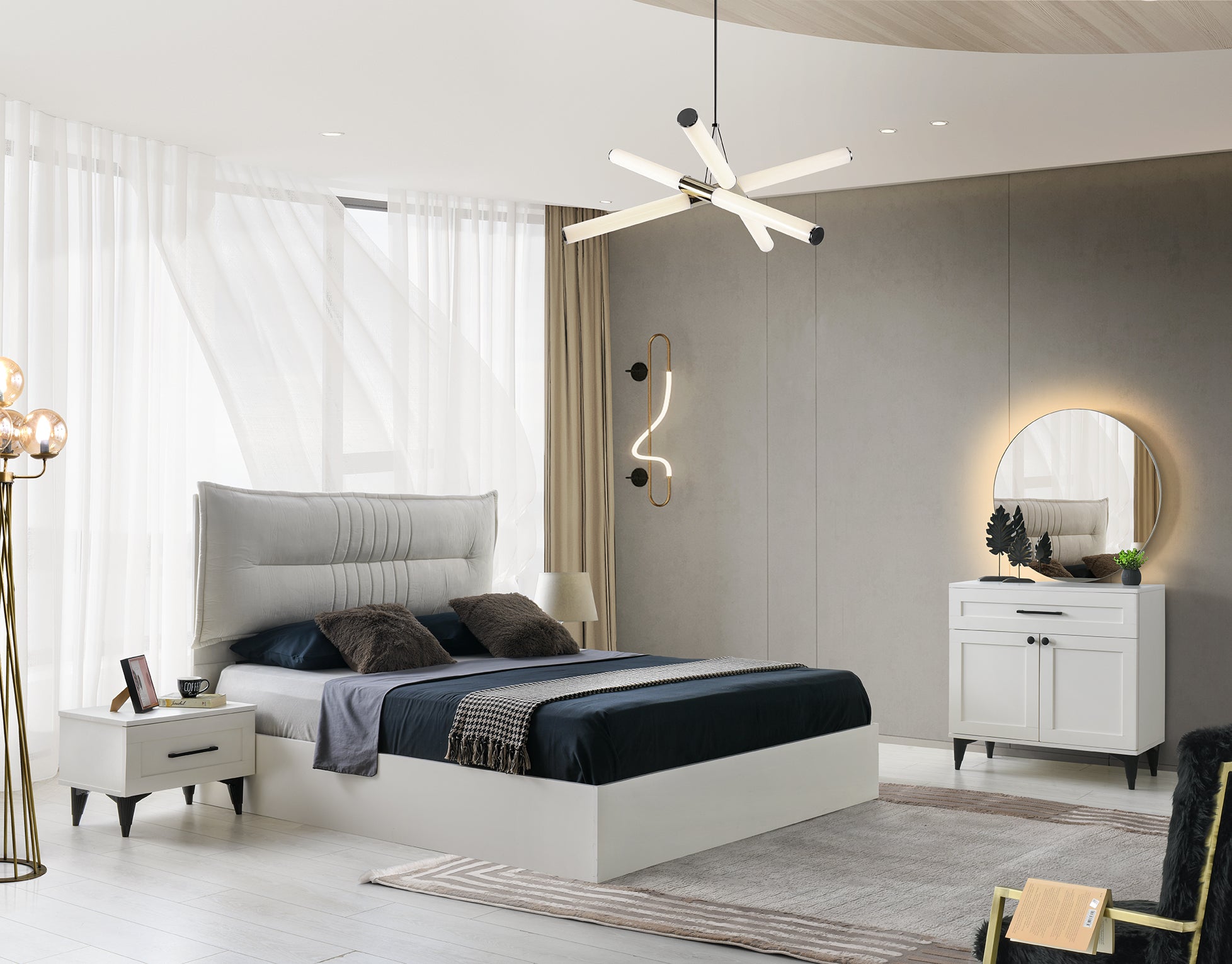 Функционална тоалетка: Тоалетката с голямо огледало и практични чекмеджета е идеална за сутрешните ритуали. Златните дръжки и дървесни елементи добавят топлина и хармония към цялостния дизайн.