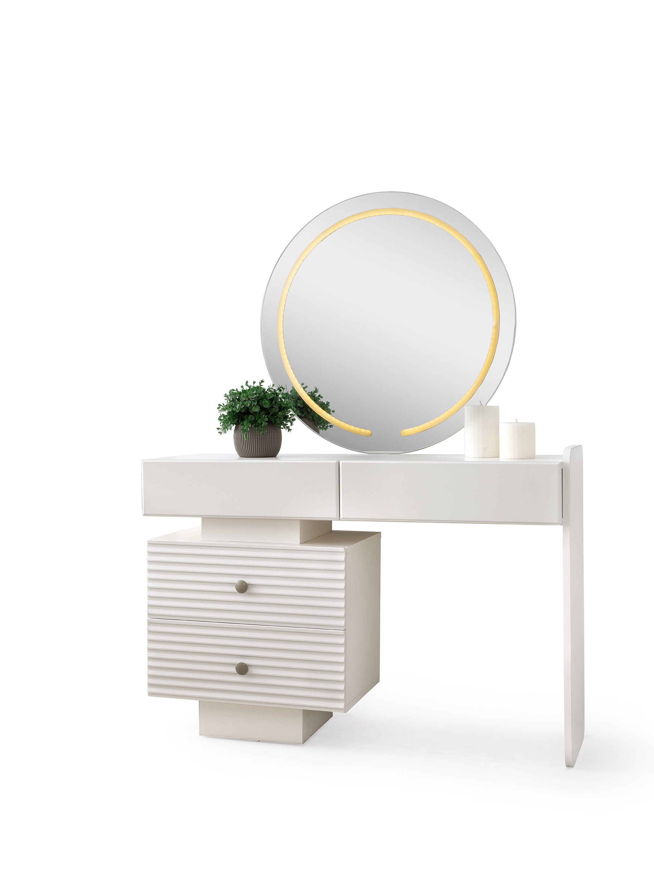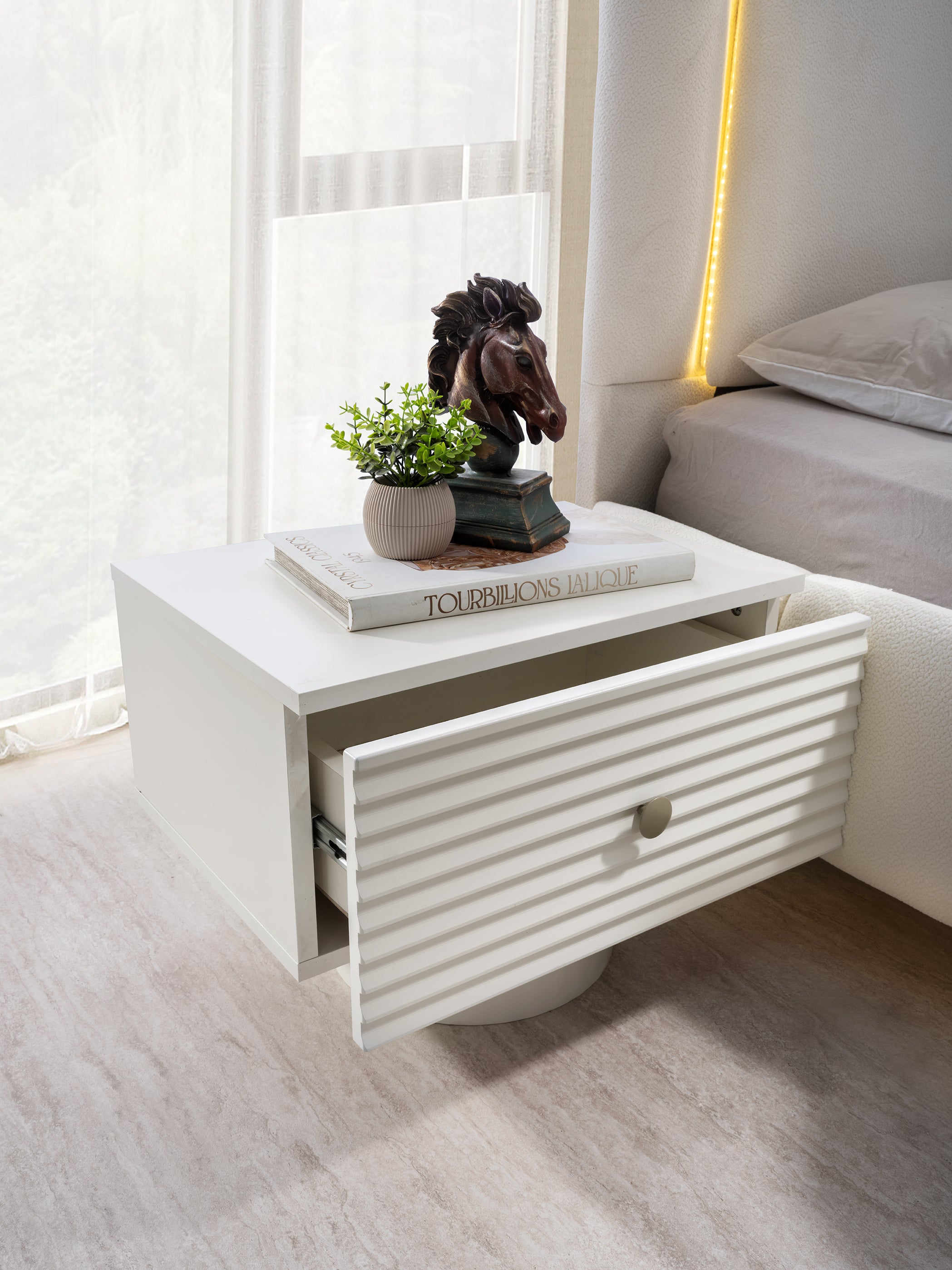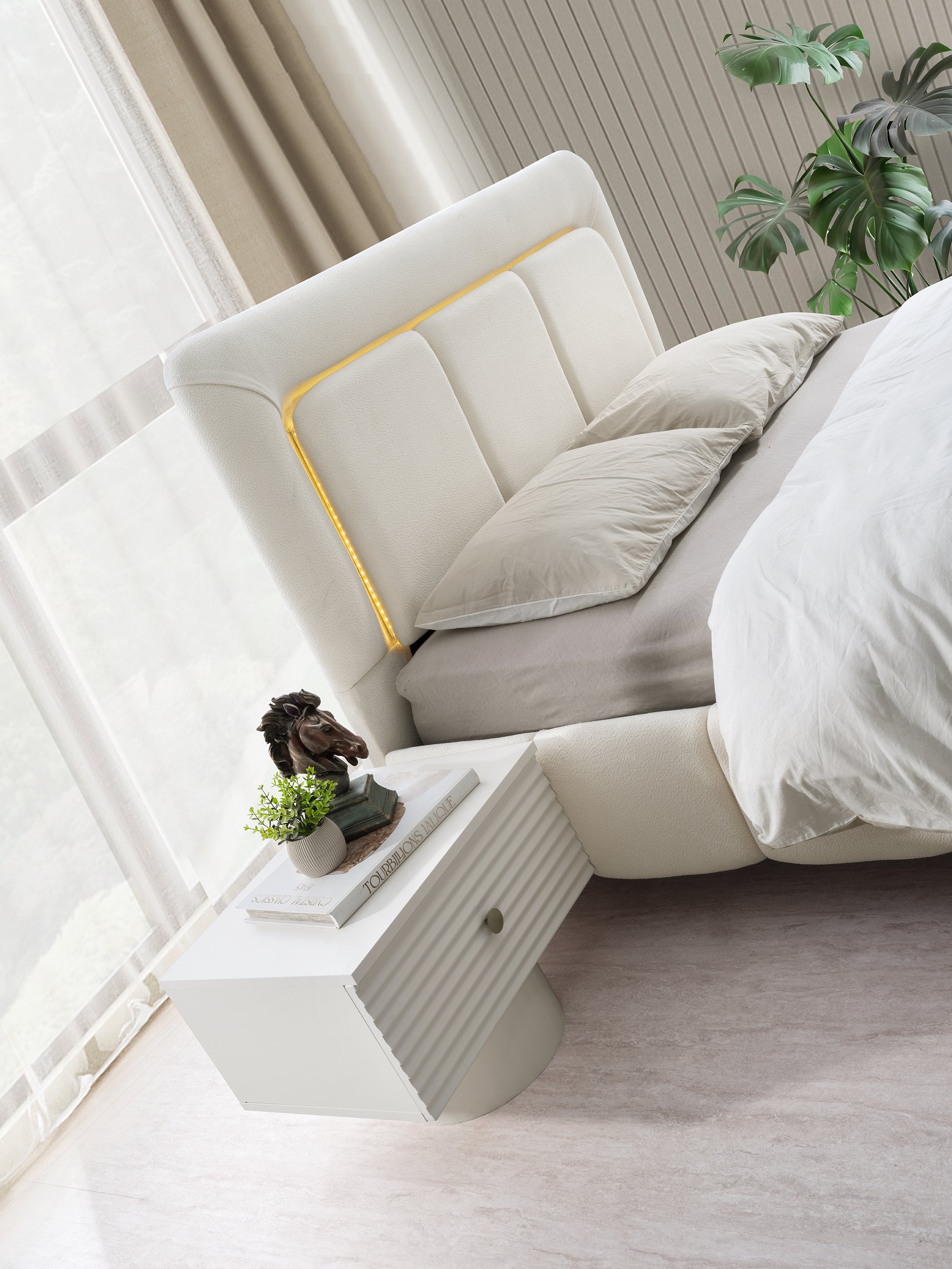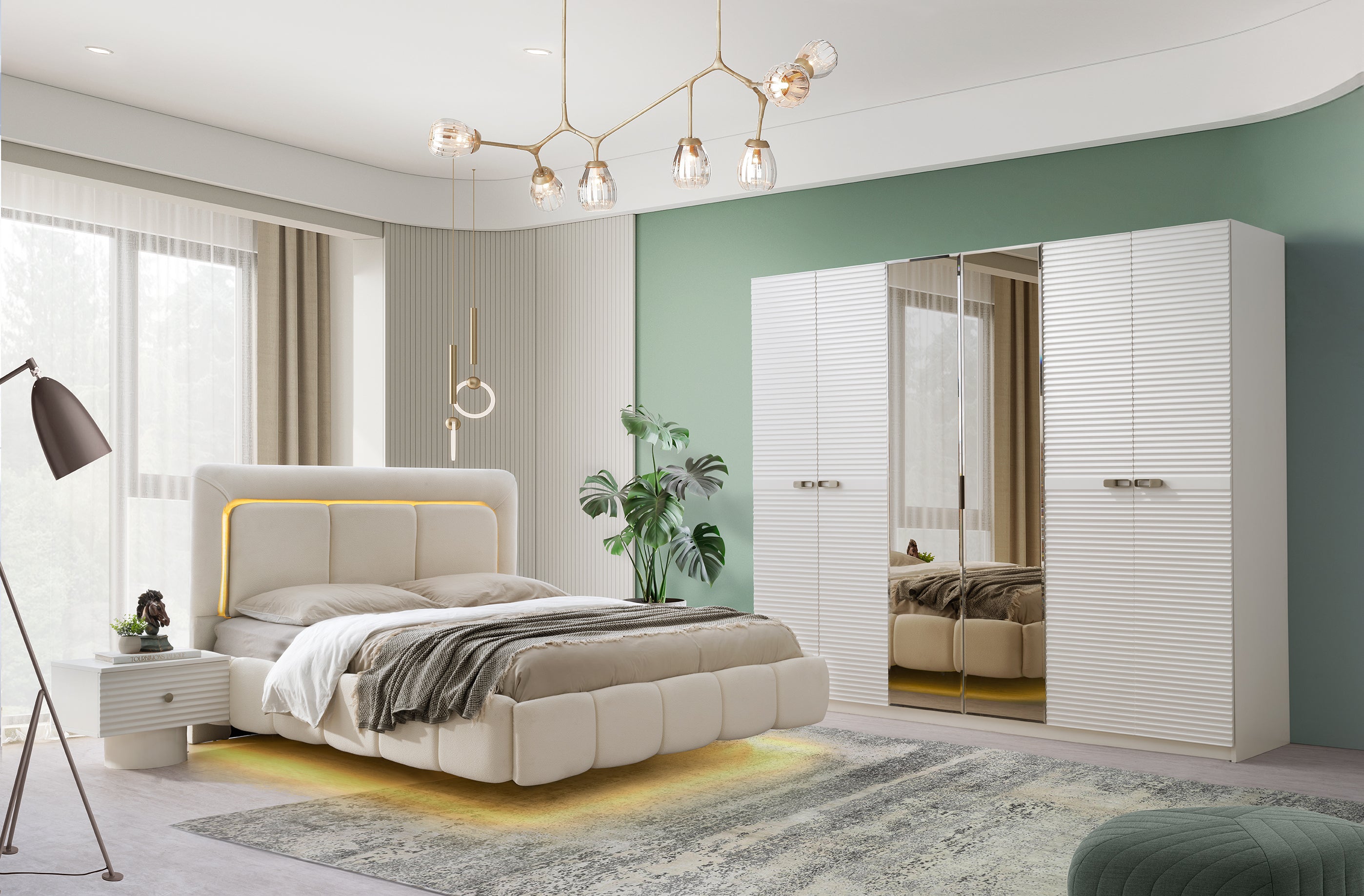 Леглото е с масивна, тапицирана табла с елегантни извивки и вградено LED осветление по контура, което създава топъл и уютен ореол. Гардеробът е с голям капацитет и има огледални врати, като релефните вълнообразни декорации по вратите придават дълбочина и уникален артистичен вид. Нощните шкафчета и тоалетката също следват овалната линия на дизайна.