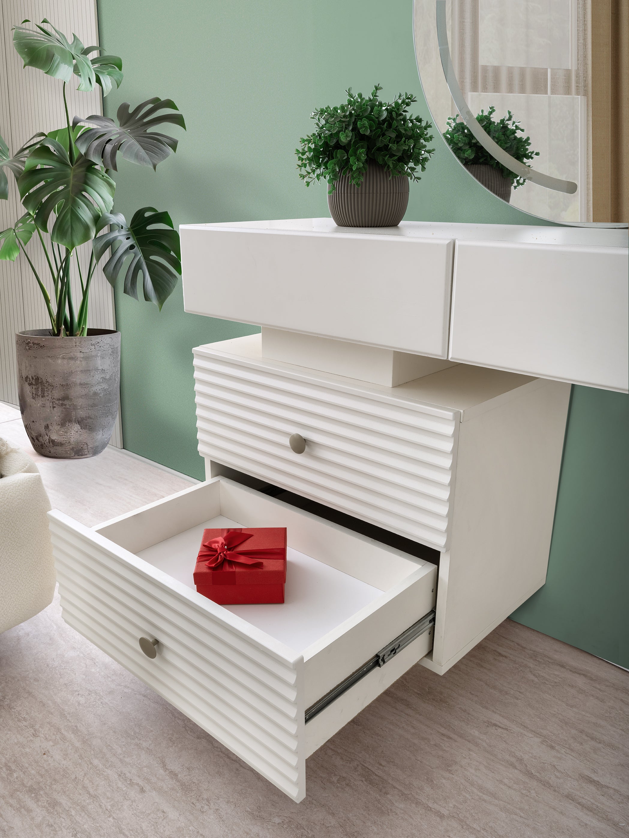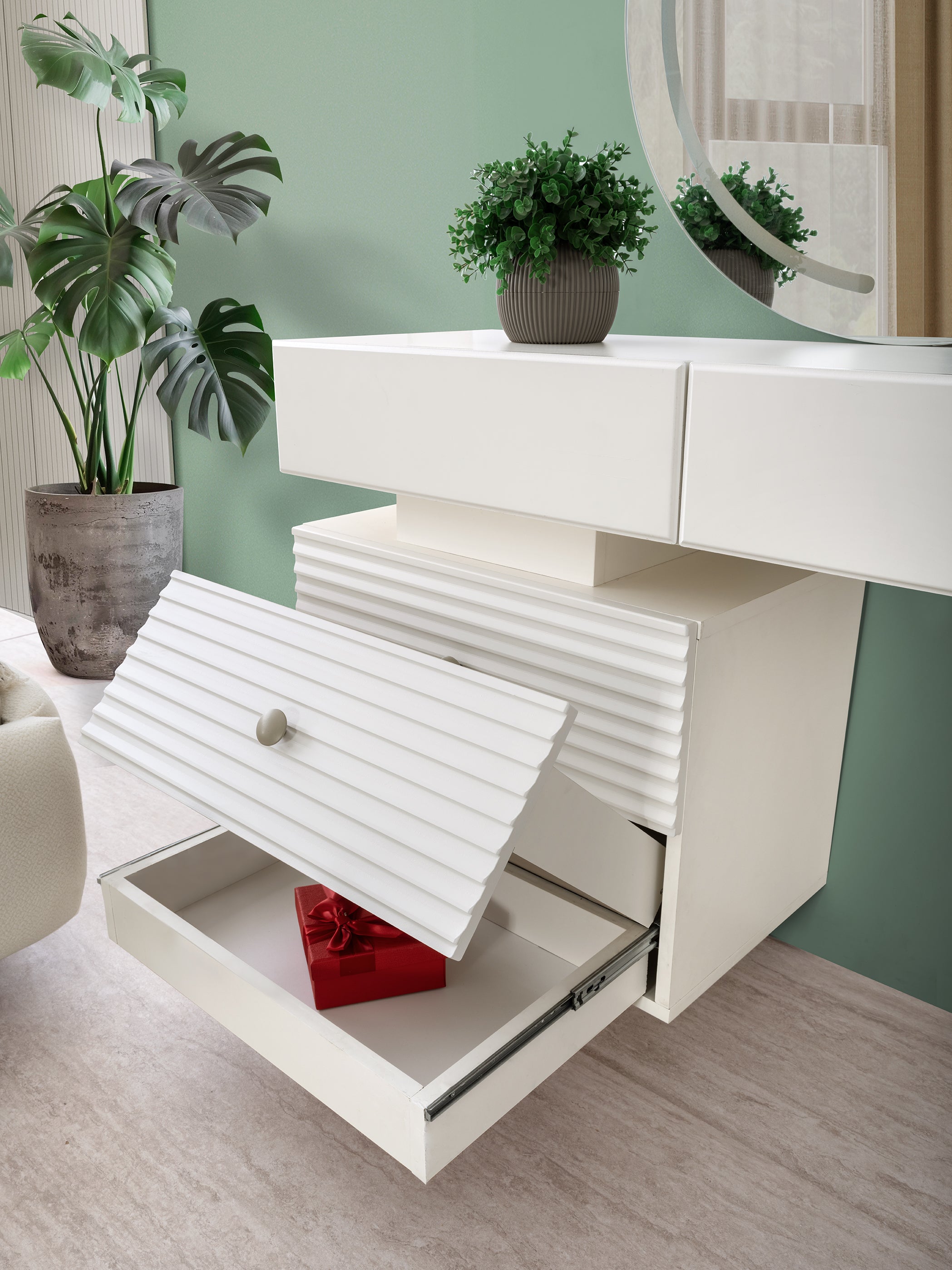 Материал: Целият комплект е изработен от висококачествено MDF (МДФ), което гарантира отлична здравина, стабилност и луксозен завършек.