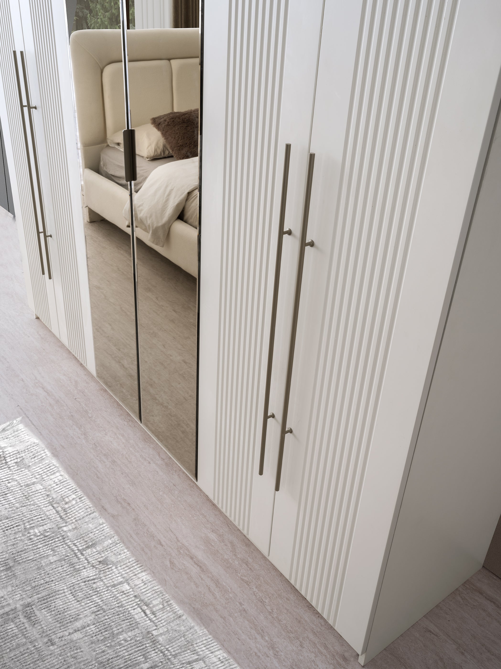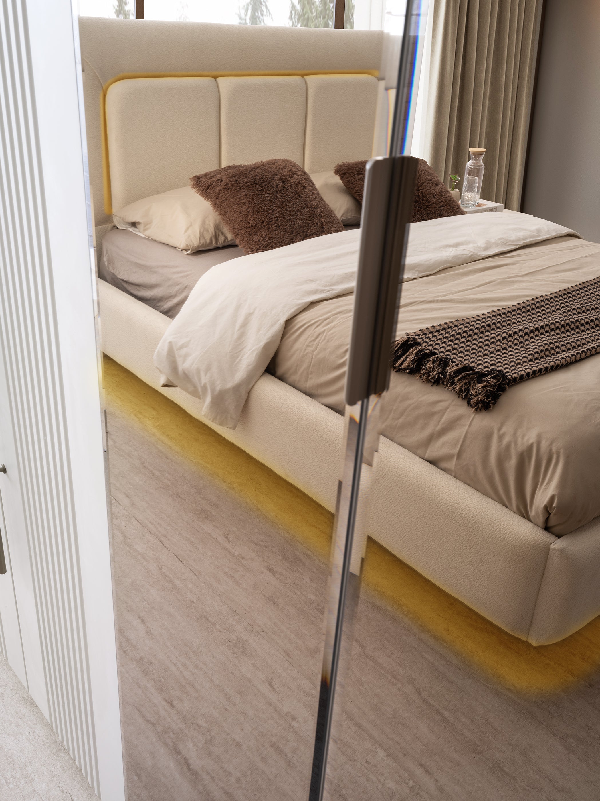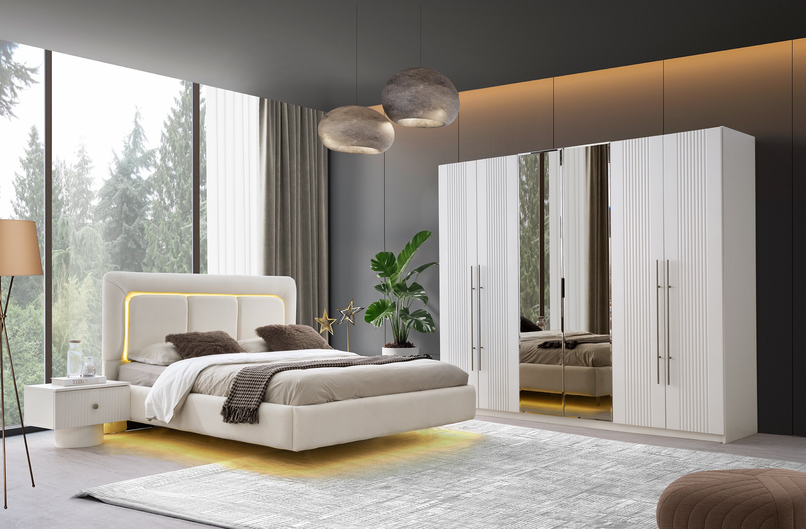 Леглото е с масивна, тапицирана табла с геометрична шарка, стилно подчертана с вградено LED осветление по контура, създаващо мек и уютен акцент. Гардеробът е с голям обем и има огледални врати, които редуват гладки и релефни повърхности. Този комплект е идеален за тези, които търсят практичност, висок стил и качествена изработка.