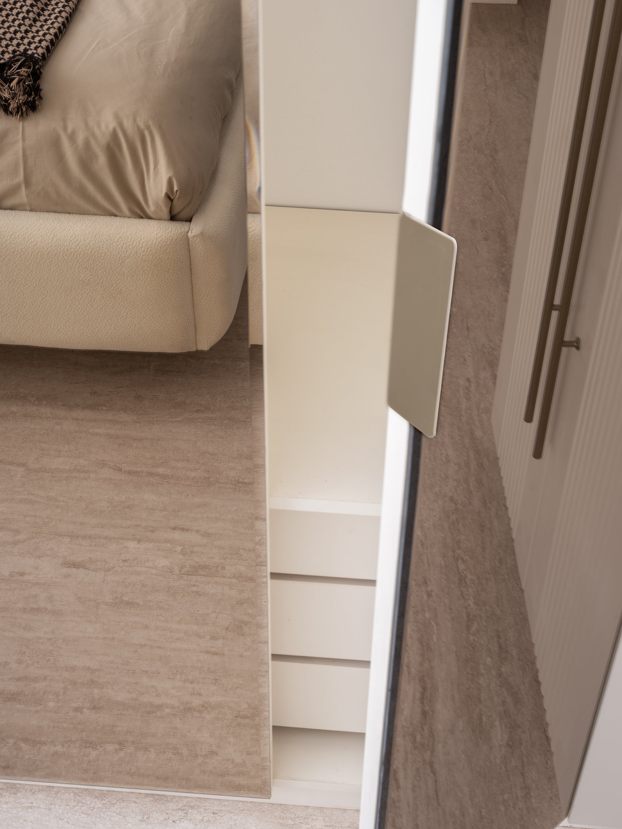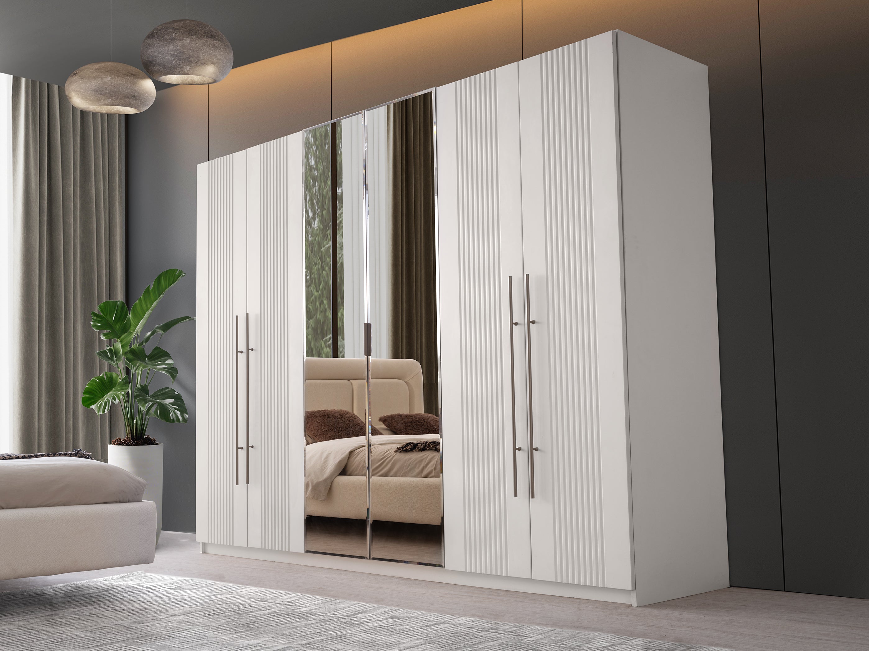 Спален комплект ИСТАНБУЛ съчетава модерна елегантност с класически комфорт. Дизайнът се отличава с изчистени, правоъгълни форми и вертикални релефни линии по вратите на гардероба, които придават дълбочина и изтънченост на визията.