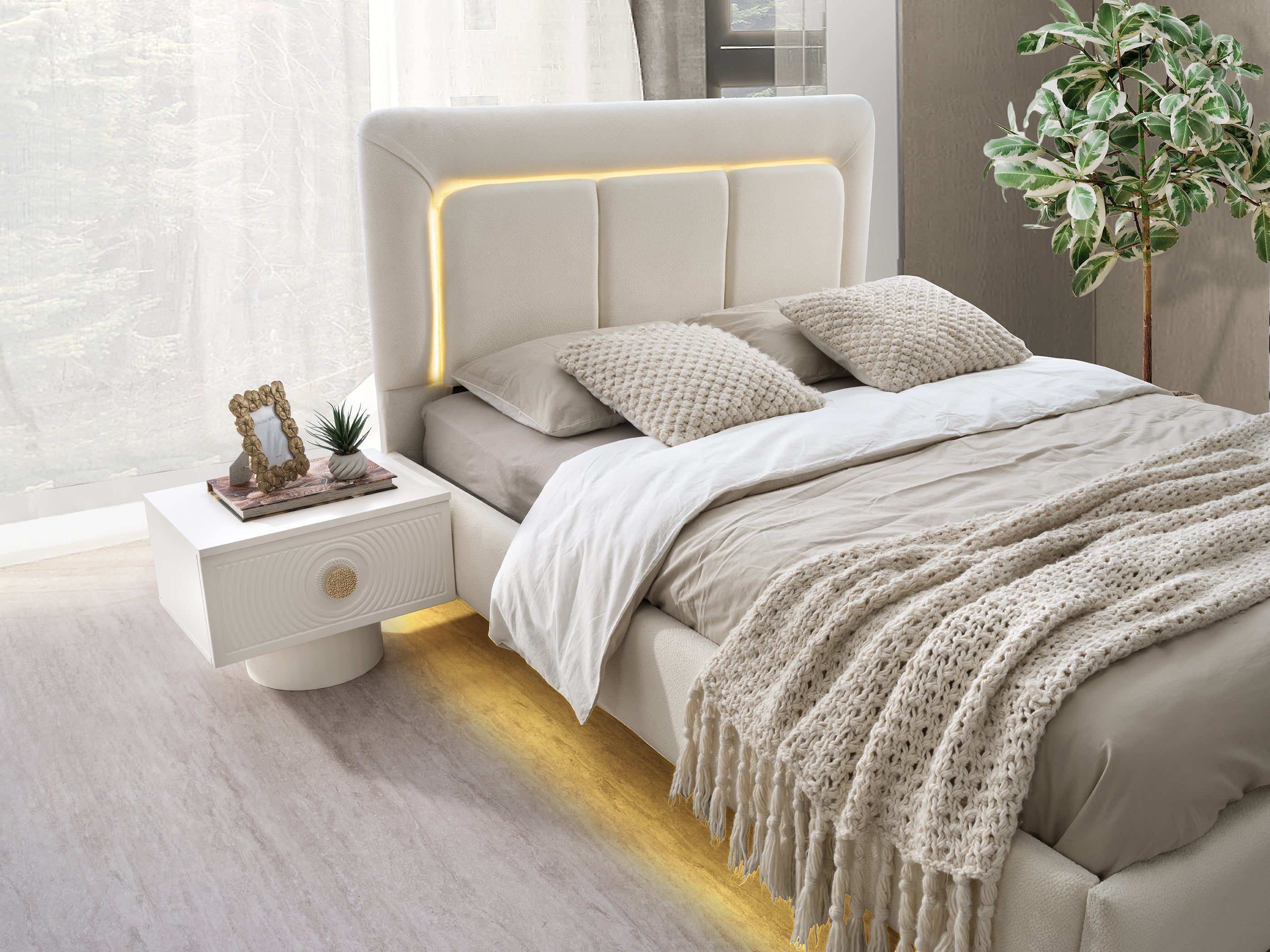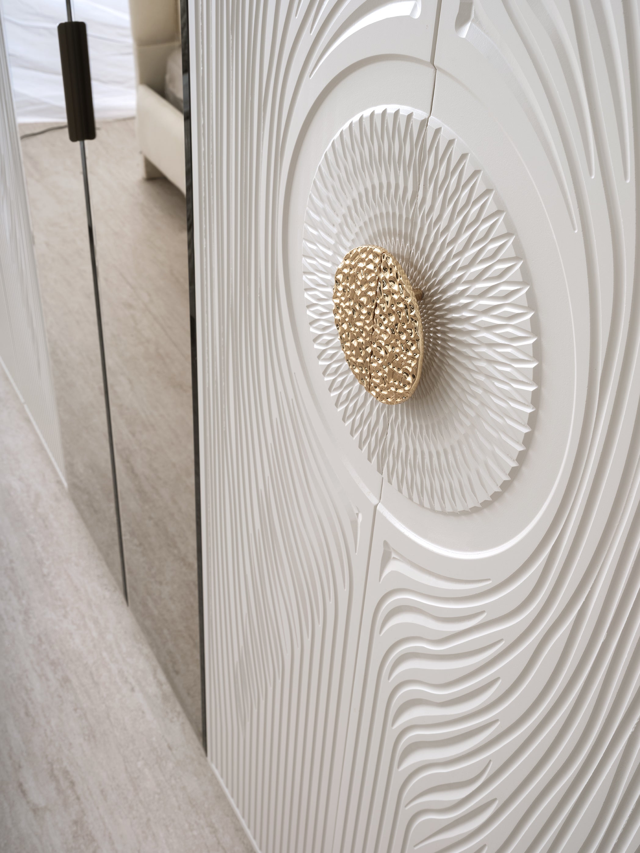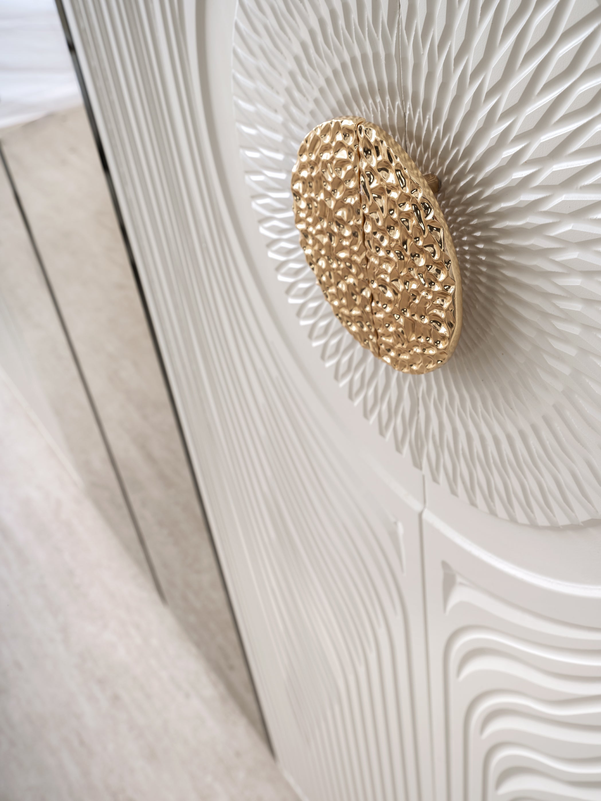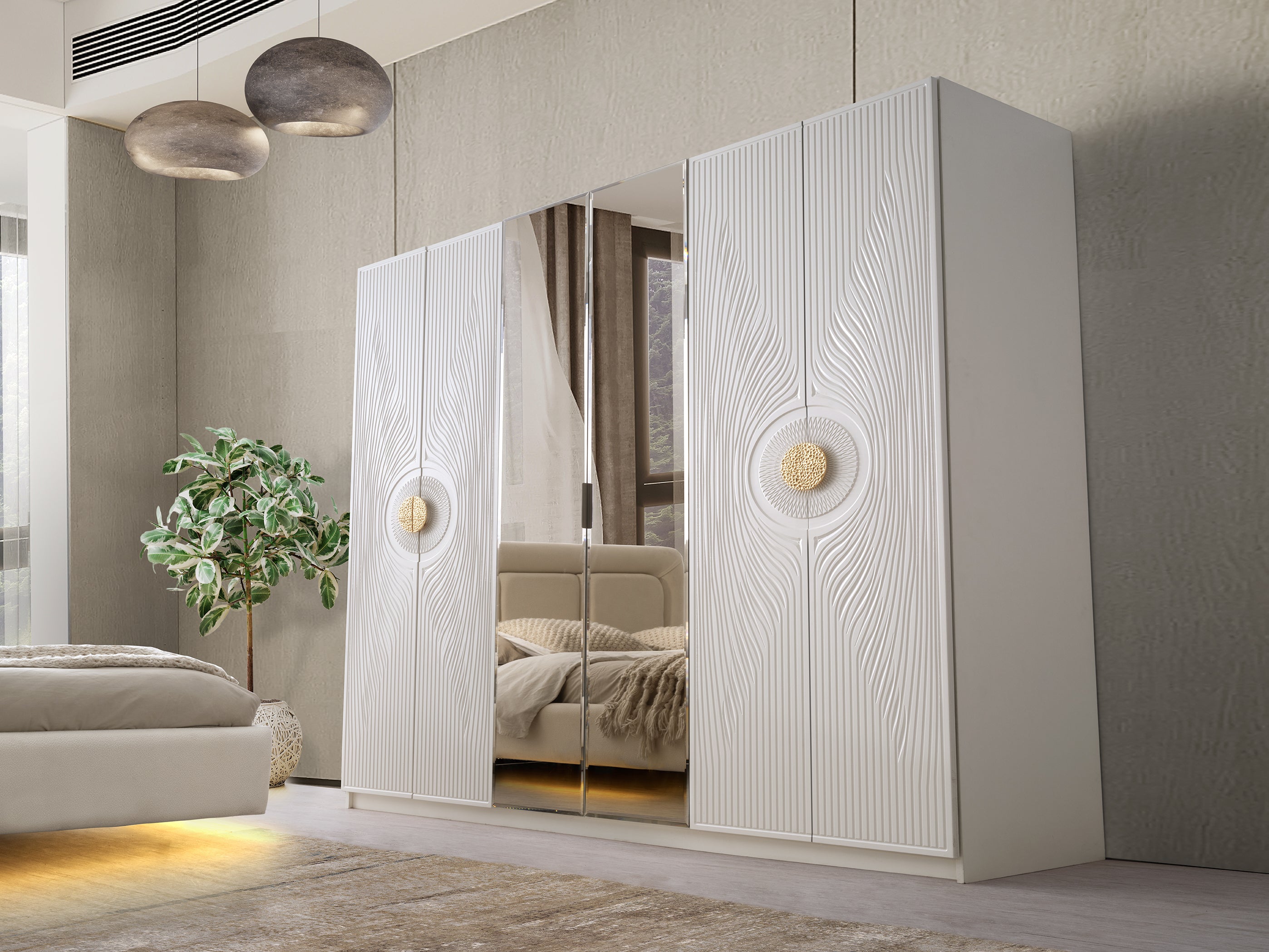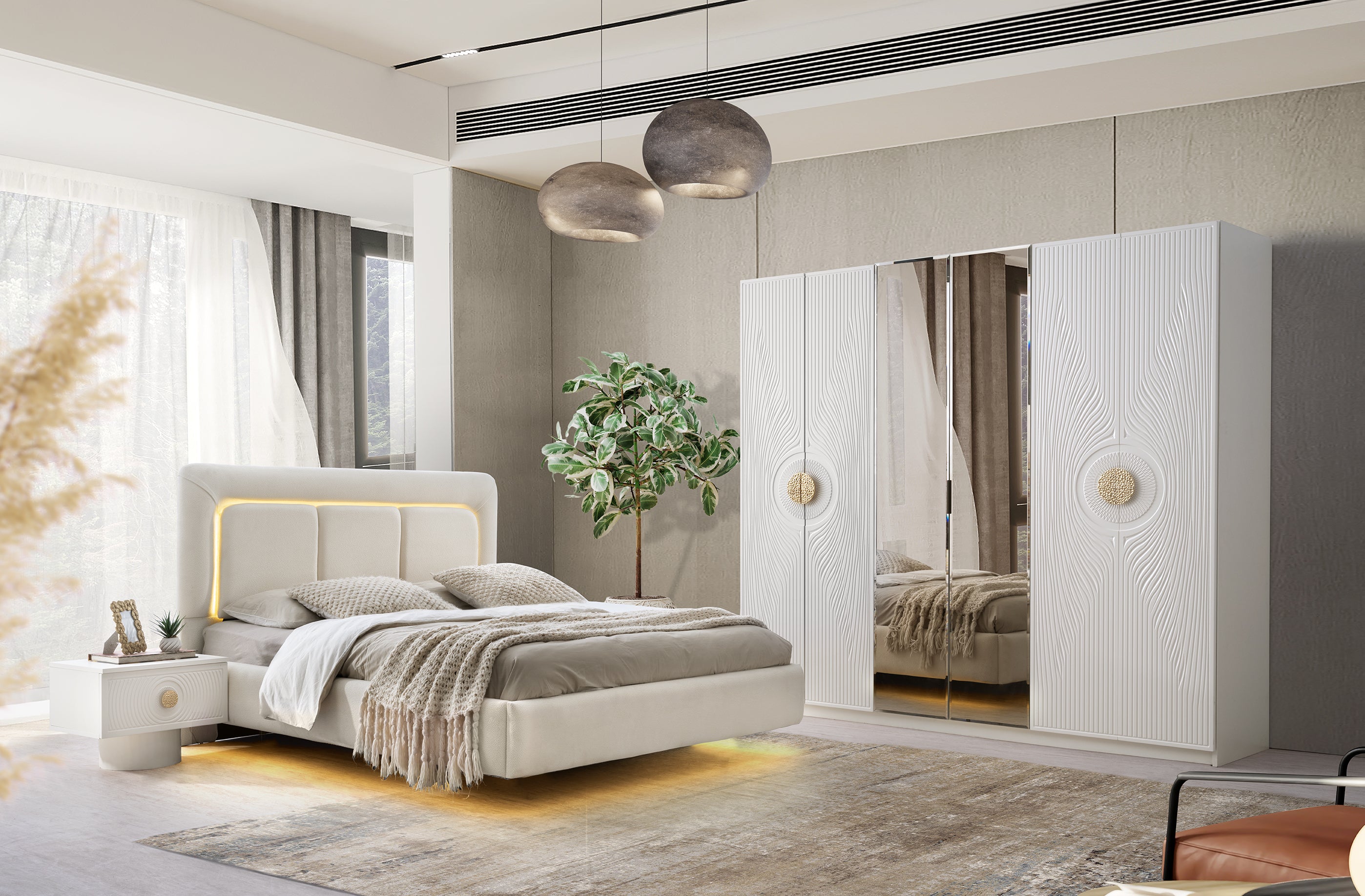 Леглото е с масивна, тапицирана табла със заоблени ъгли, която е ефектно подчертана от вградено LED осветление по контура. Гардеробът е с голям обем и има огледални врати, като релефната, вълнообразна декорация и впечатляващите кръгли златни/месингови дръжки придават луксозен и отличителен вид. Този комплект съчетава практичност с високо ниво на естетика.