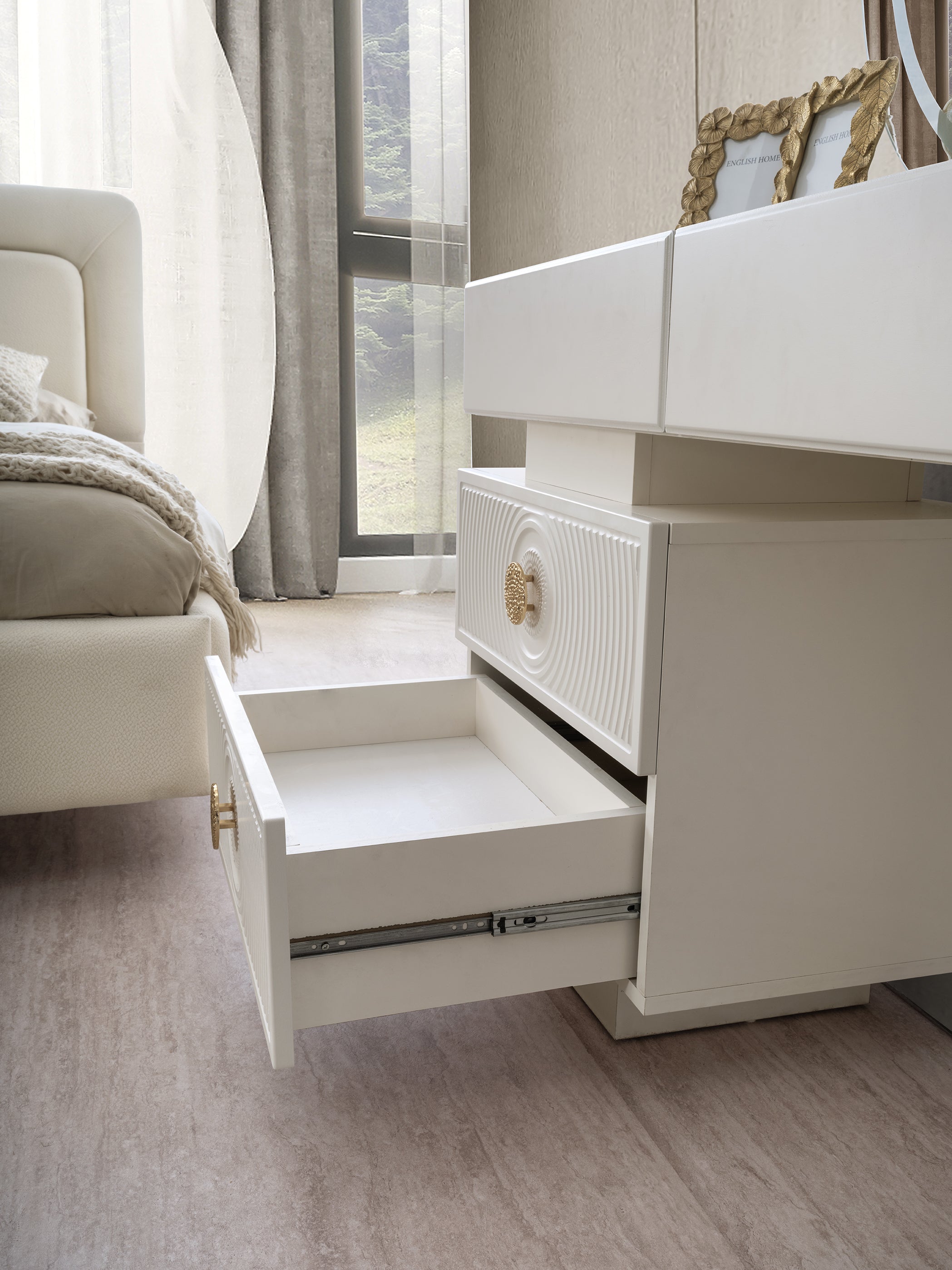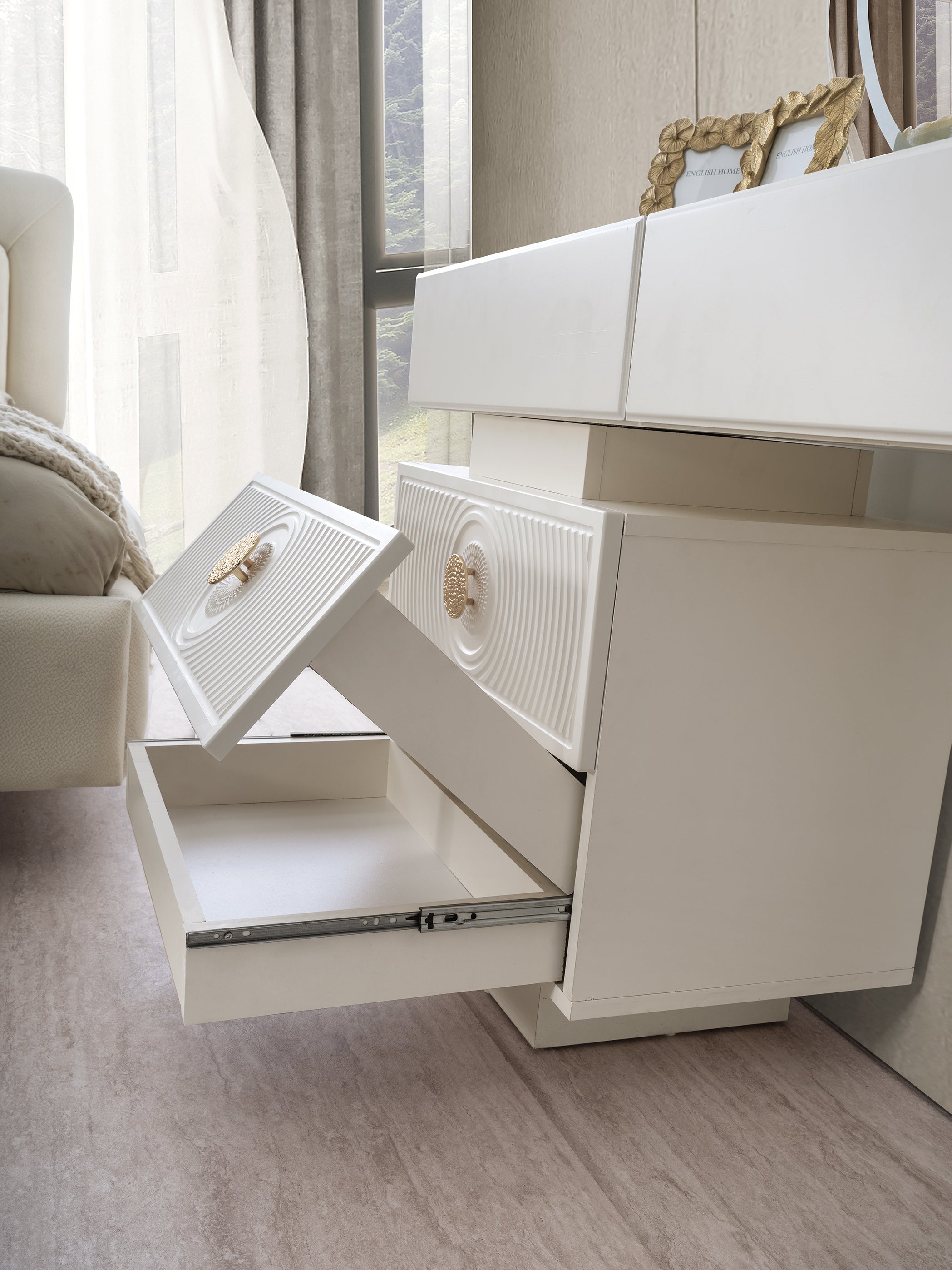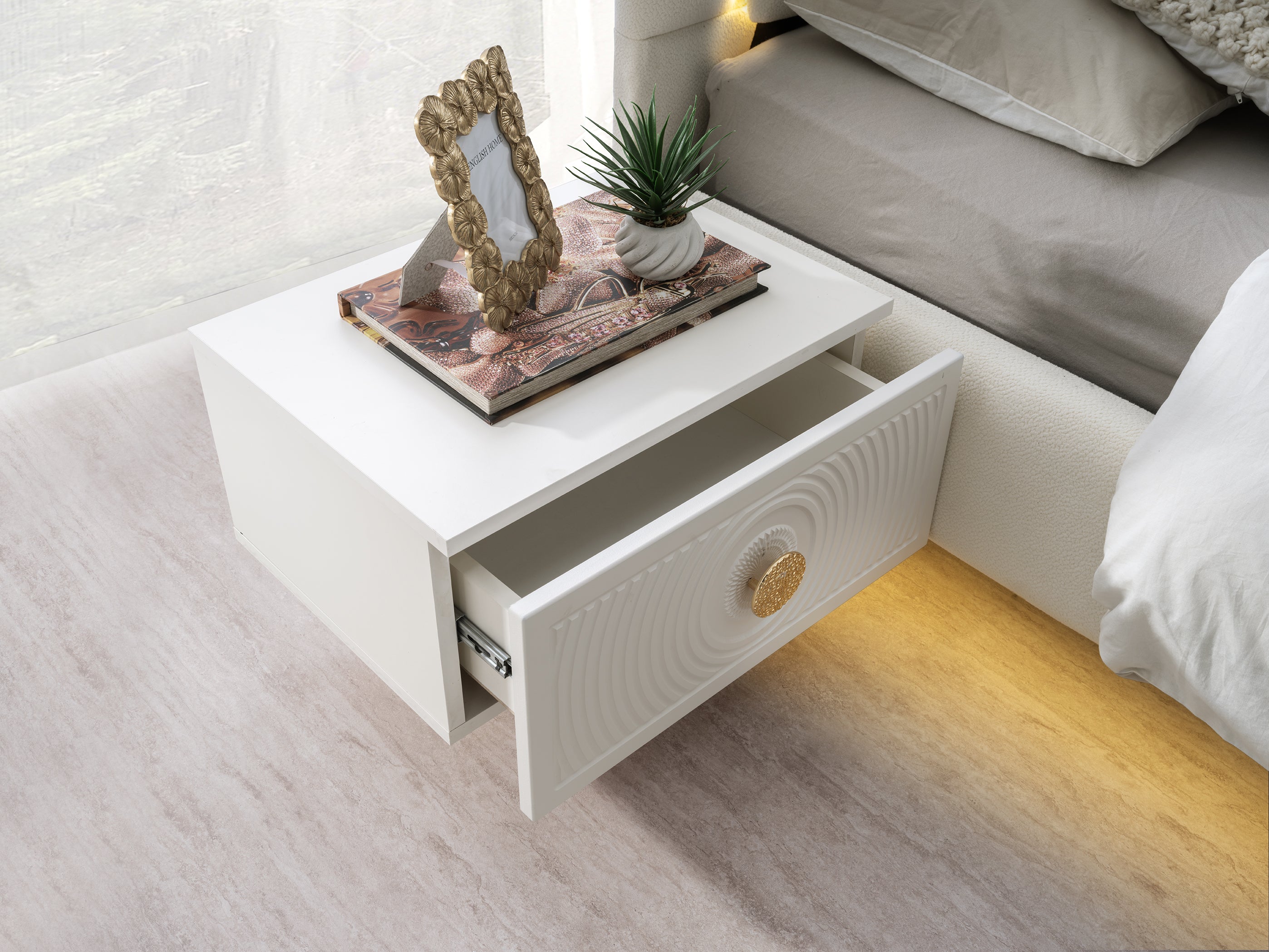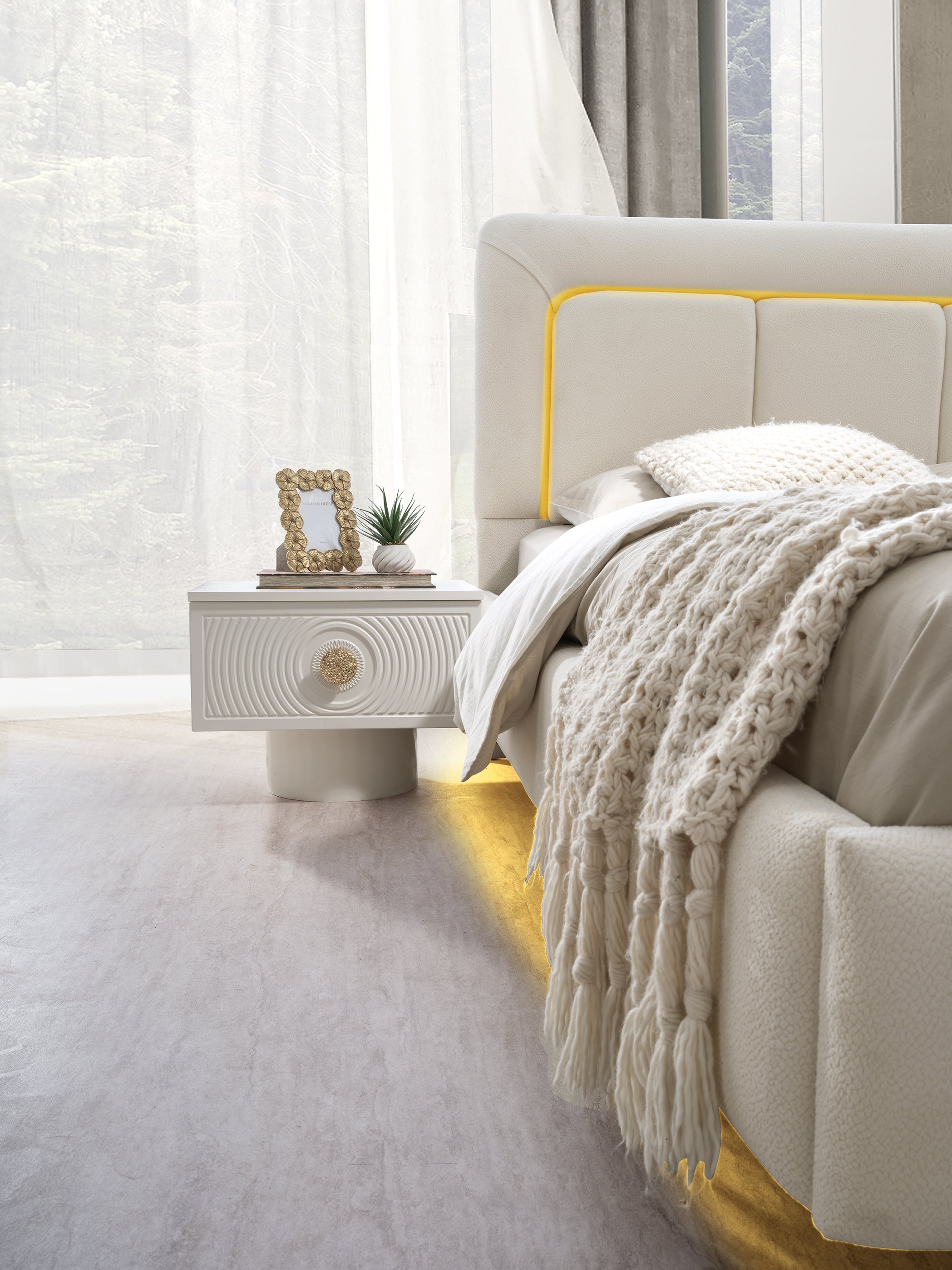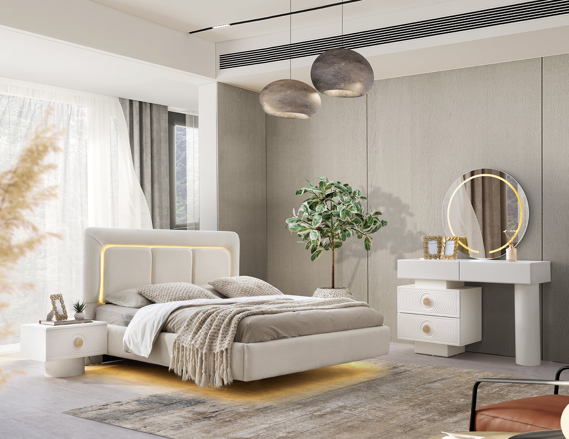 Леглото е с масивна, тапицирана табла със заоблени ъгли, която е ефектно подчертана от вградено LED осветление по контура. Гардеробът е с голям обем и има огледални врати, като релефната, вълнообразна декорация и впечатляващите кръгли златни/месингови дръжки придават луксозен и отличителен вид. Този комплект съчетава практичност с високо ниво на естетика.