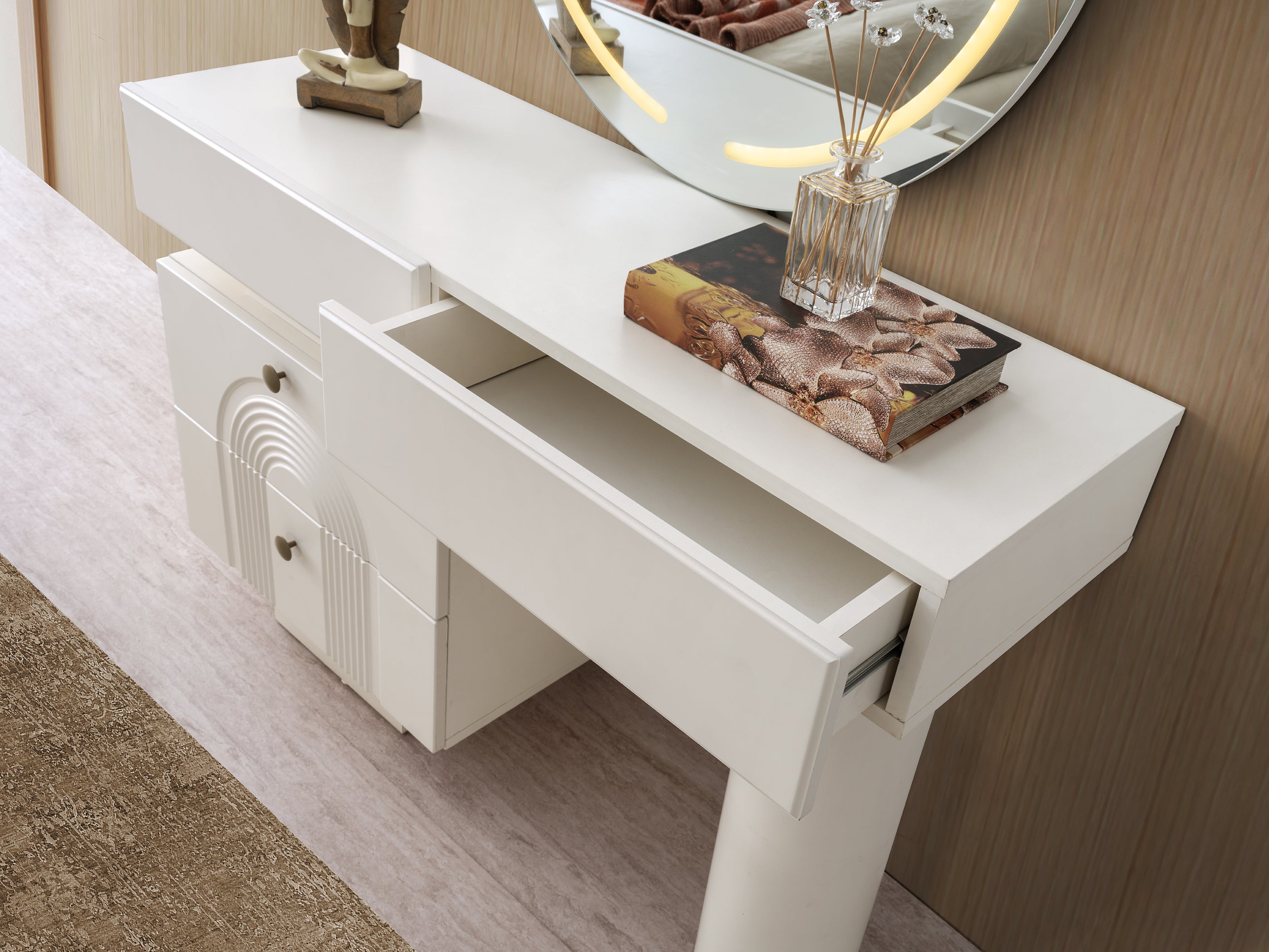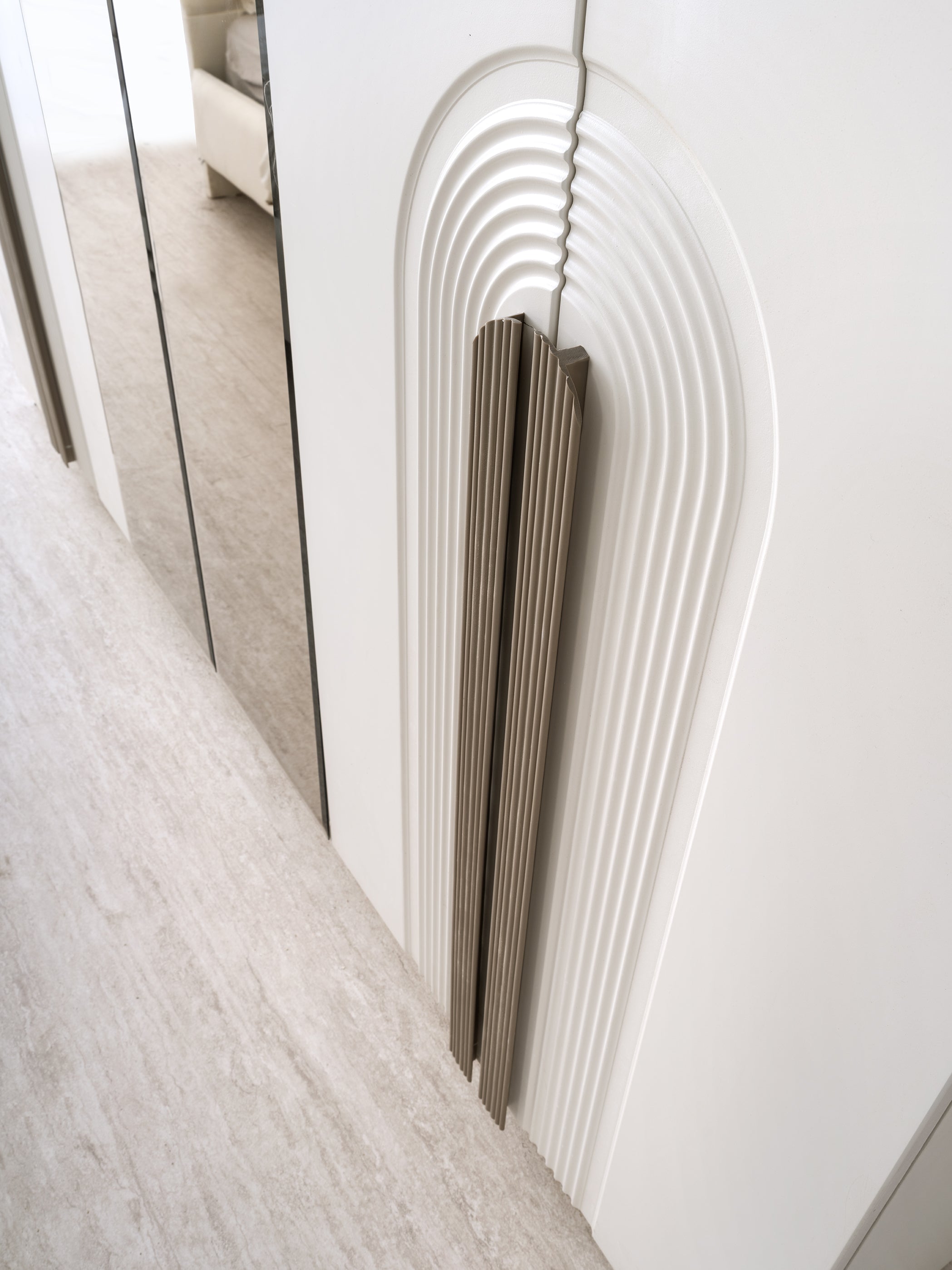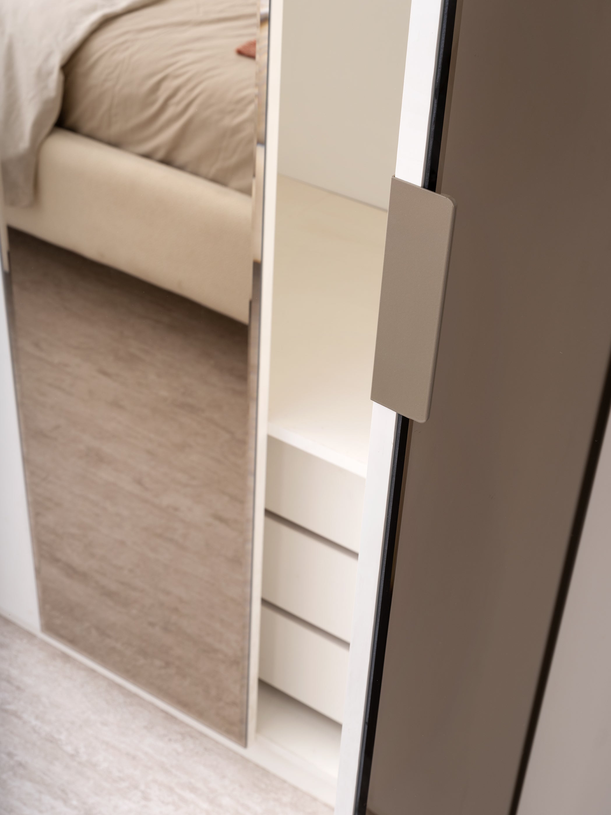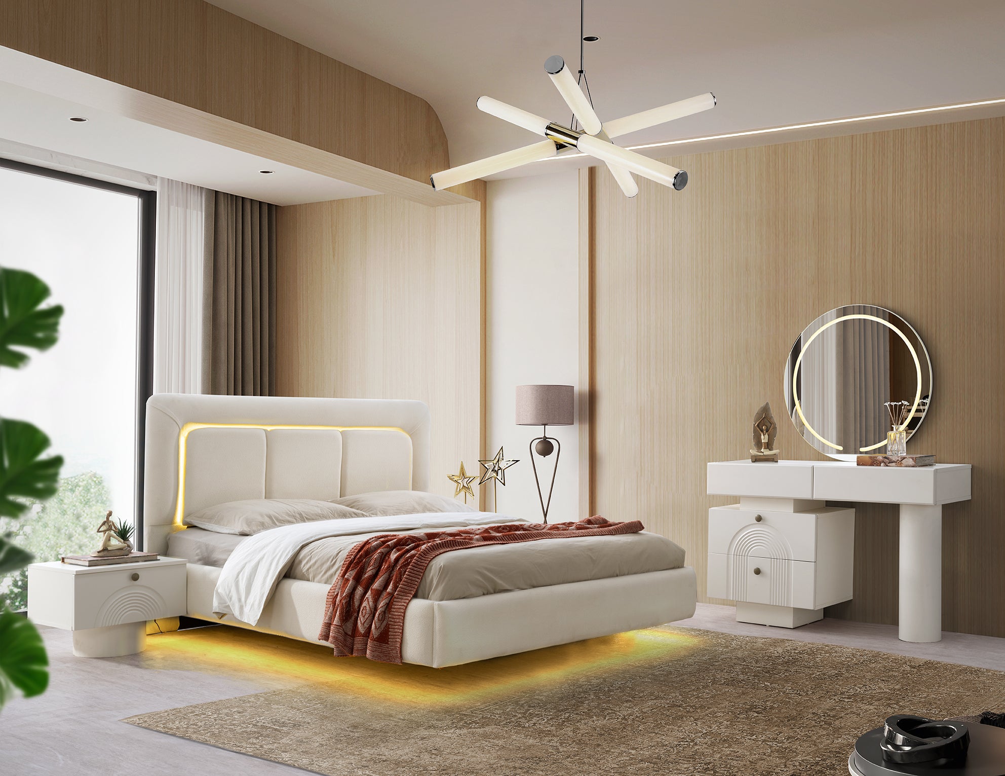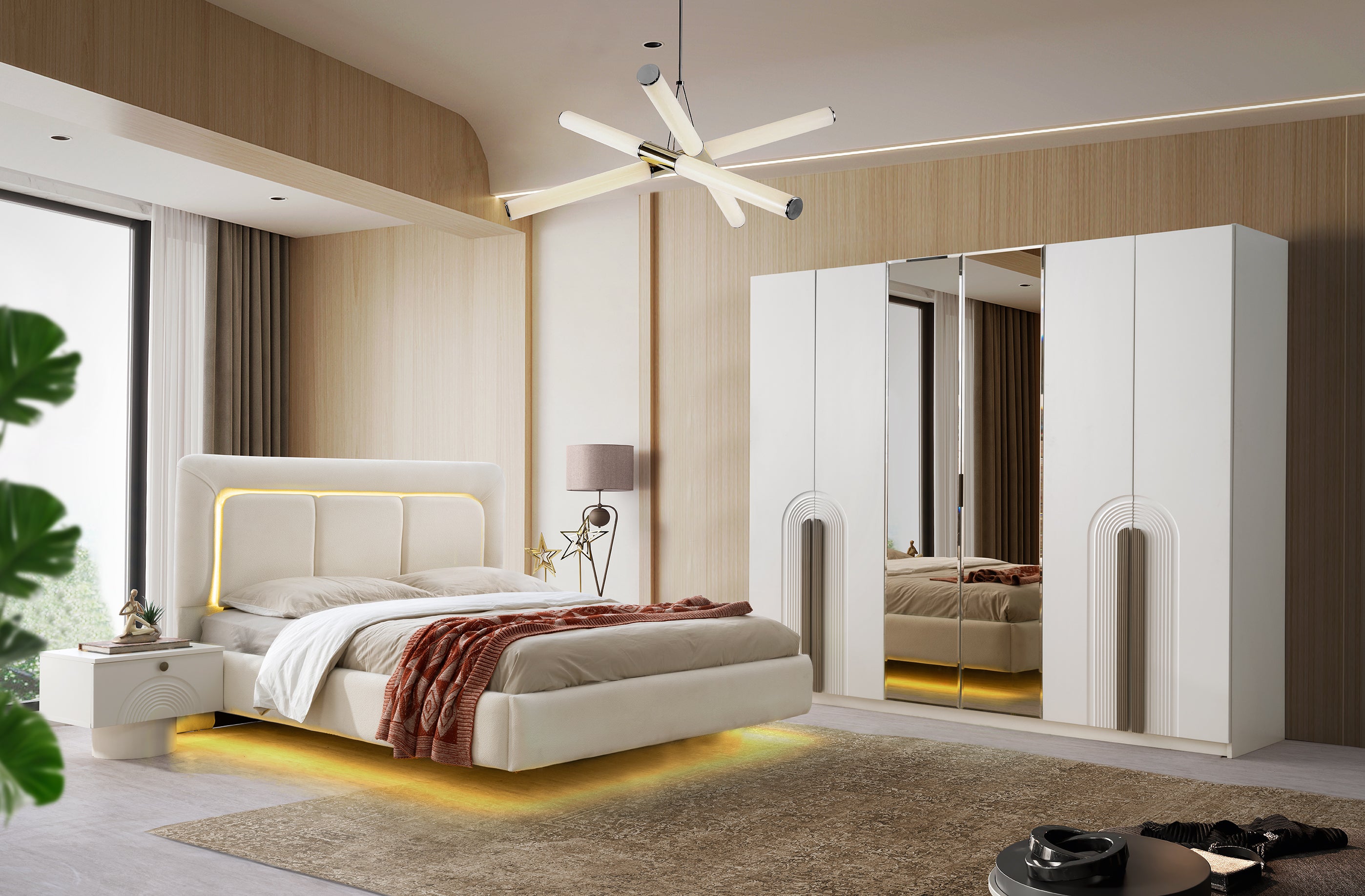 Централно място заема леглото с внушителна, меко тапицирана табла, която често е подчертана с LED подсветка за създаване на топла и приветлива атмосфера. Гардеробът е с голям капацитет и се отличава с огледални врати и вертикални декоративни елементи, които добавят височина и изтънченост.