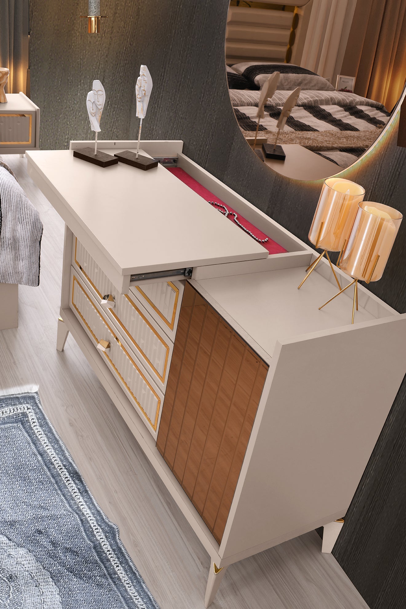 Елегантна тоалетка: Тоалетката с голямото си огледало и практични чекмеджета е идеална за съхранение на козметика и аксесоари.