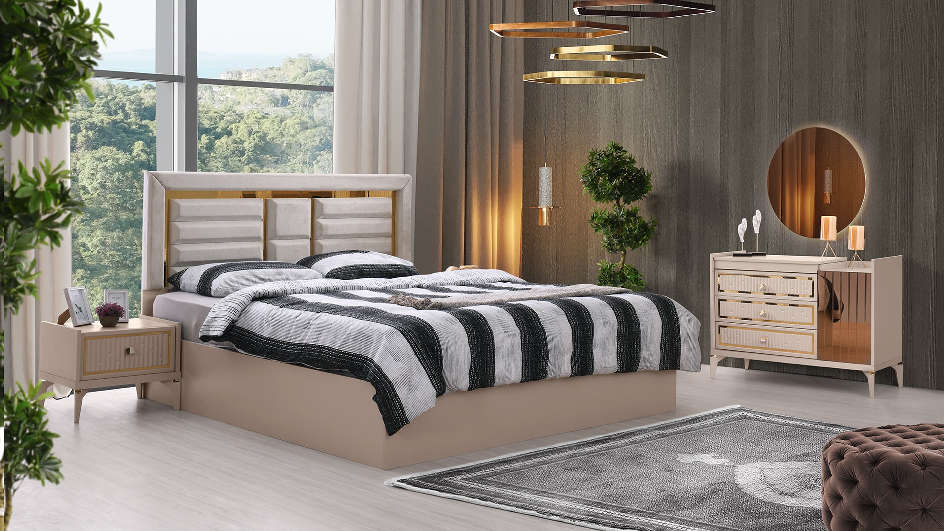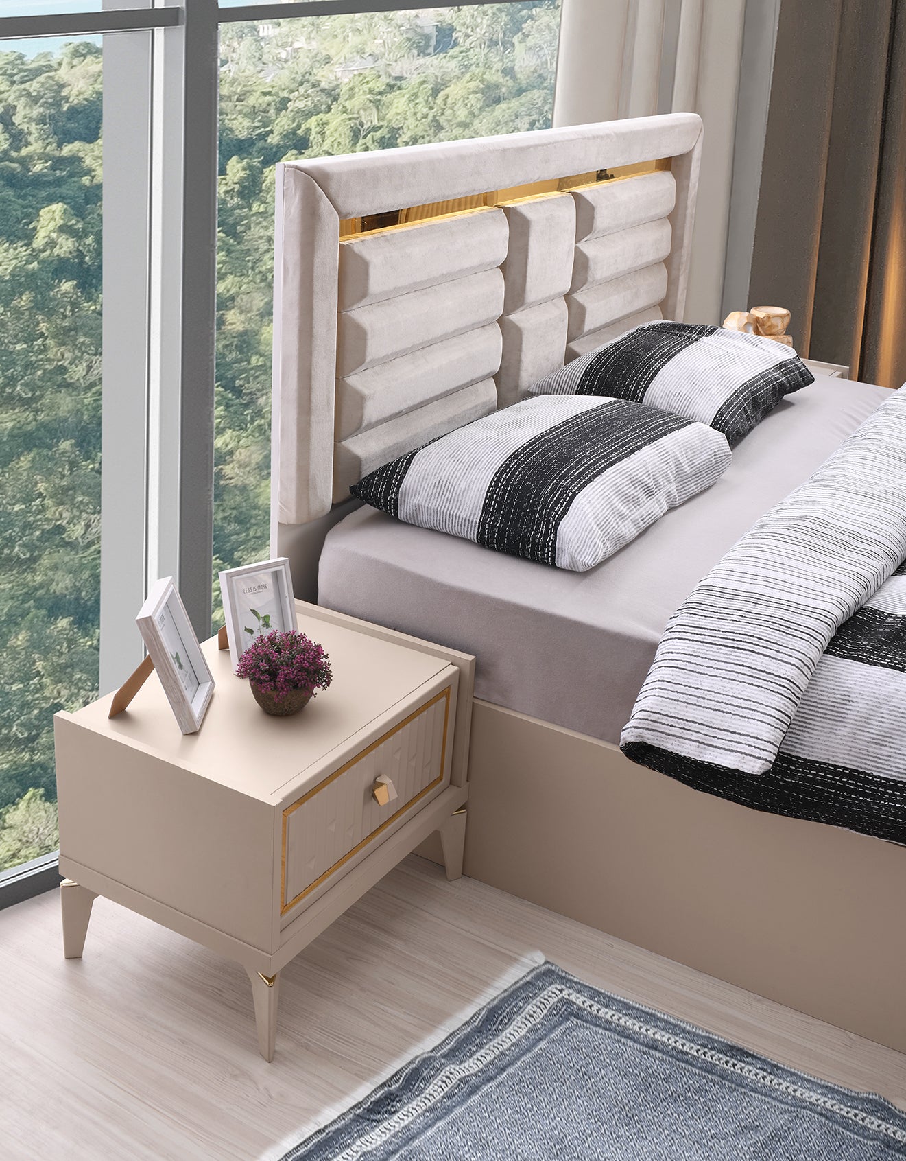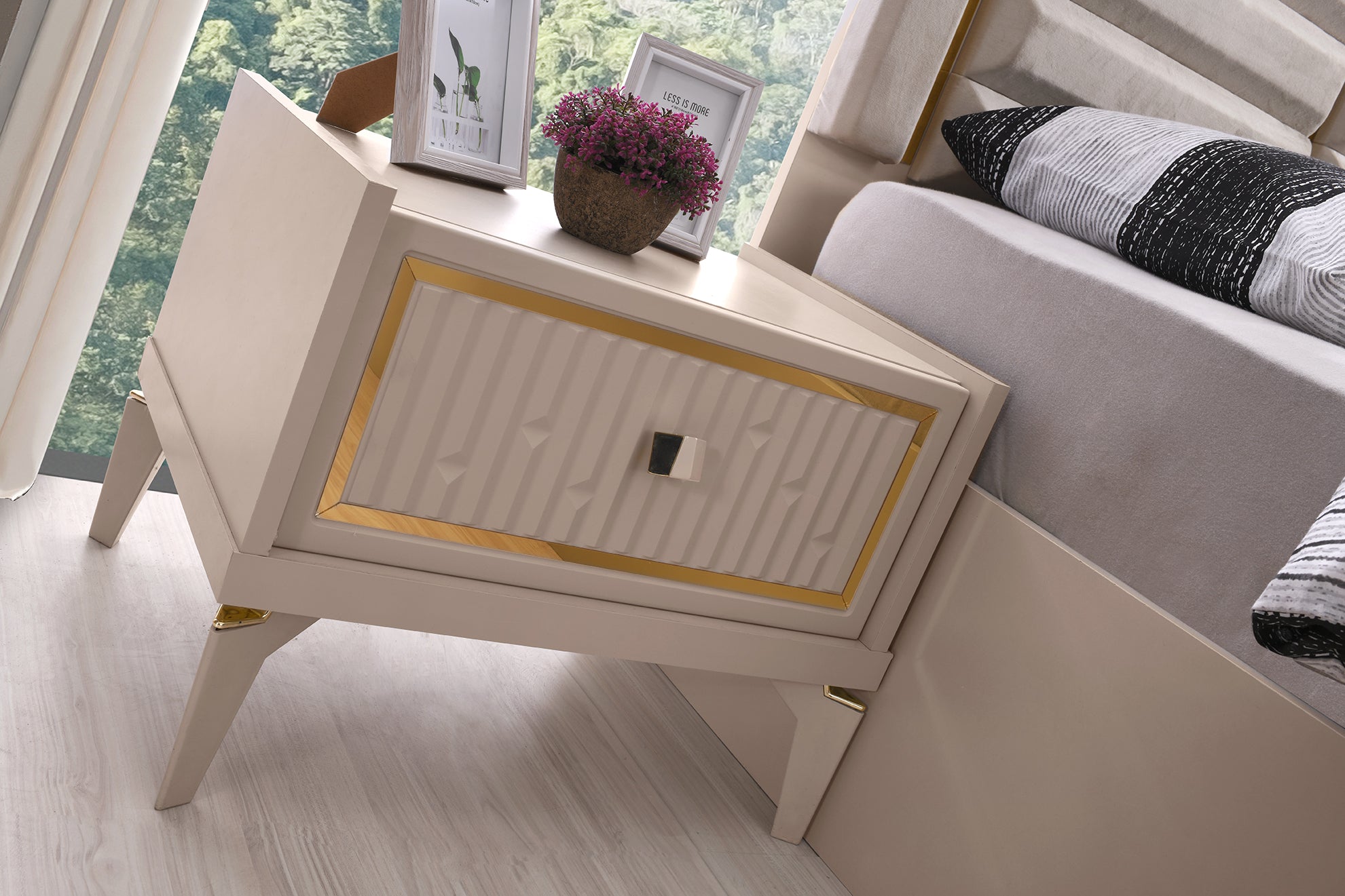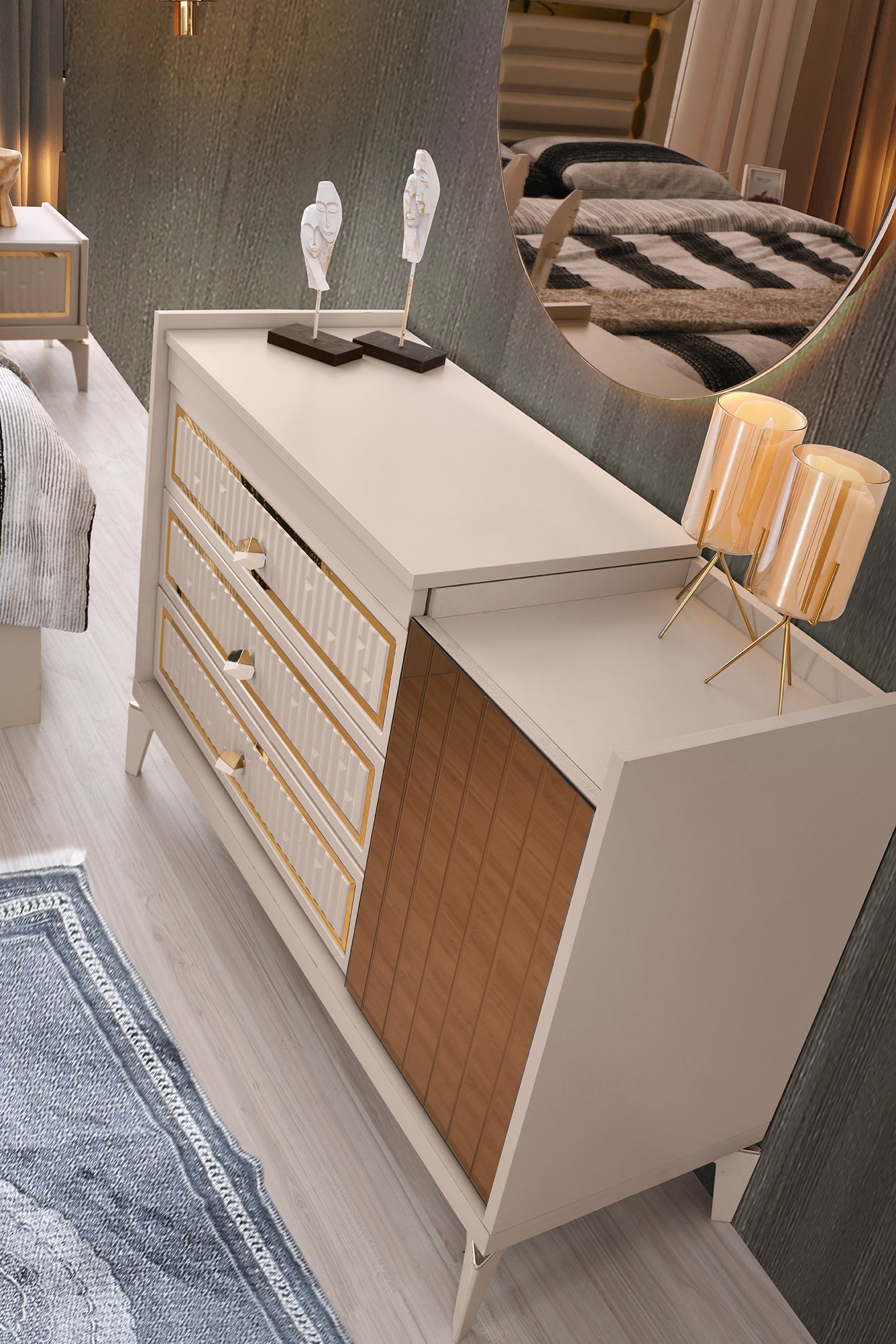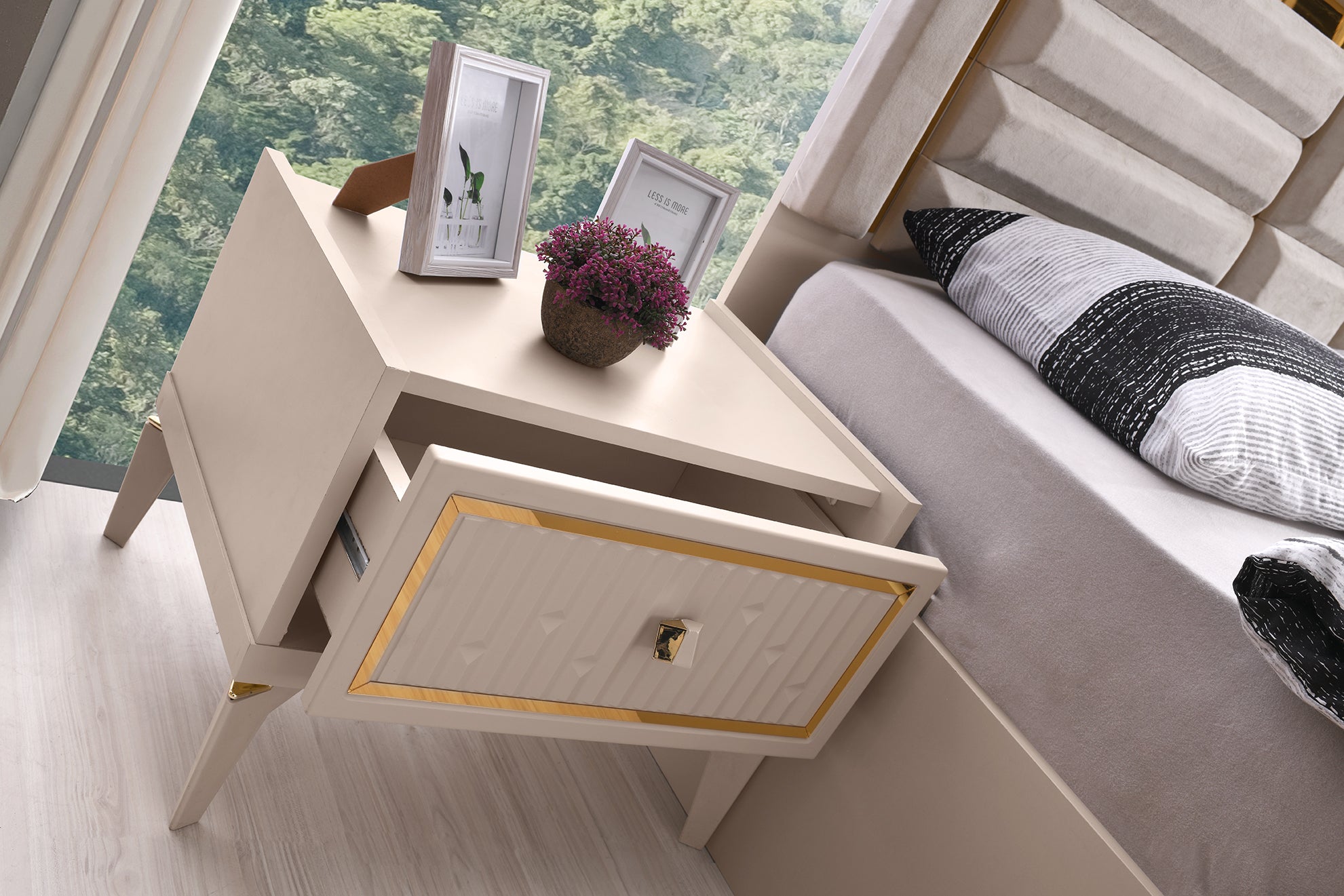 Нощни шкафчета: Нощните шкафчета с чекмеджета и златисти дръжки допълват стилния дизайн и са изключително практични.