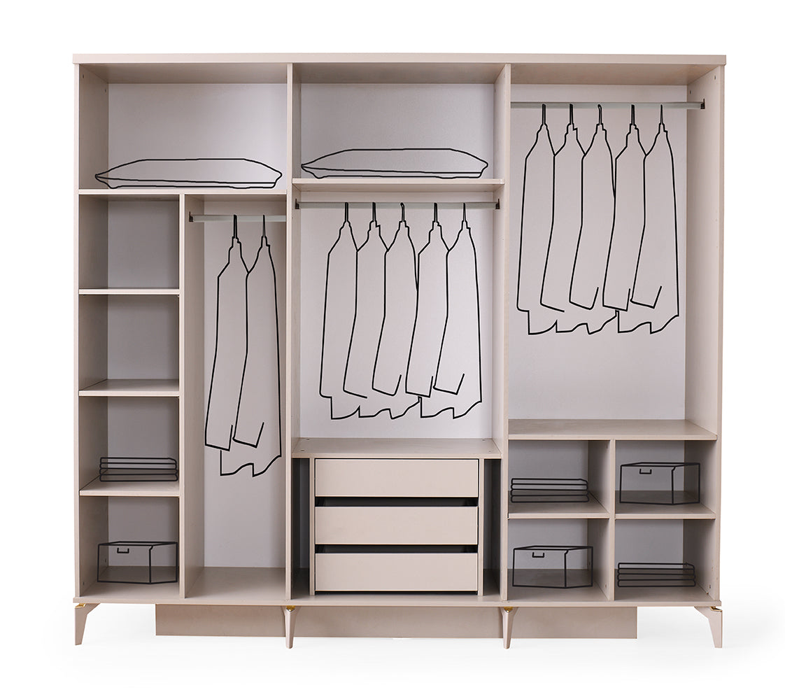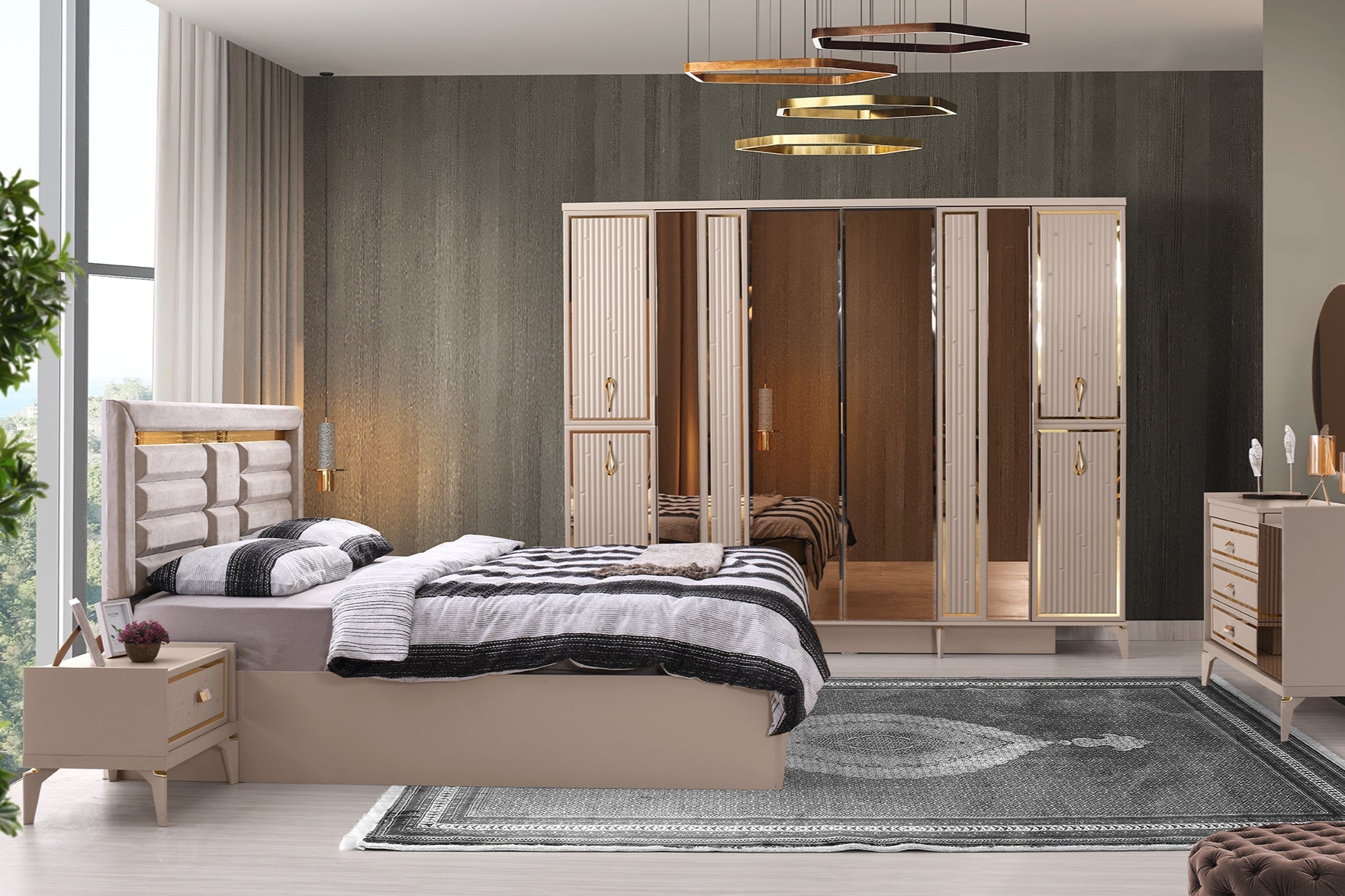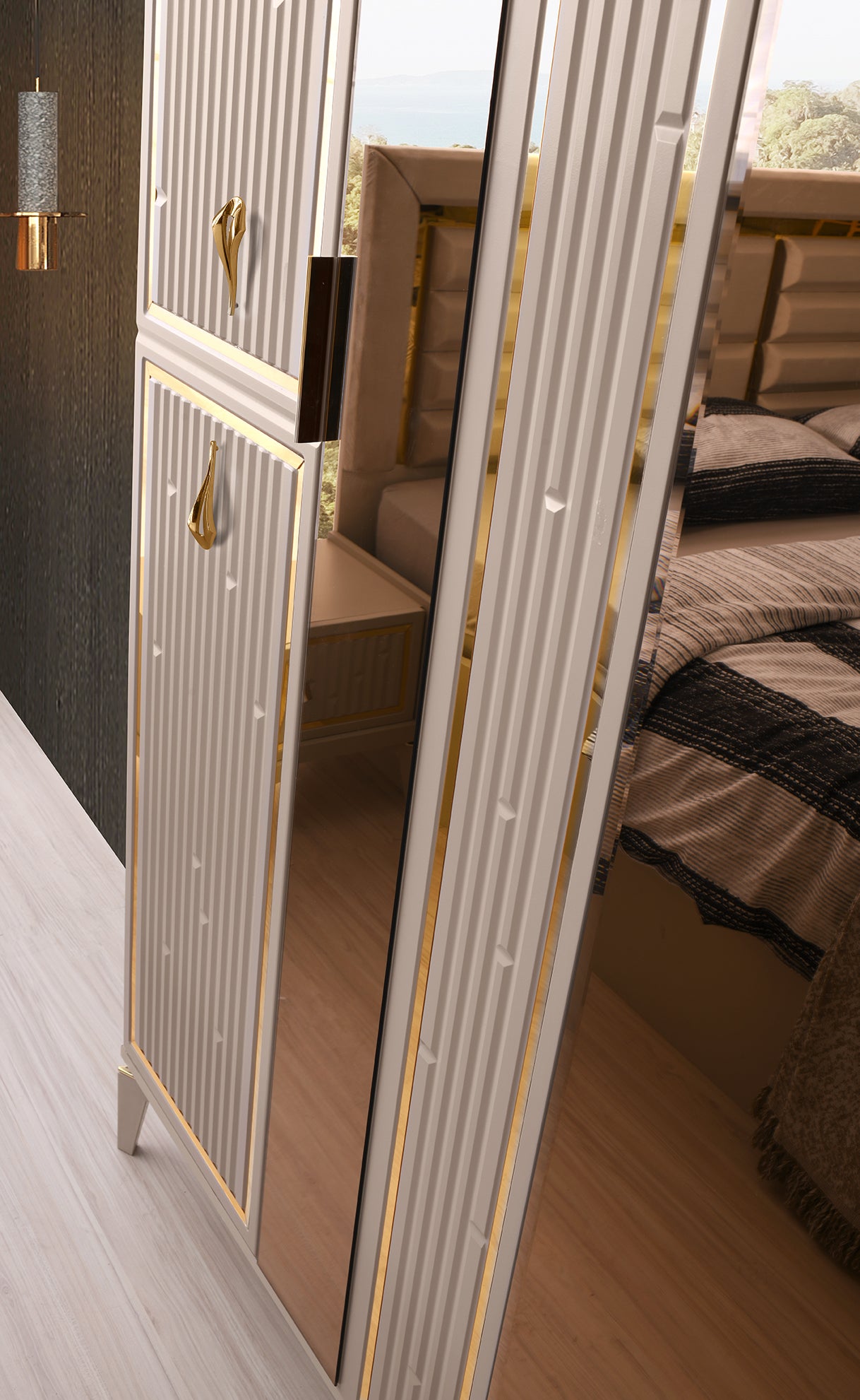 Изящен гардероб: Големият гардероб предлага много място за съхранение, а вратите с релефни орнаменти и огледален панел са изключително стилни и функционални.