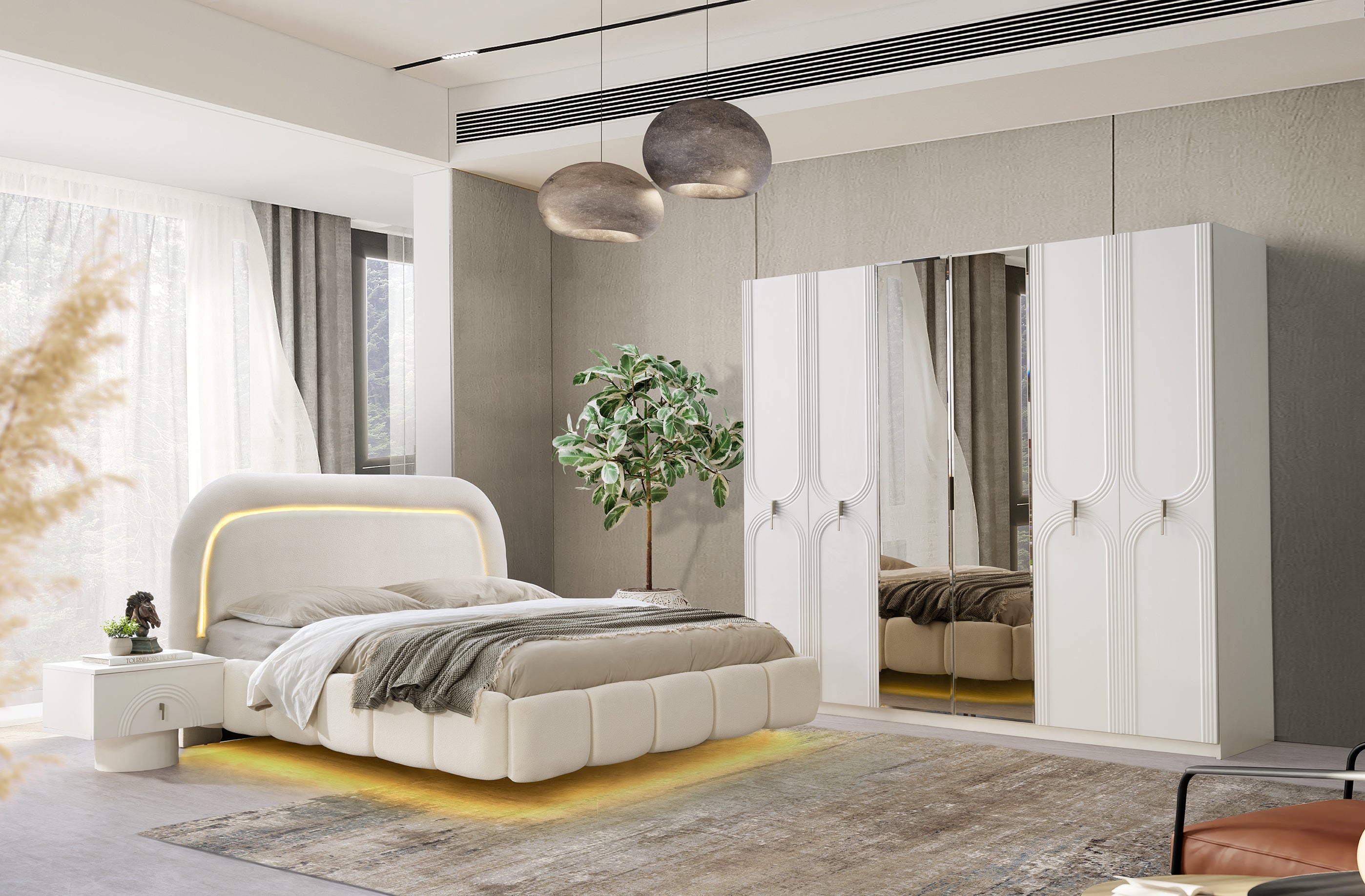 Леглото е с масивна, тапицирана табла със стилна, извита форма, която е силно подчертана от вградено LED осветление по контура. Гардеробът е с голям обем и има огледални врати, като вертикалните, арковидни декоративни елементи по вратите му придават уникален и изискан вид, напомнящ на комплекта СЕВИЛЯ. Нощните шкафчета следват извитите линии на леглото, завършвайки хармоничната визия.