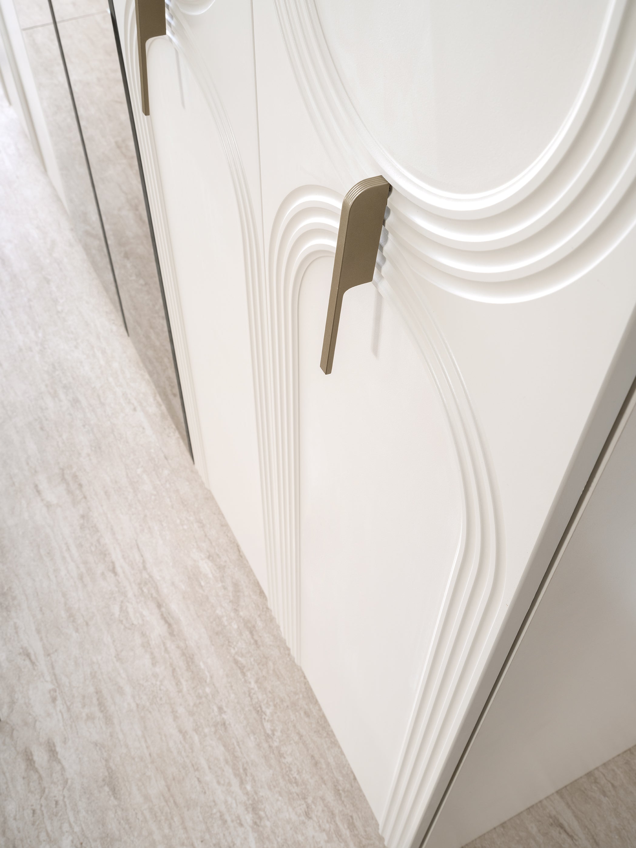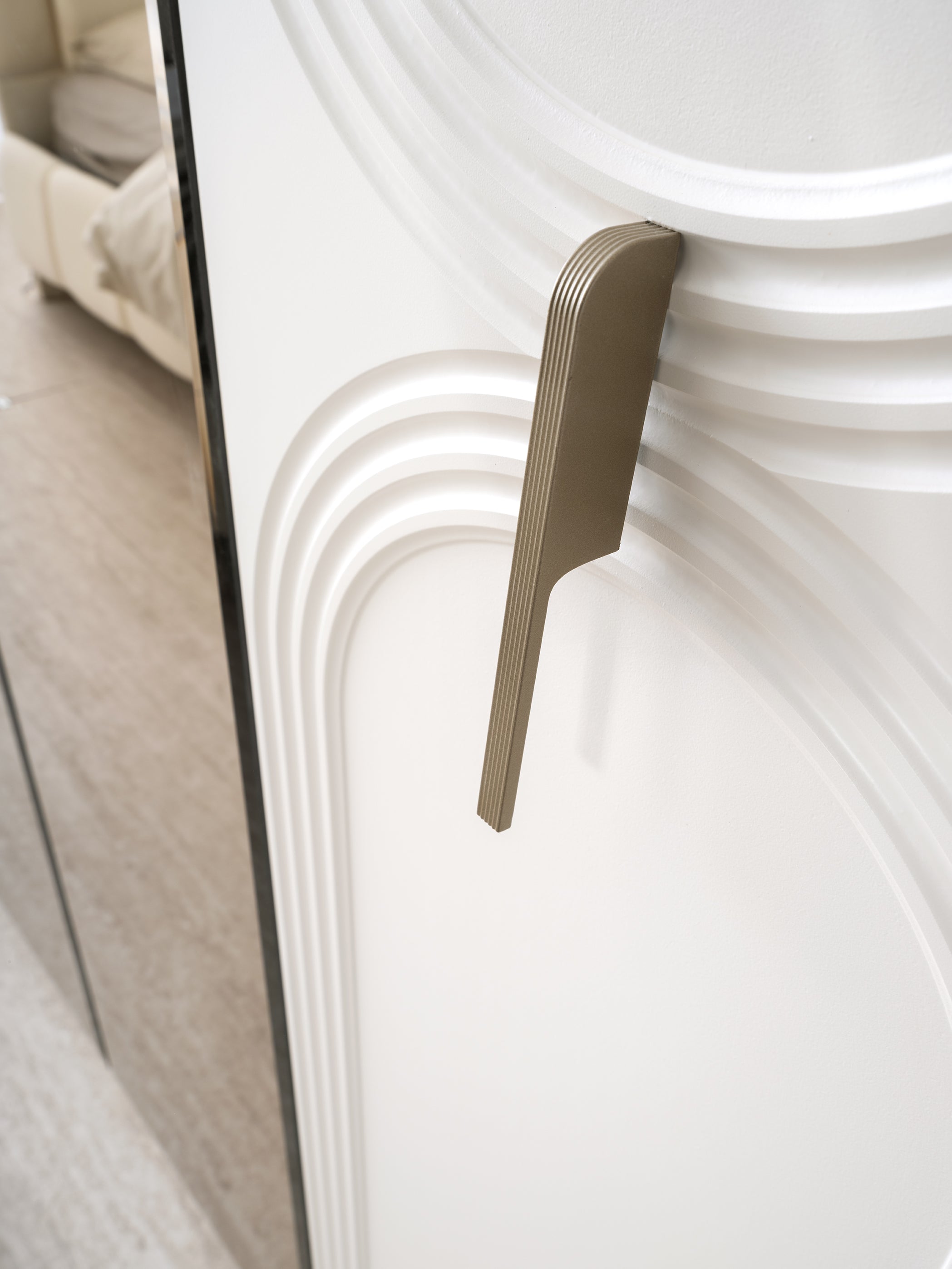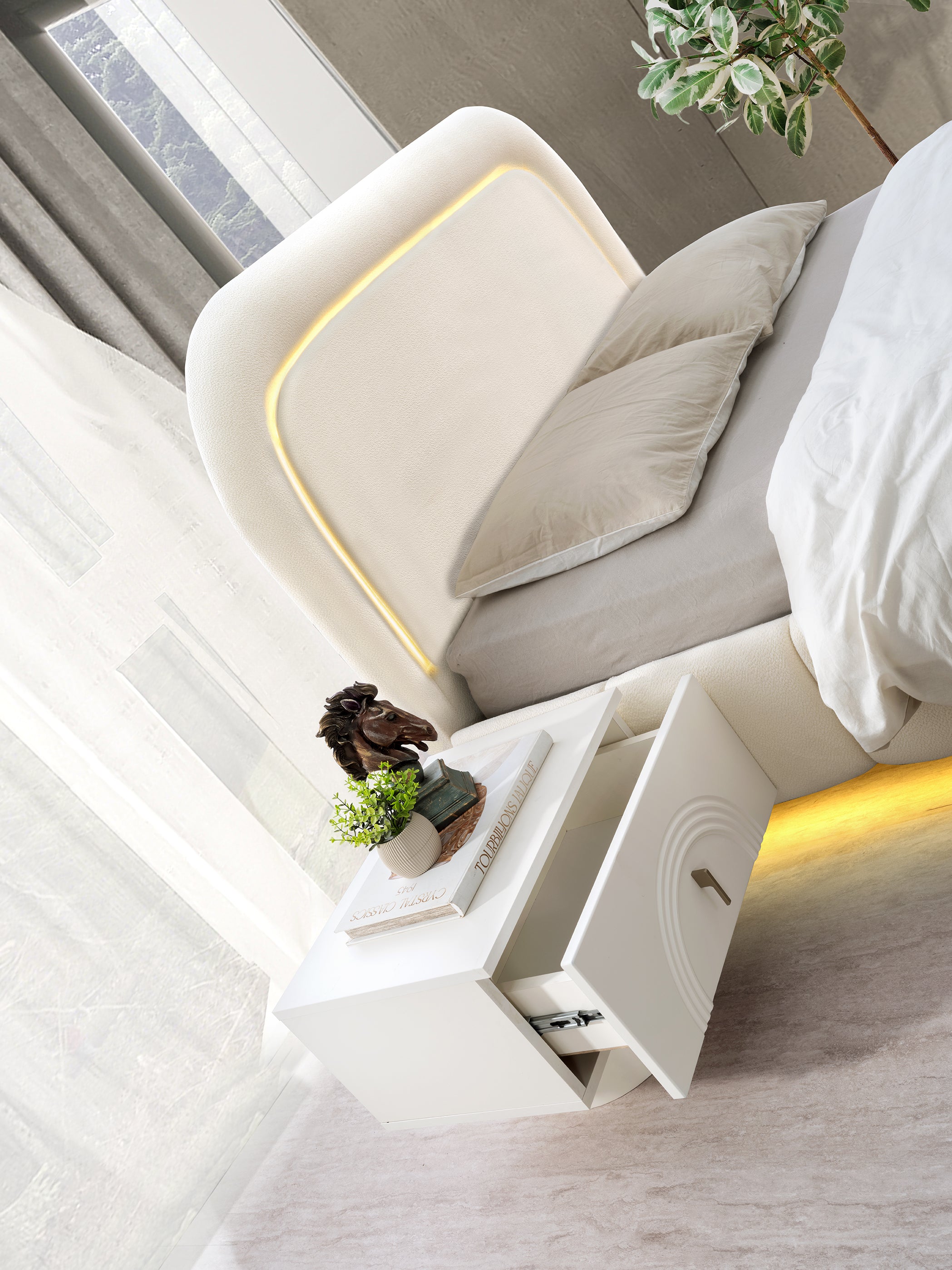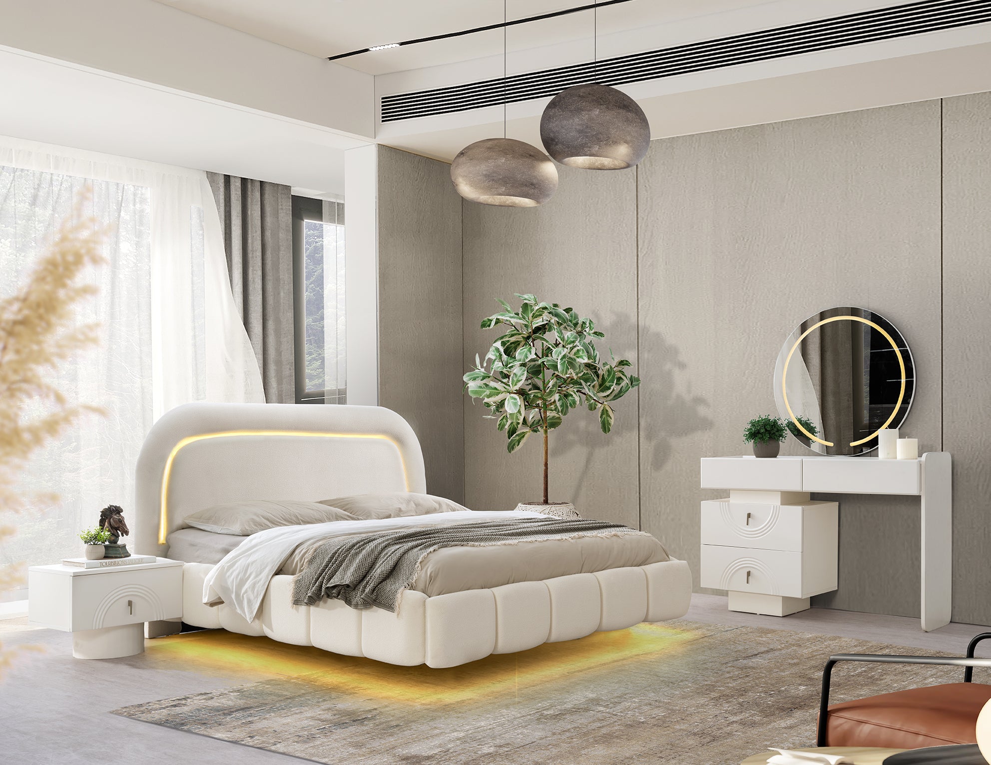 Спален комплект МЕРИЧ въплъщава изтънчен лукс и съвременен дизайн, като акцентира върху плавните извивки и меките, тапицирани форми. Дизайнът е светъл и елегантен, създаващ усещане за спокойствие и висока класа.