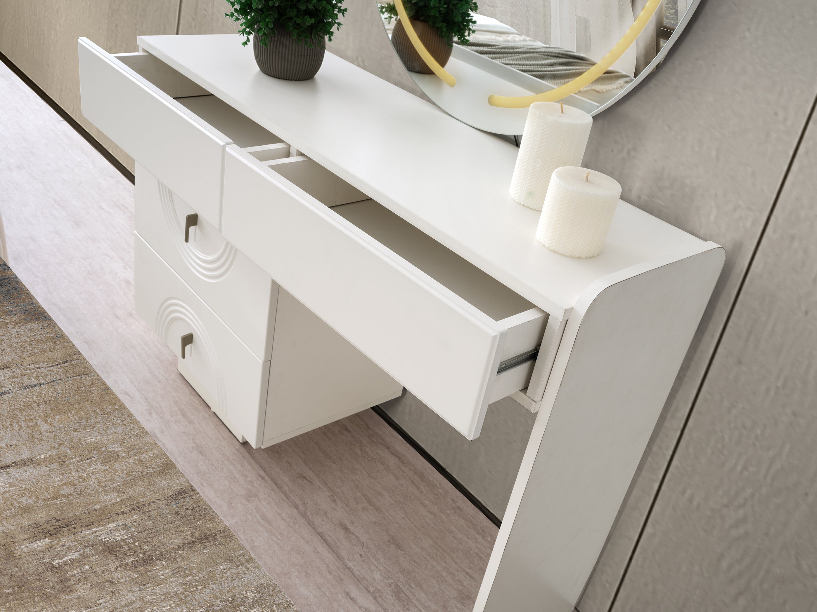 Материал: Целият комплект е изработен от висококачествено MDF (МДФ), което гарантира отлична здравина, стабилност и луксозен завършек.
