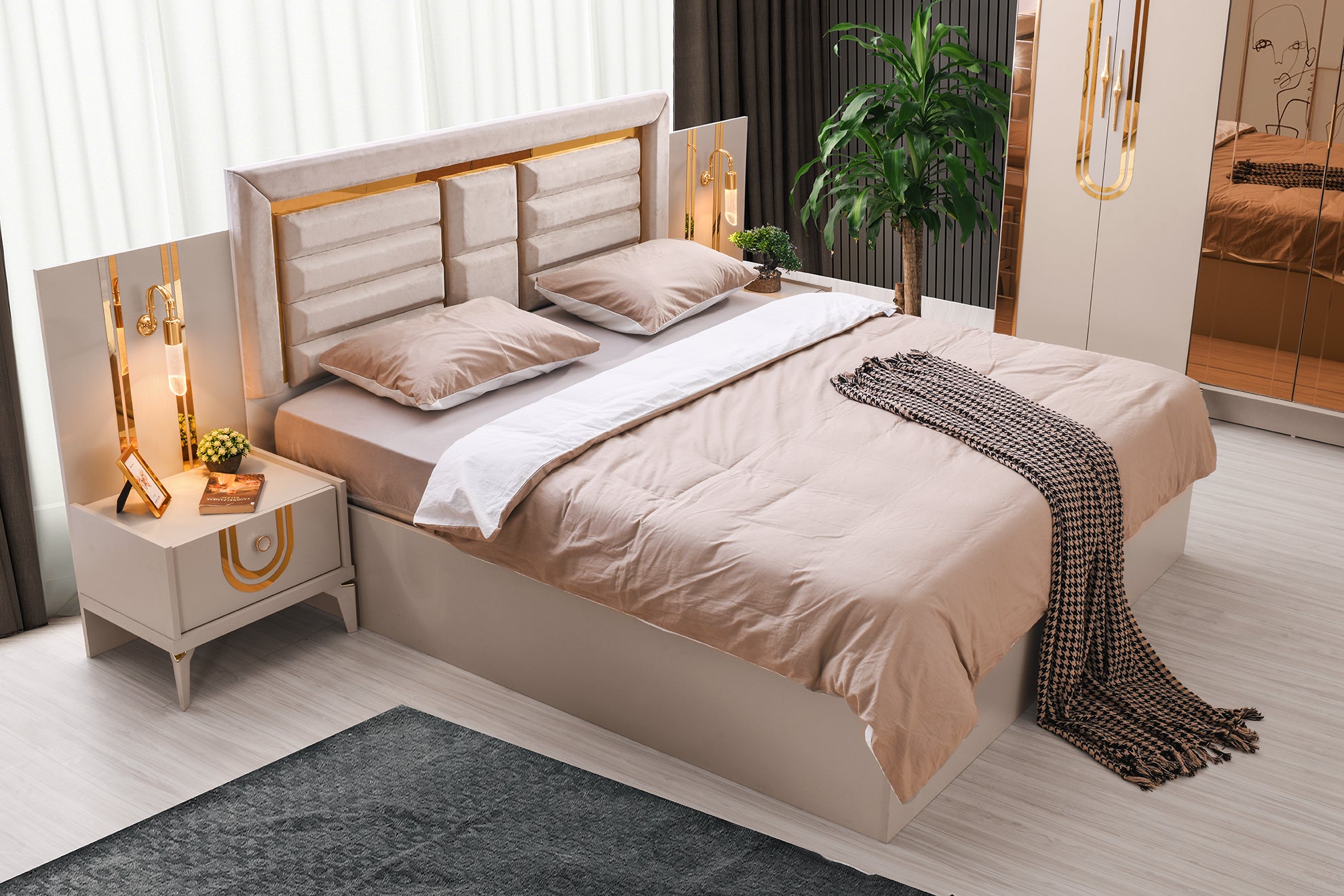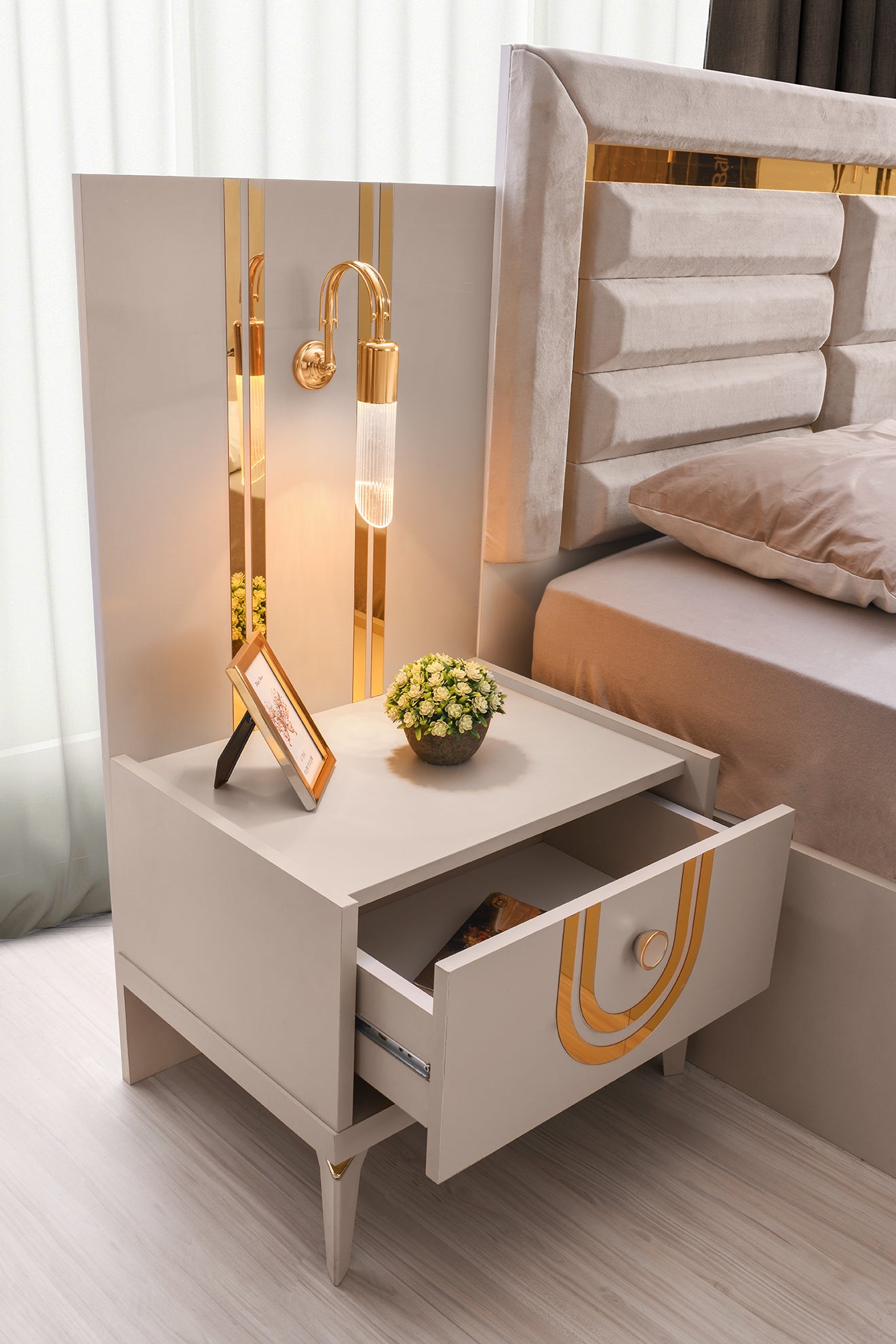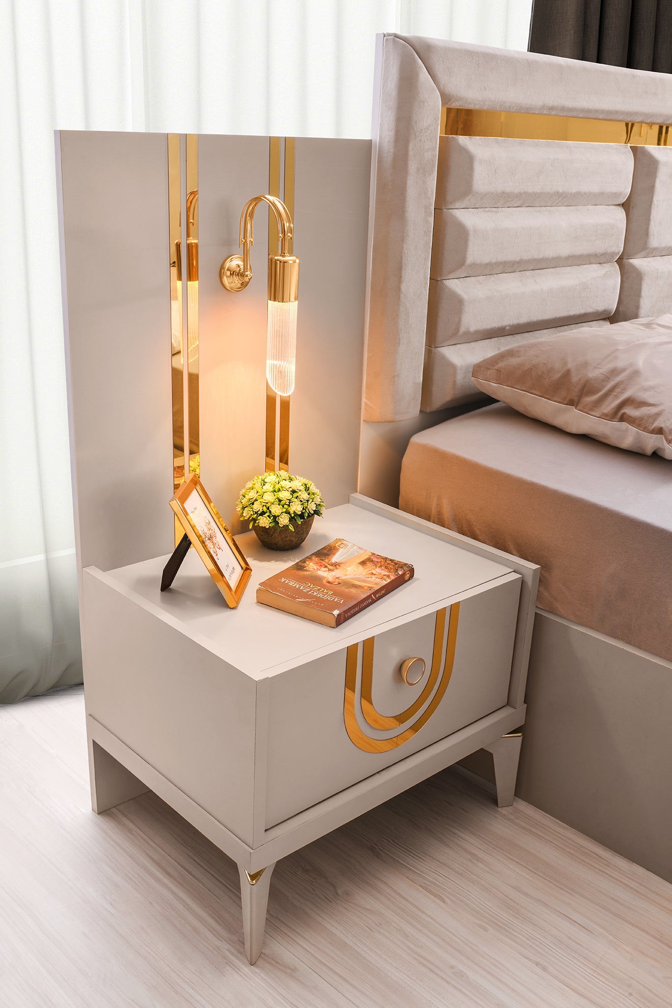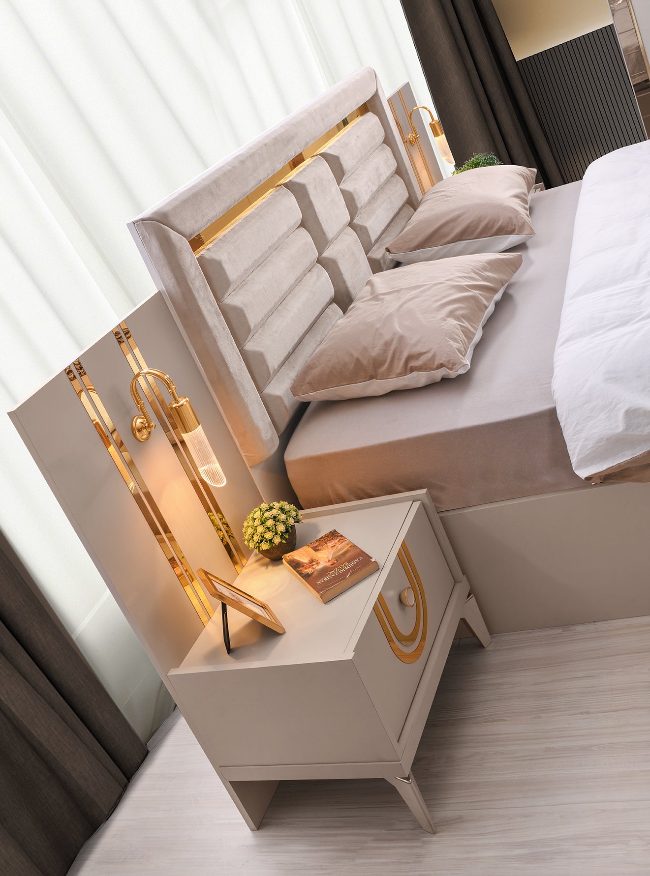 Нощни шкафчета: Практичните нощни шкафчета с чекмеджета допълват стилния дизайн и предлагат удобно място за съхранение до леглото.