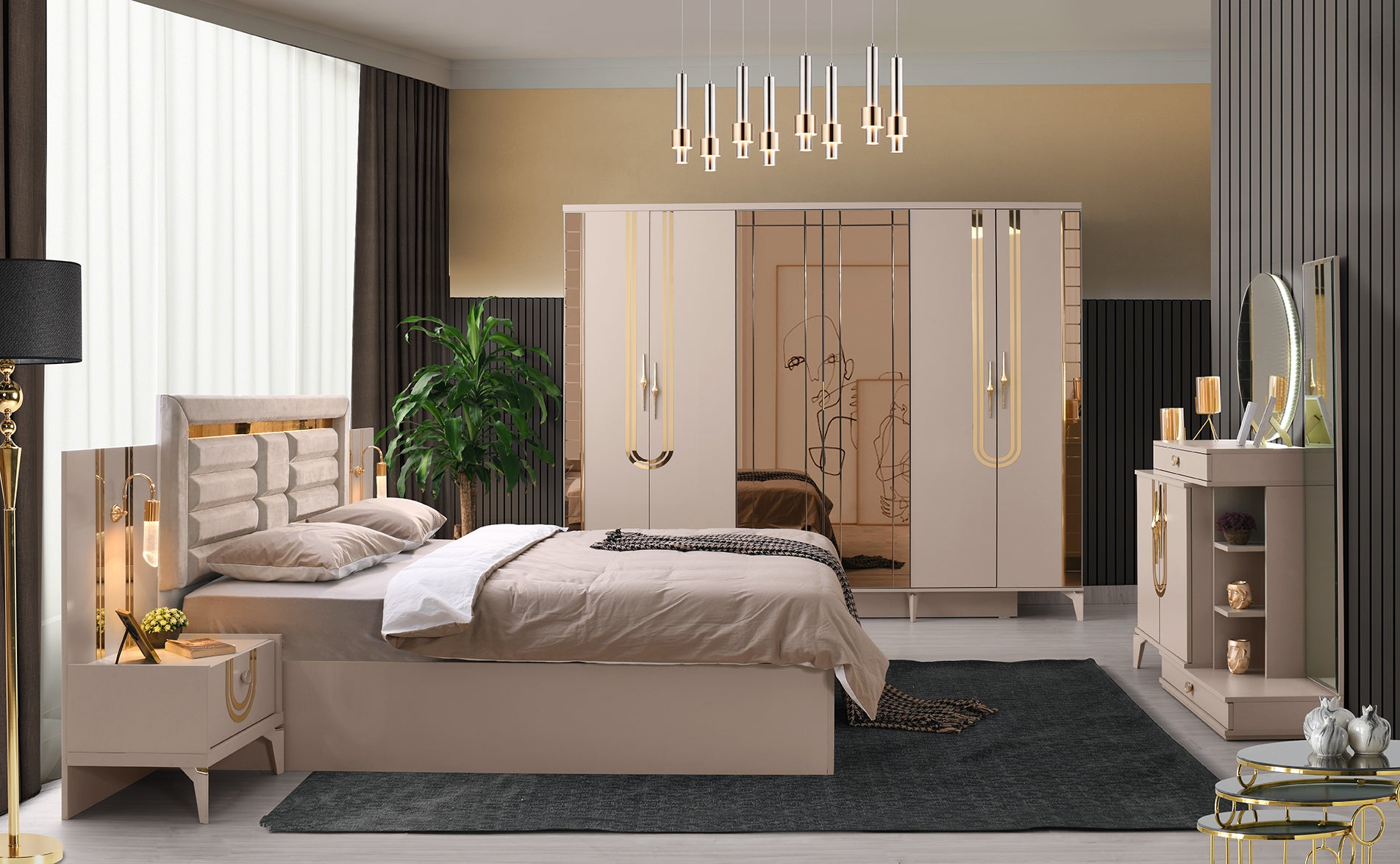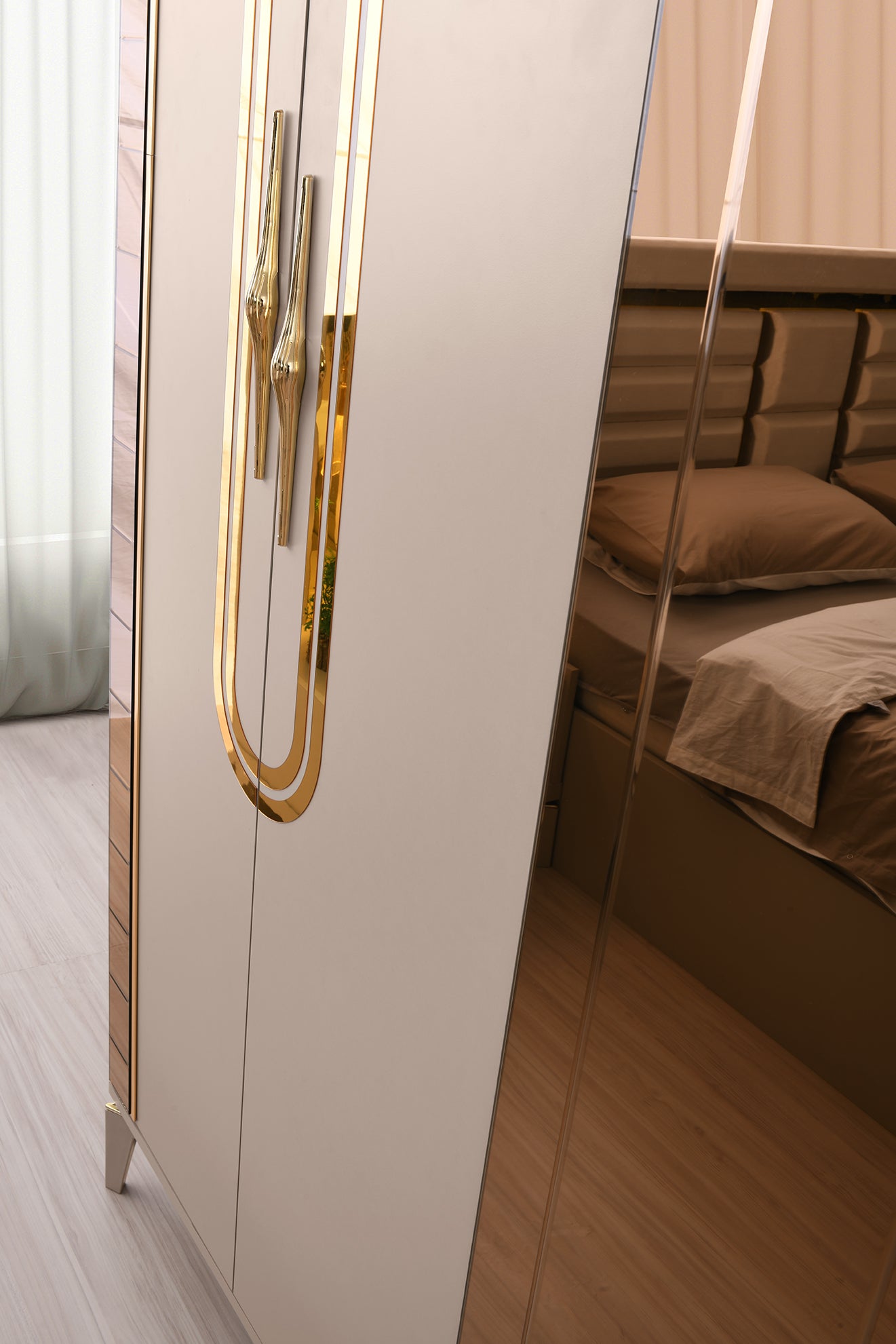 Функционален гардероб: Големият гардероб предлага обширно място за съхранение. Вратите с гланцово покритие и огледални панели не само изглеждат стилно, но и правят стаята по-светла и просторна.