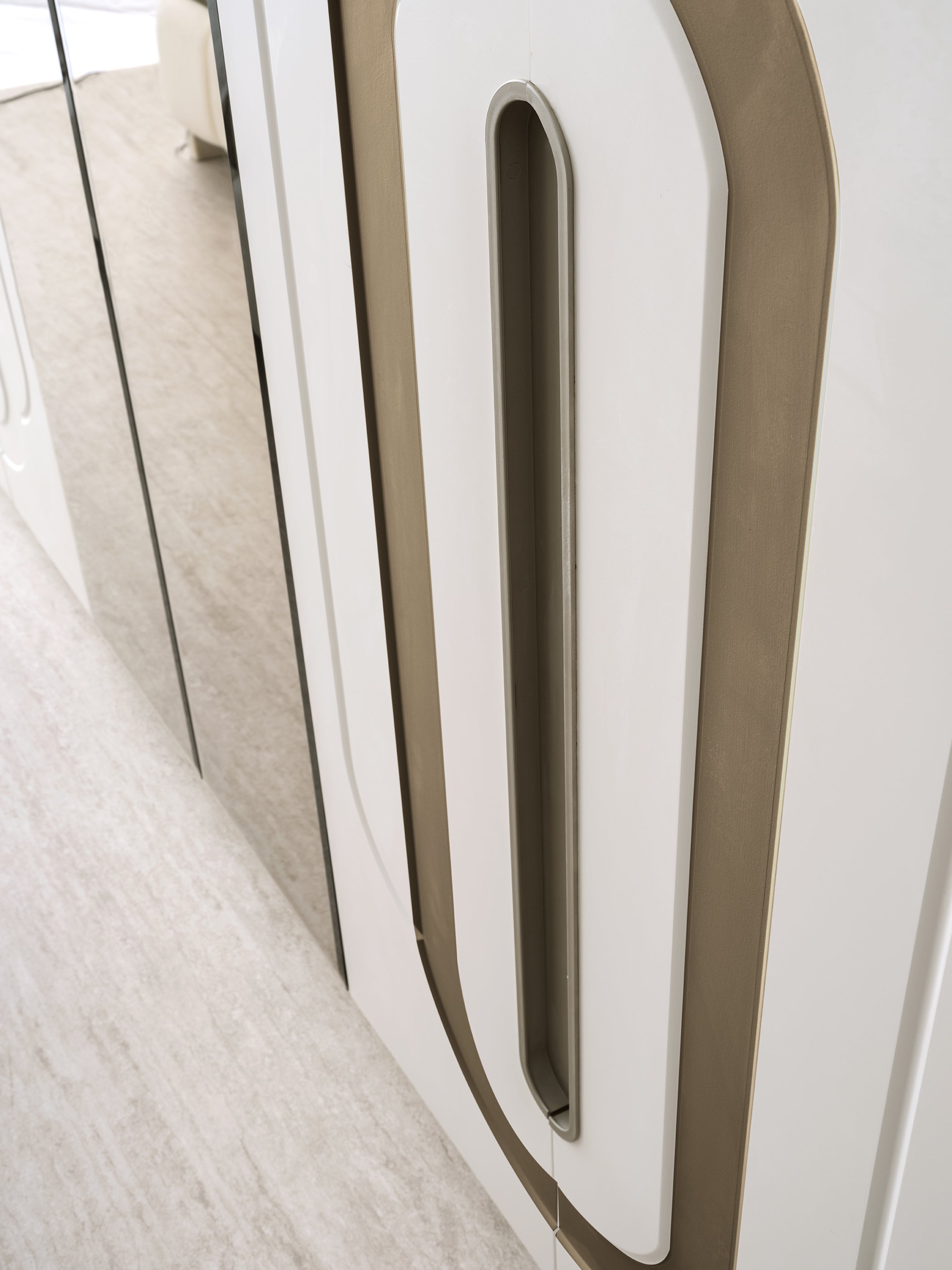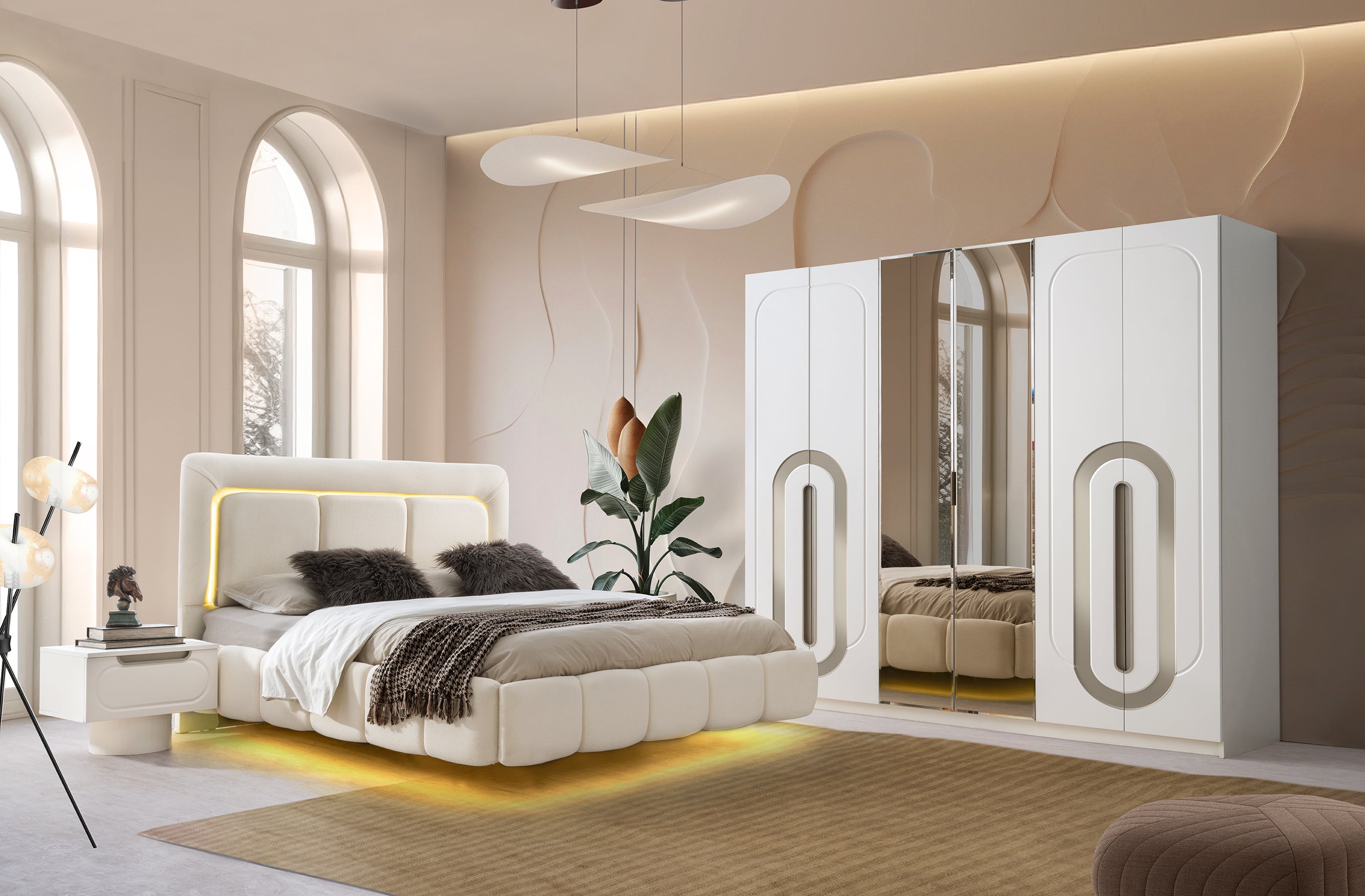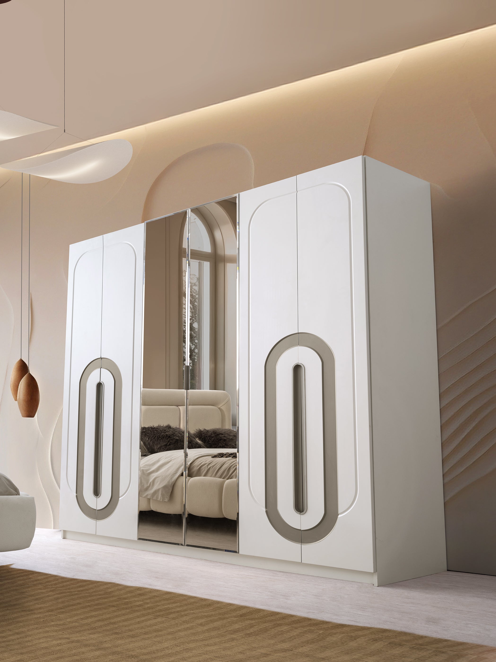 Леглото е с масивна, тапицирана табла, която е стилно извита и осветена. Гардеробът е с голям обем и впечатляващи огледални врати, които са украсени с вертикални овални метални елементи – този детайл придава уникална и изискана визия. Комплектът е завършен с модерно проектирани нощни шкафчета и тоалетка, които следват овалната линия на дизайна.