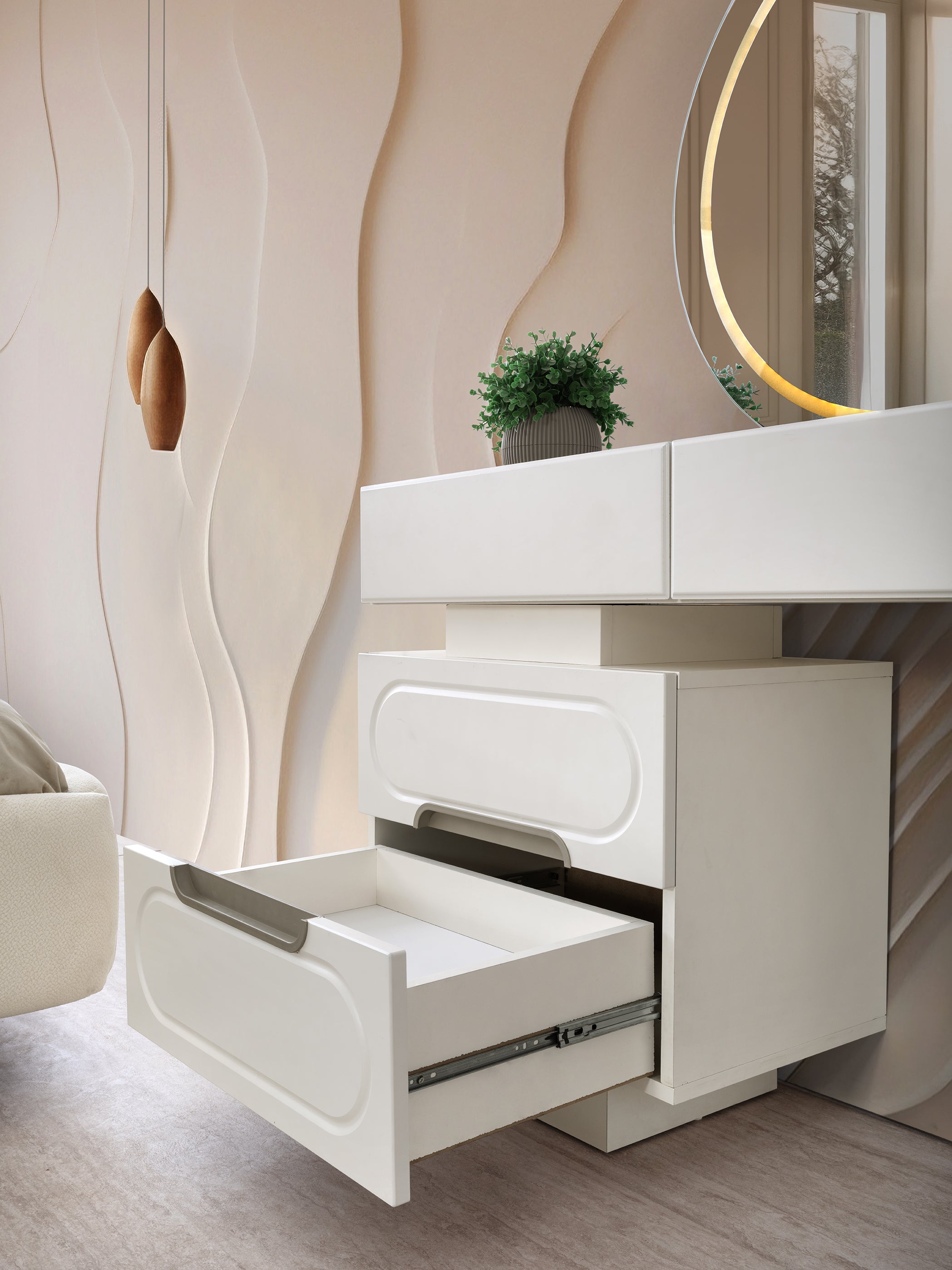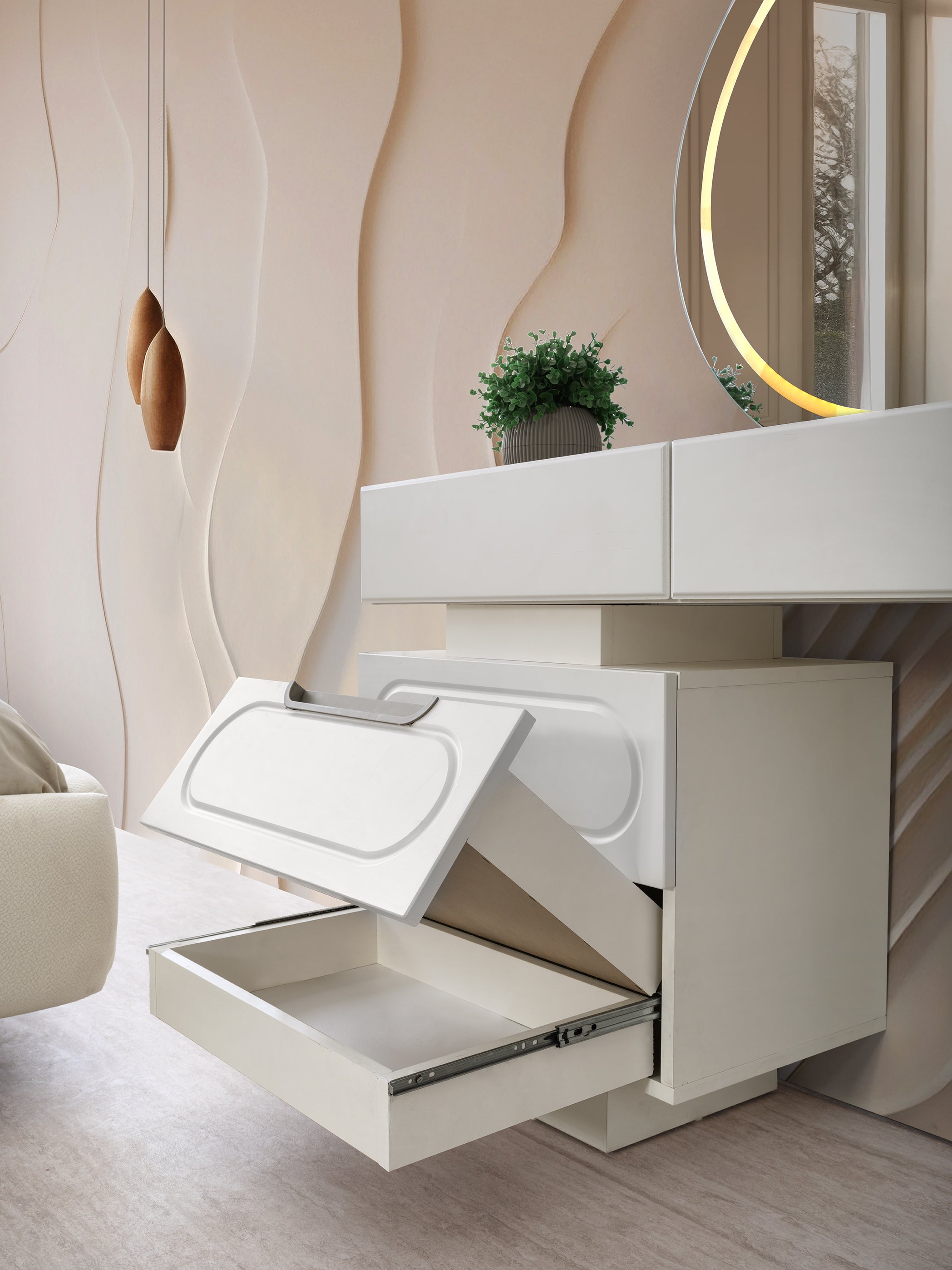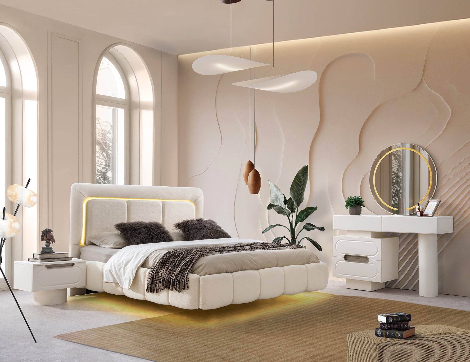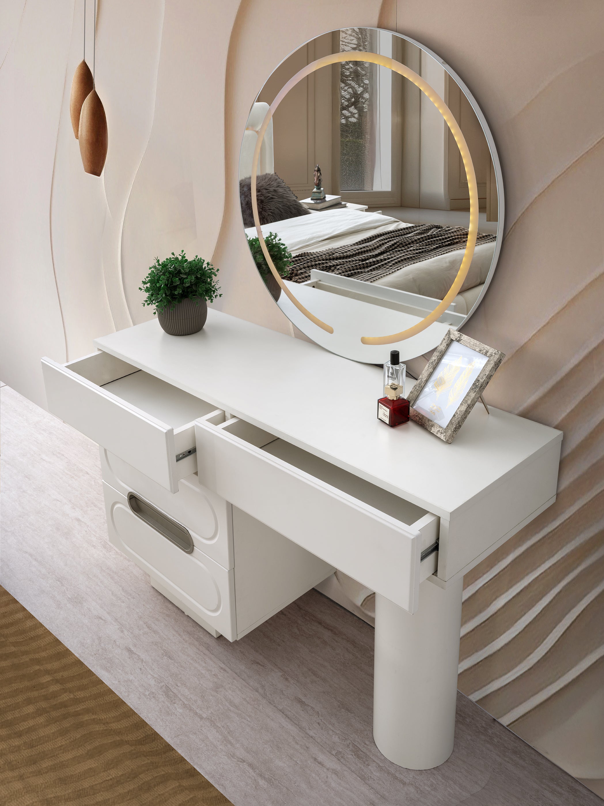 Леглото е с масивна, тапицирана табла, която е стилно извита и осветена. Гардеробът е с голям обем и впечатляващи огледални врати, които са украсени с вертикални овални метални елементи – този детайл придава уникална и изискана визия. Комплектът е завършен с модерно проектирани нощни шкафчета и тоалетка, които следват овалната линия на дизайна.