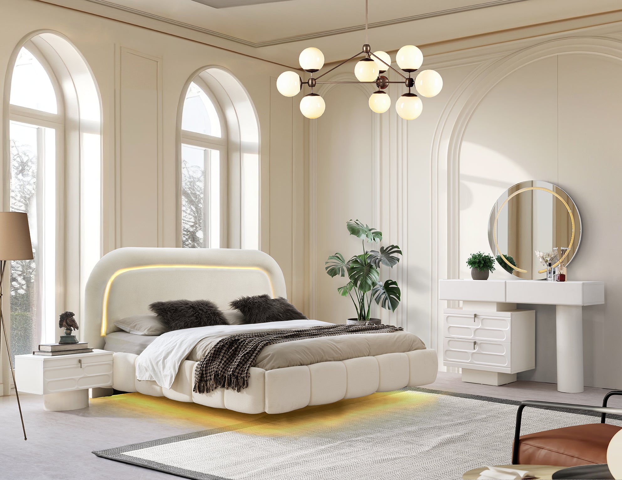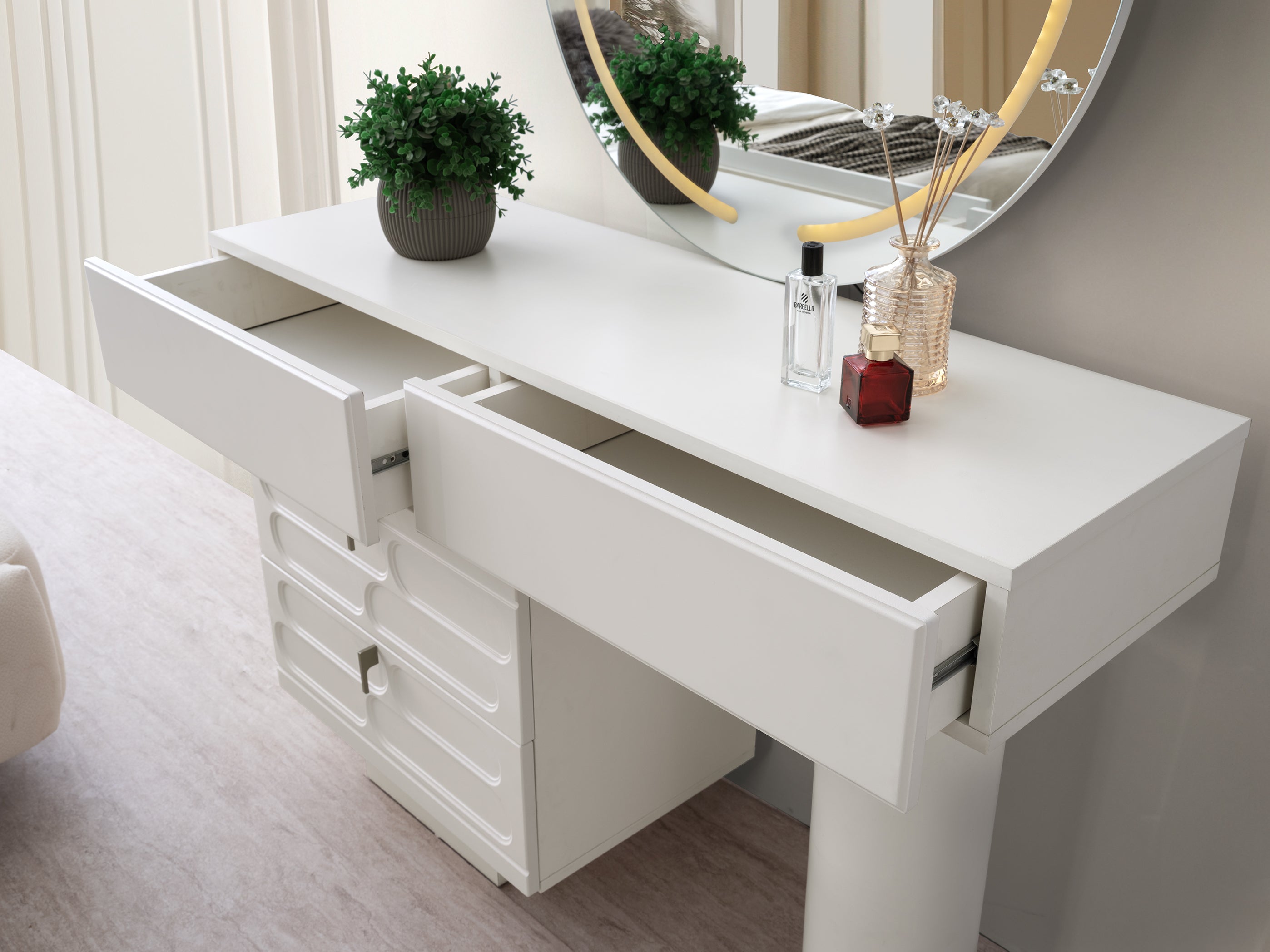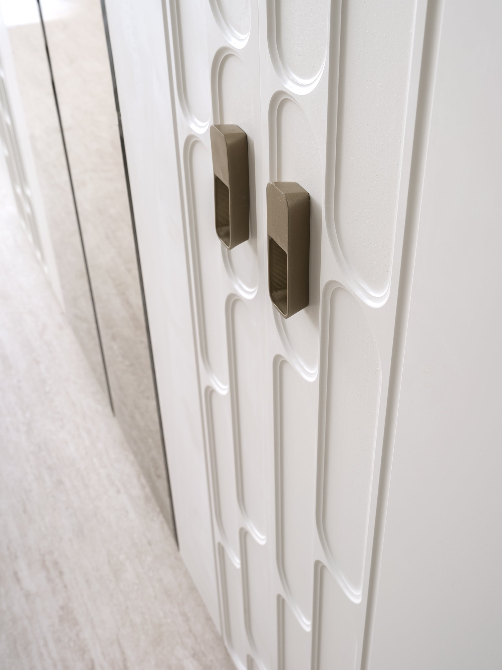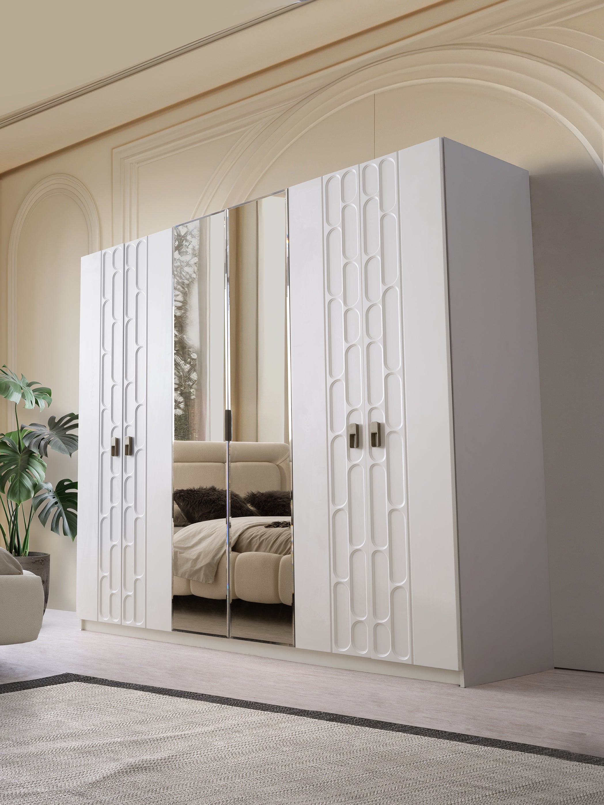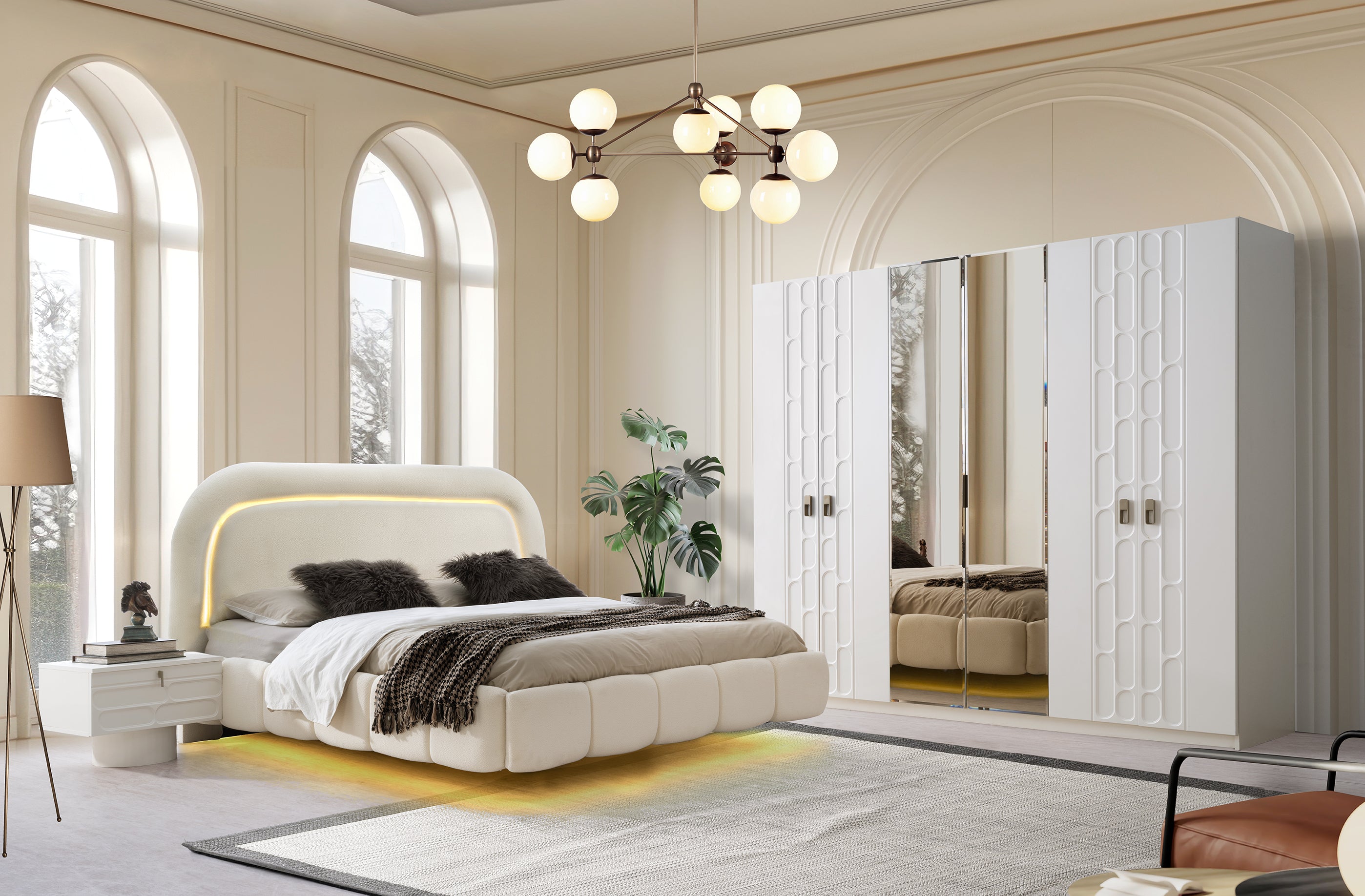 Леглото е с масивна, тапицирана табла с извита форма, която е елегантно подчертана с LED подсветка по контура. Гардеробът е с голям обем и има огледални врати, като вълнообразните релефни елементи по вратите придават дълбочина и уникален артистичен вид. Комплектът е завършен с нощни шкафчета и тоалетка, които следват овалната, плавна линия на дизайна.
