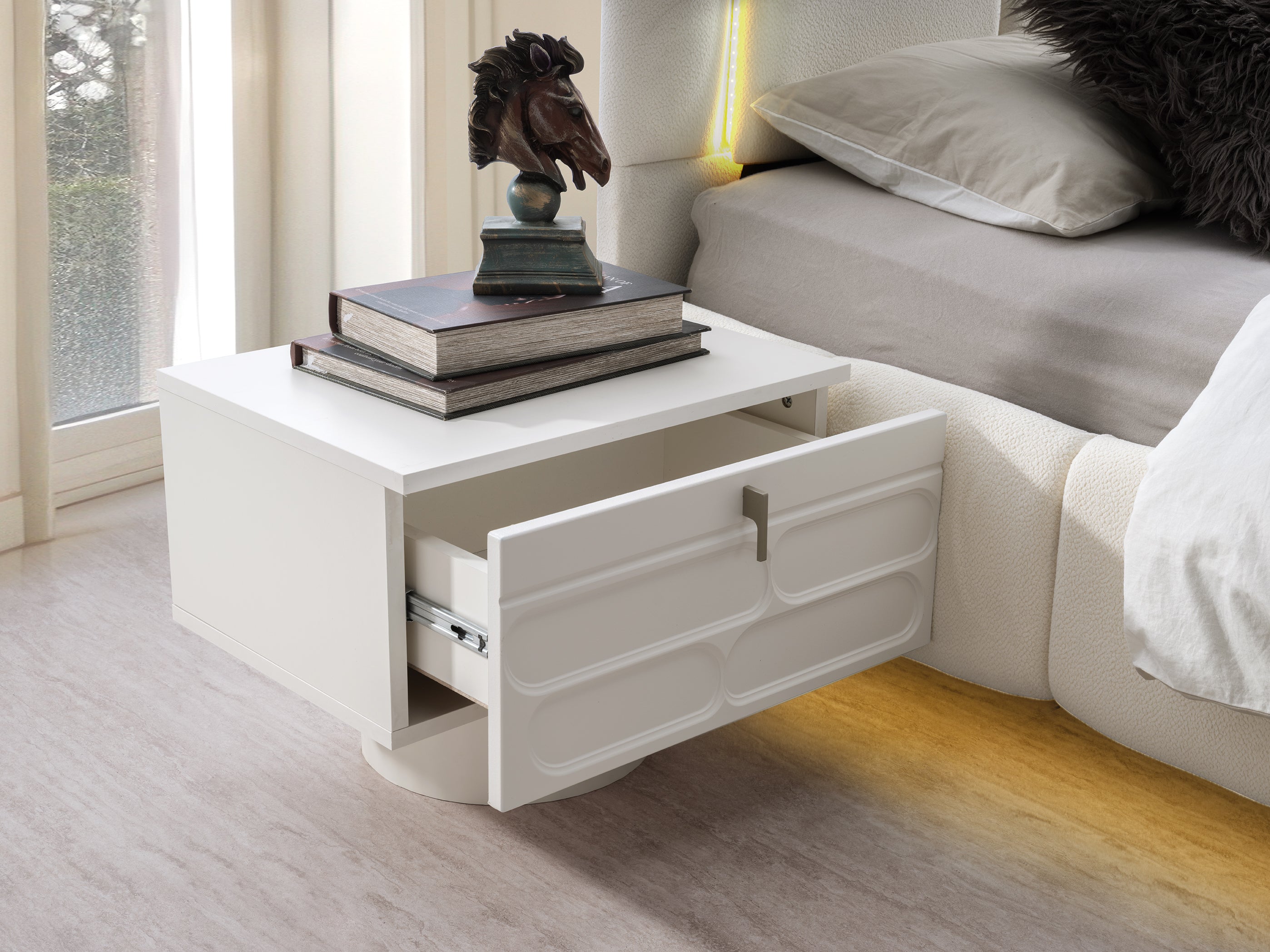 Спален комплект СИДНИ е въплъщение на иновативния и футуристичен дизайн, като внася модерна визия и усещане за движение във вашата спалня. Характерно за този модел е, че съчетава заоблени, скулптурни форми с ефектни, релефни декорации и вградено осветление.