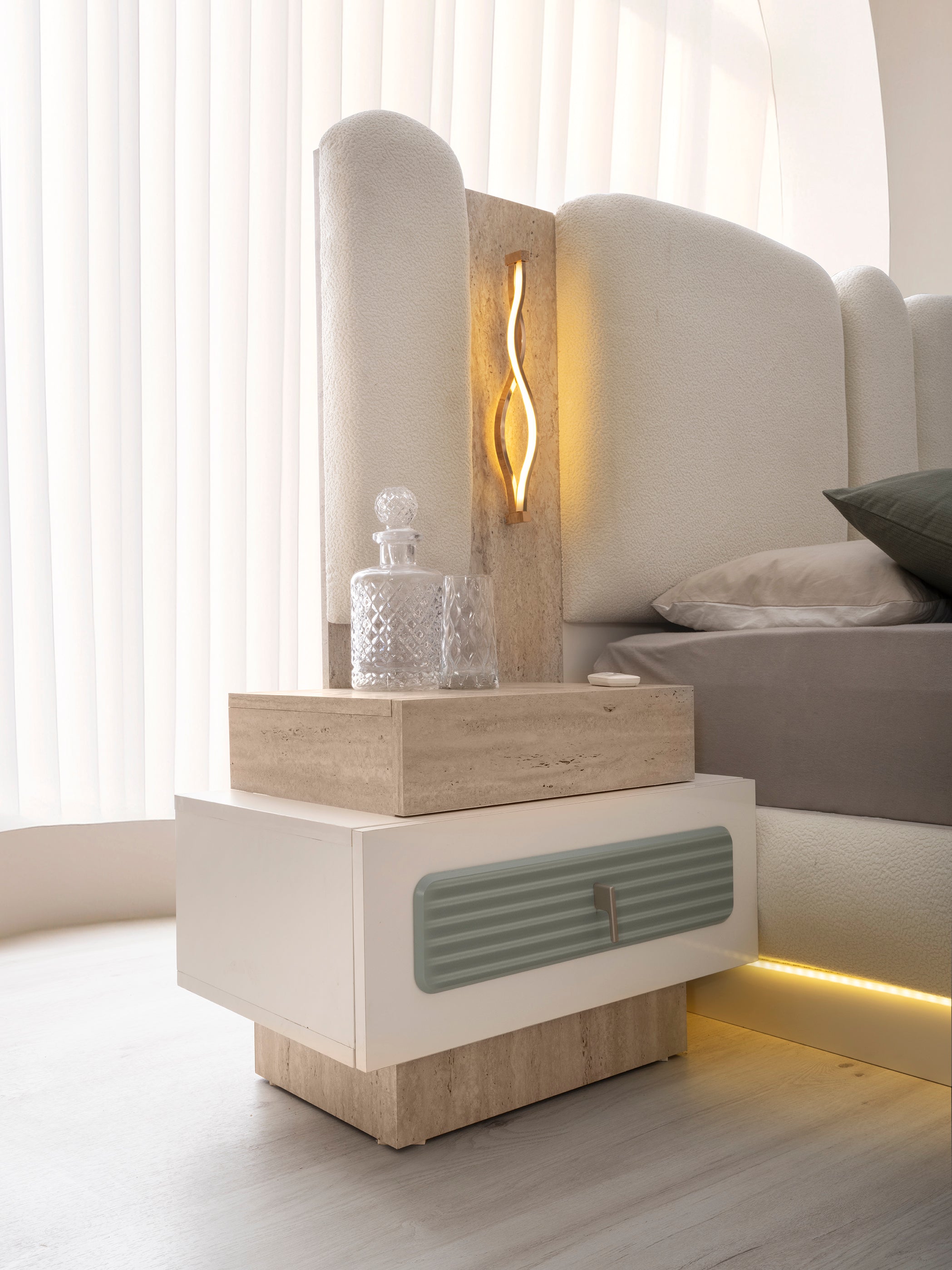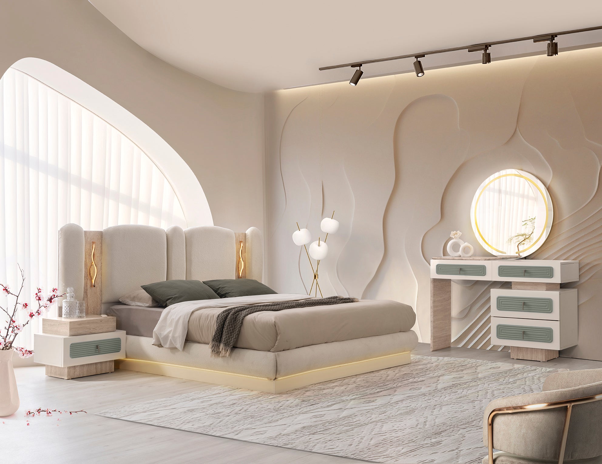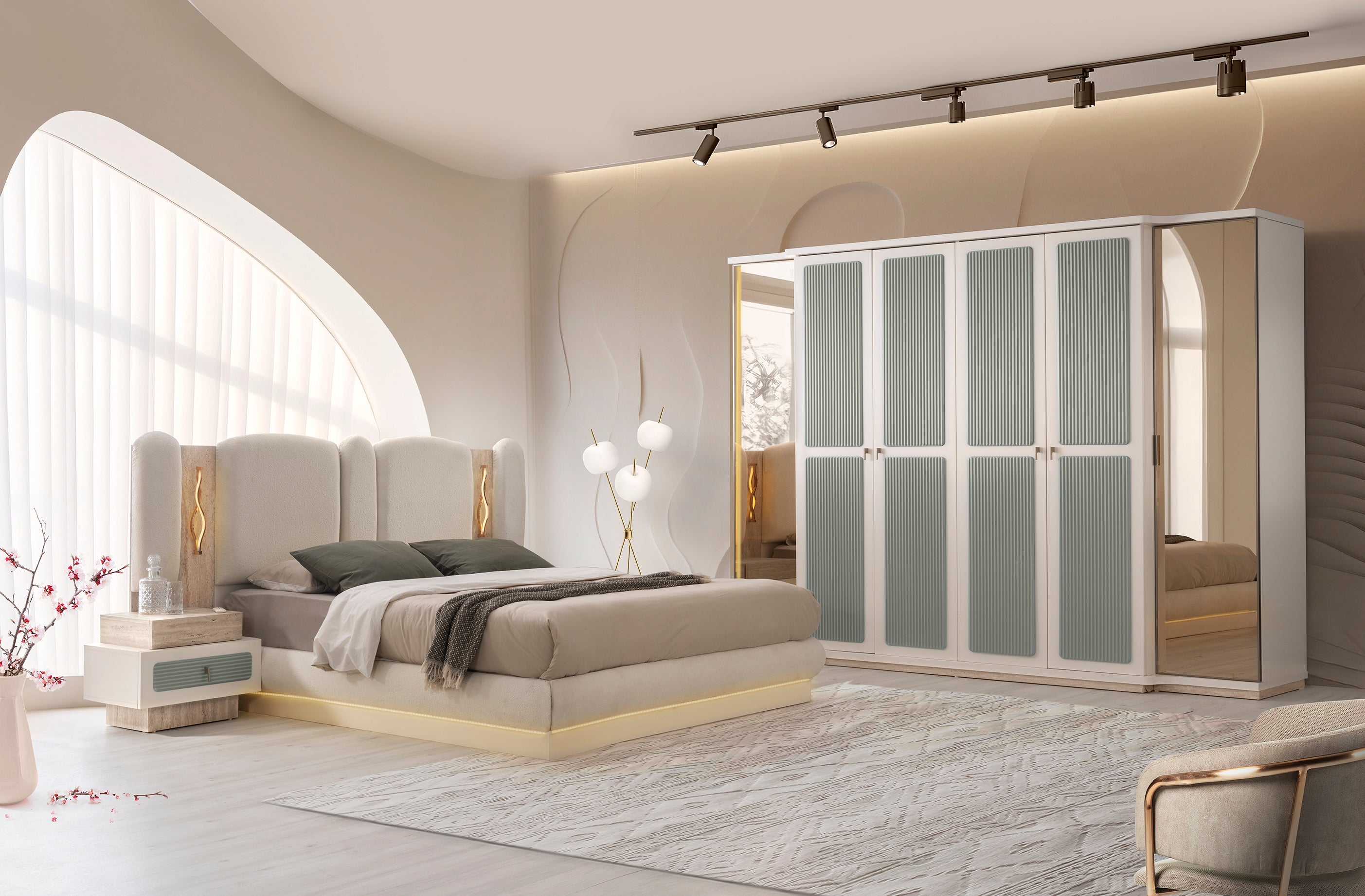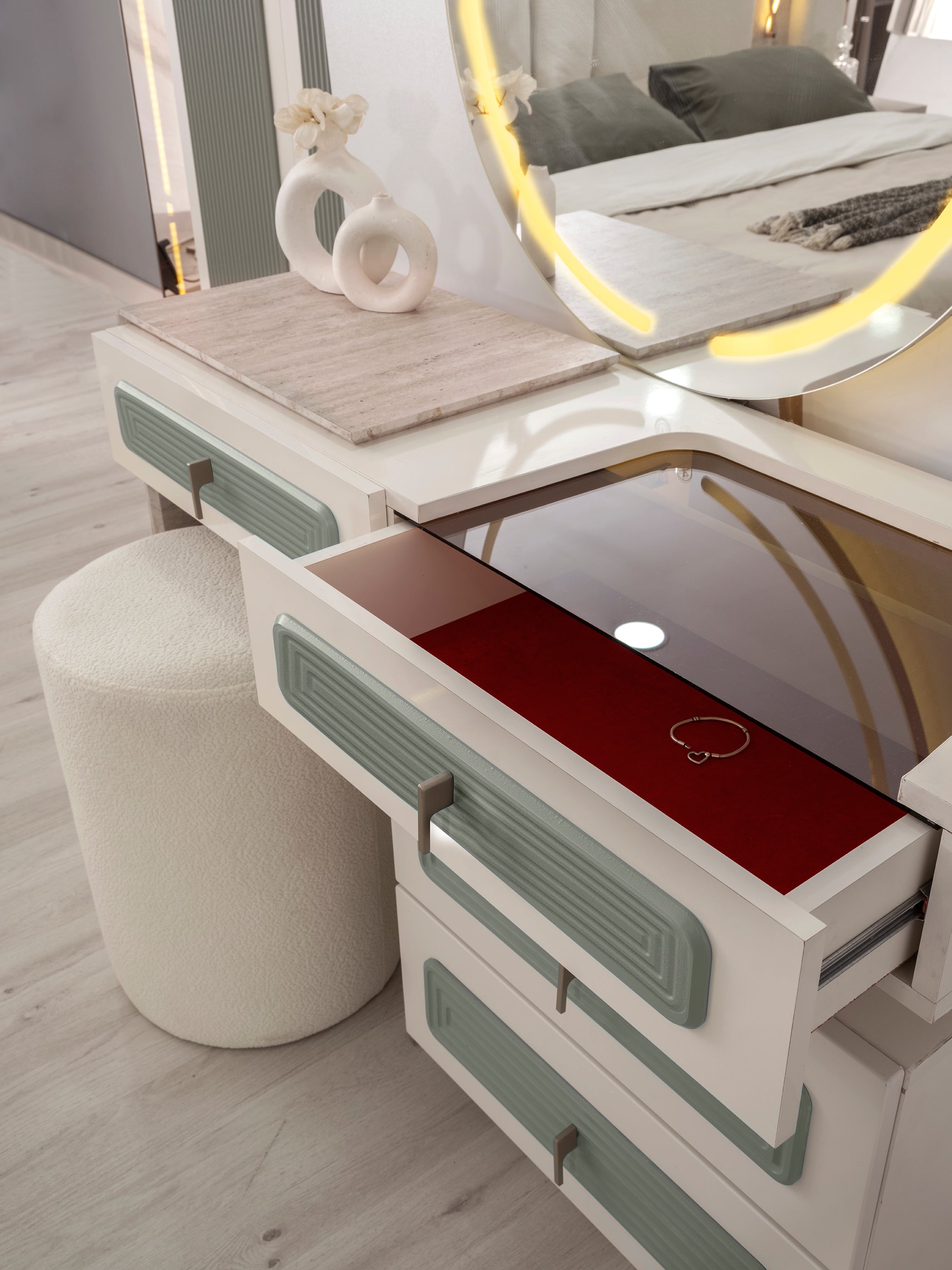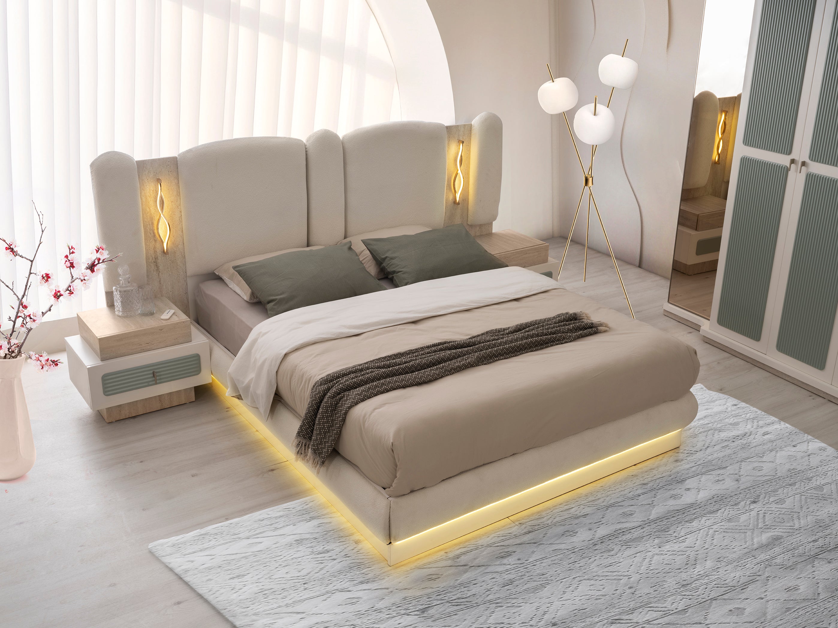 Спален комплект Тюркоаз е с модерен и луксозен дизайн. Комплектът включва легло, гардероб, тоалетка и нощни шкафчета. Мебелите са в елегантен цвят тюркоаз, в комбинация с детайли в цвят дърво и златни акценти.