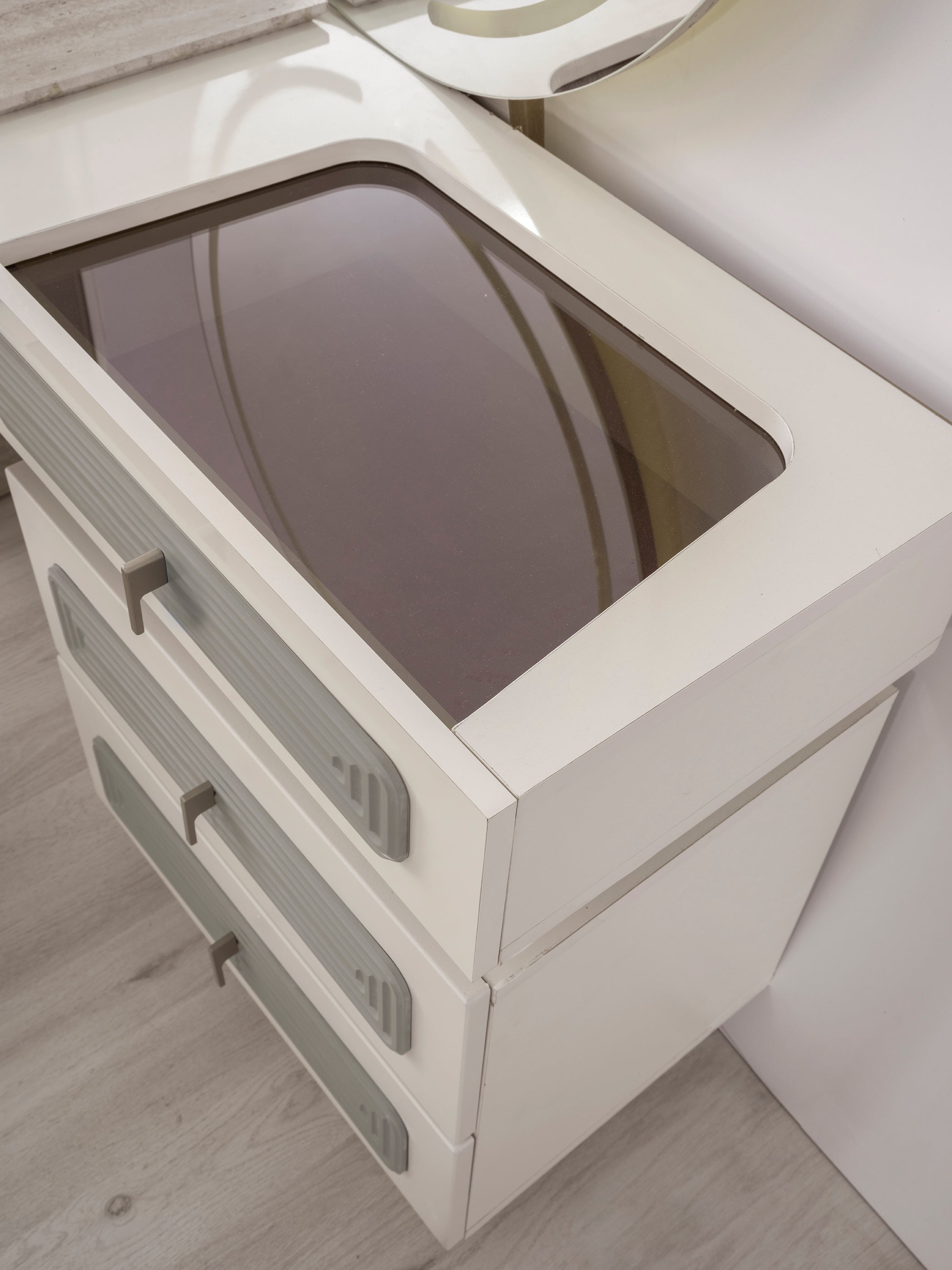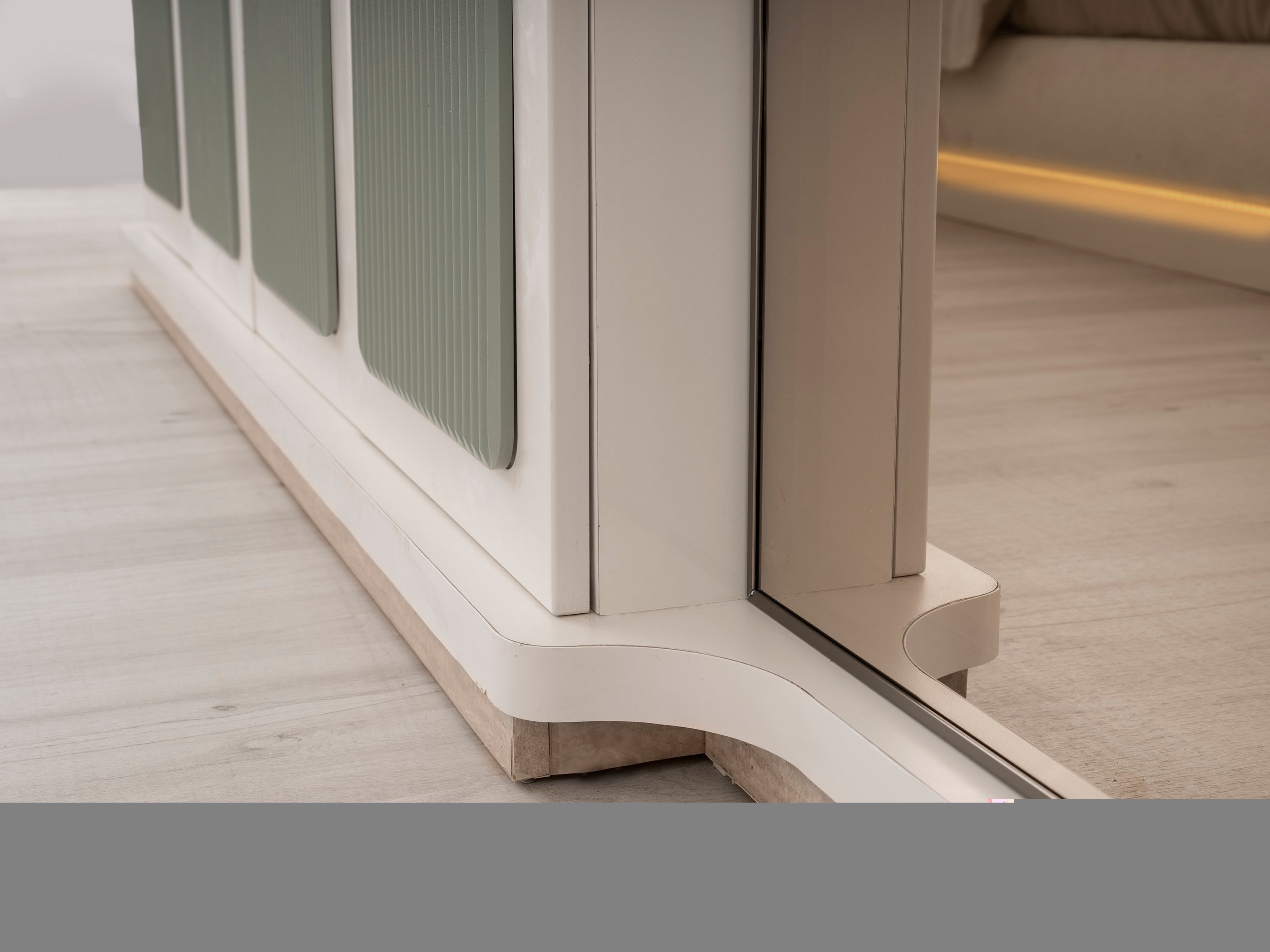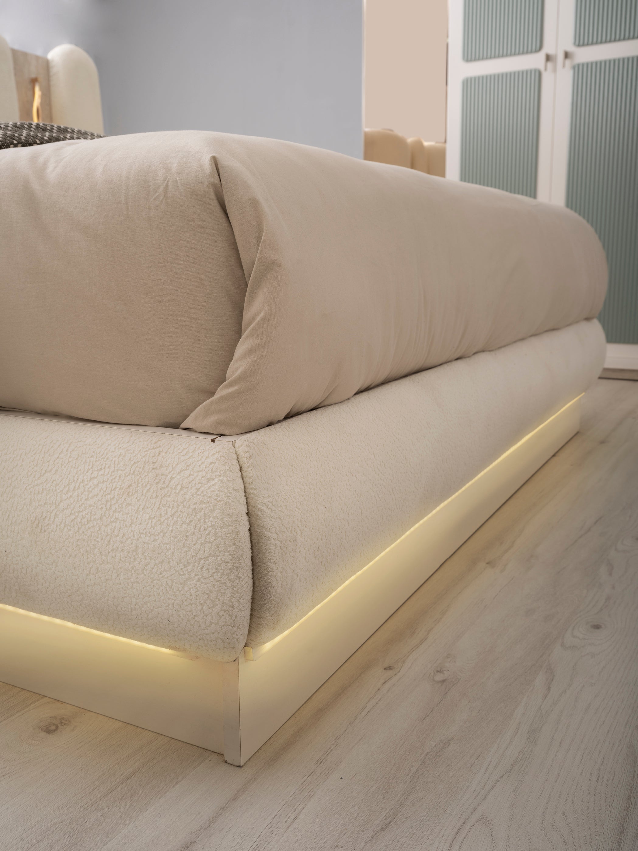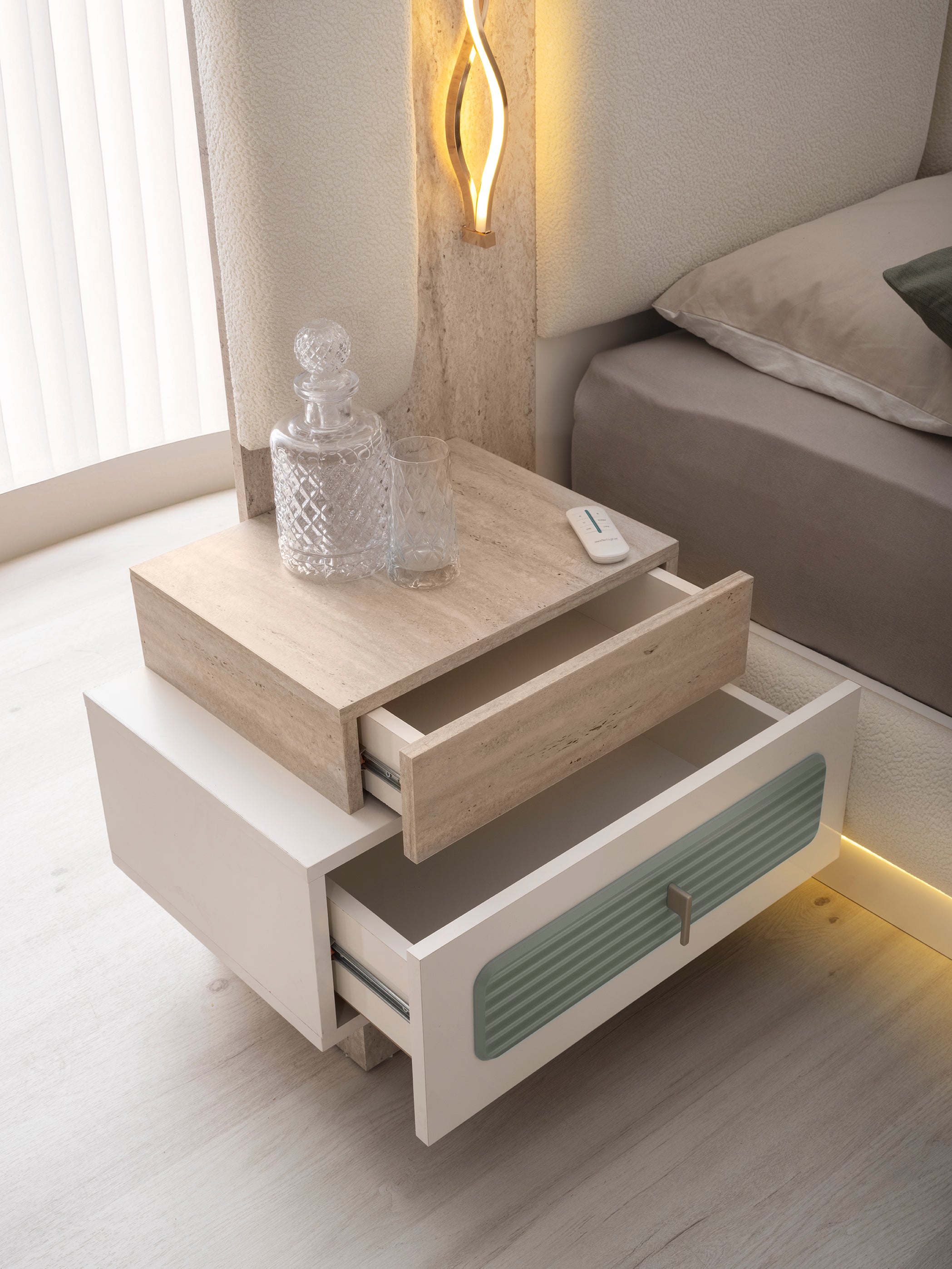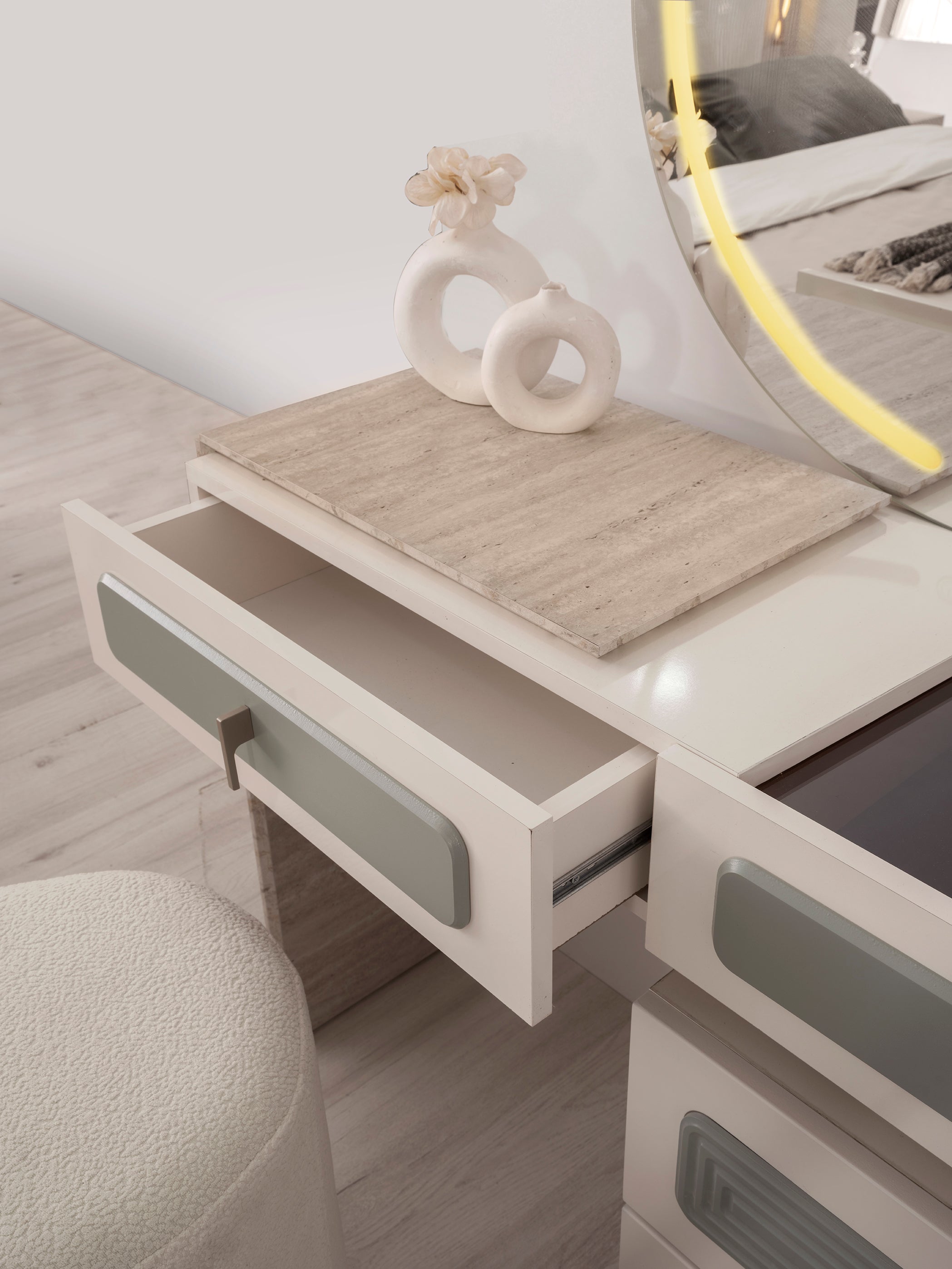 Спален комплект Тюркоаз е с модерен и луксозен дизайн. Комплектът включва легло, гардероб, тоалетка и нощни шкафчета. Мебелите са в елегантен цвят тюркоаз, в комбинация с детайли в цвят дърво и златни акценти.