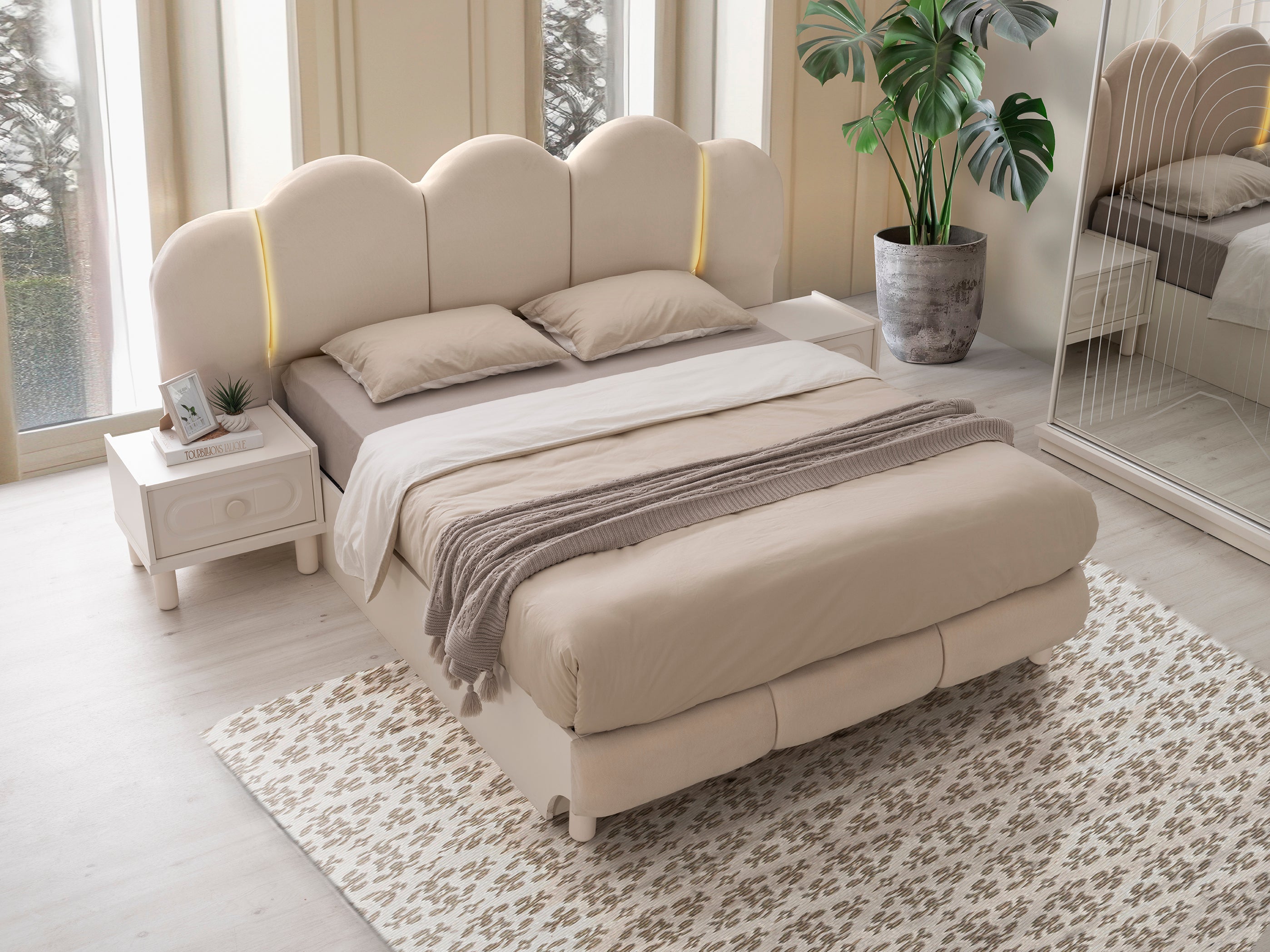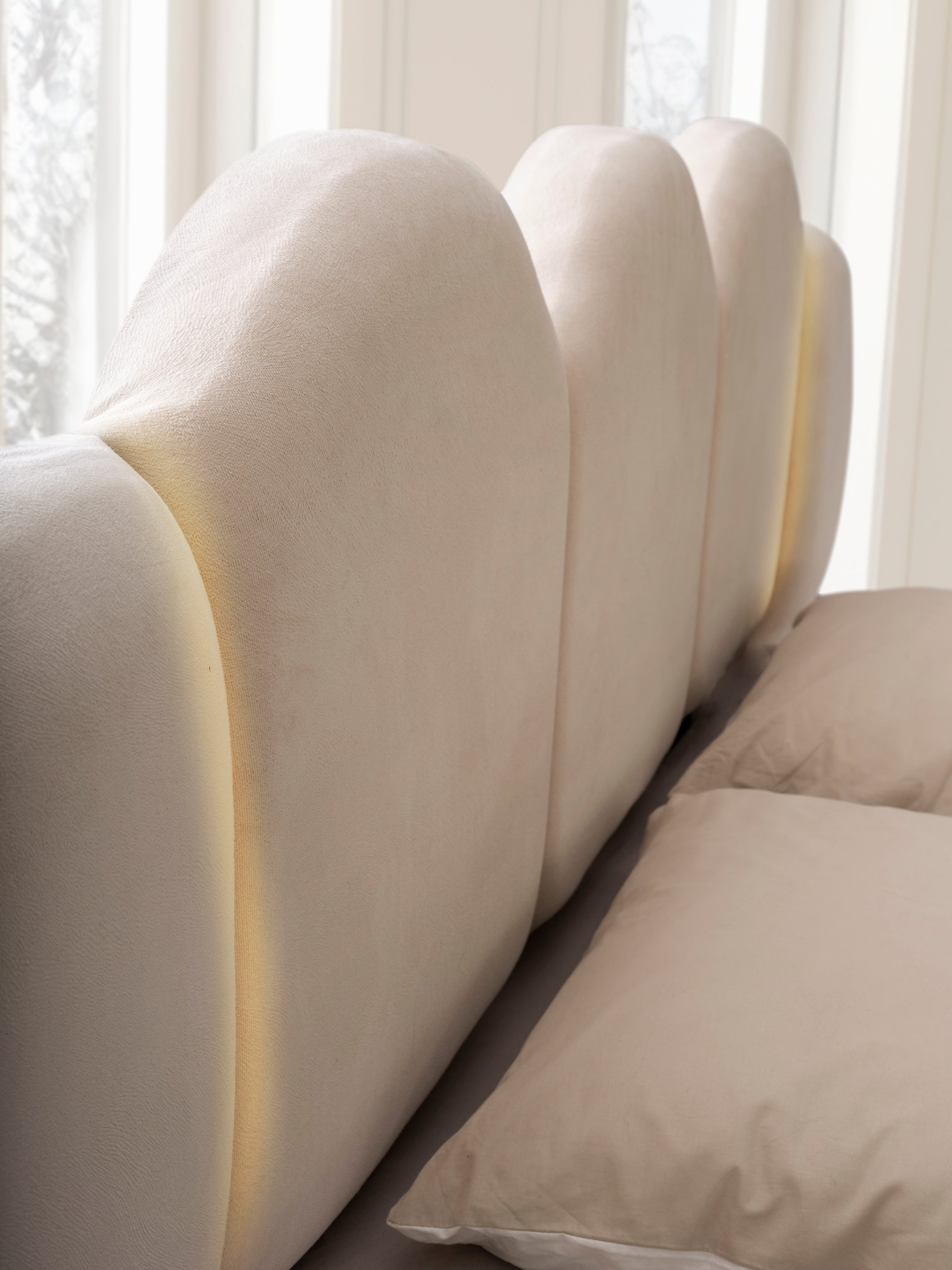 o Мека тапицирана табла с вълнообразни форми и вградено LED осветление.