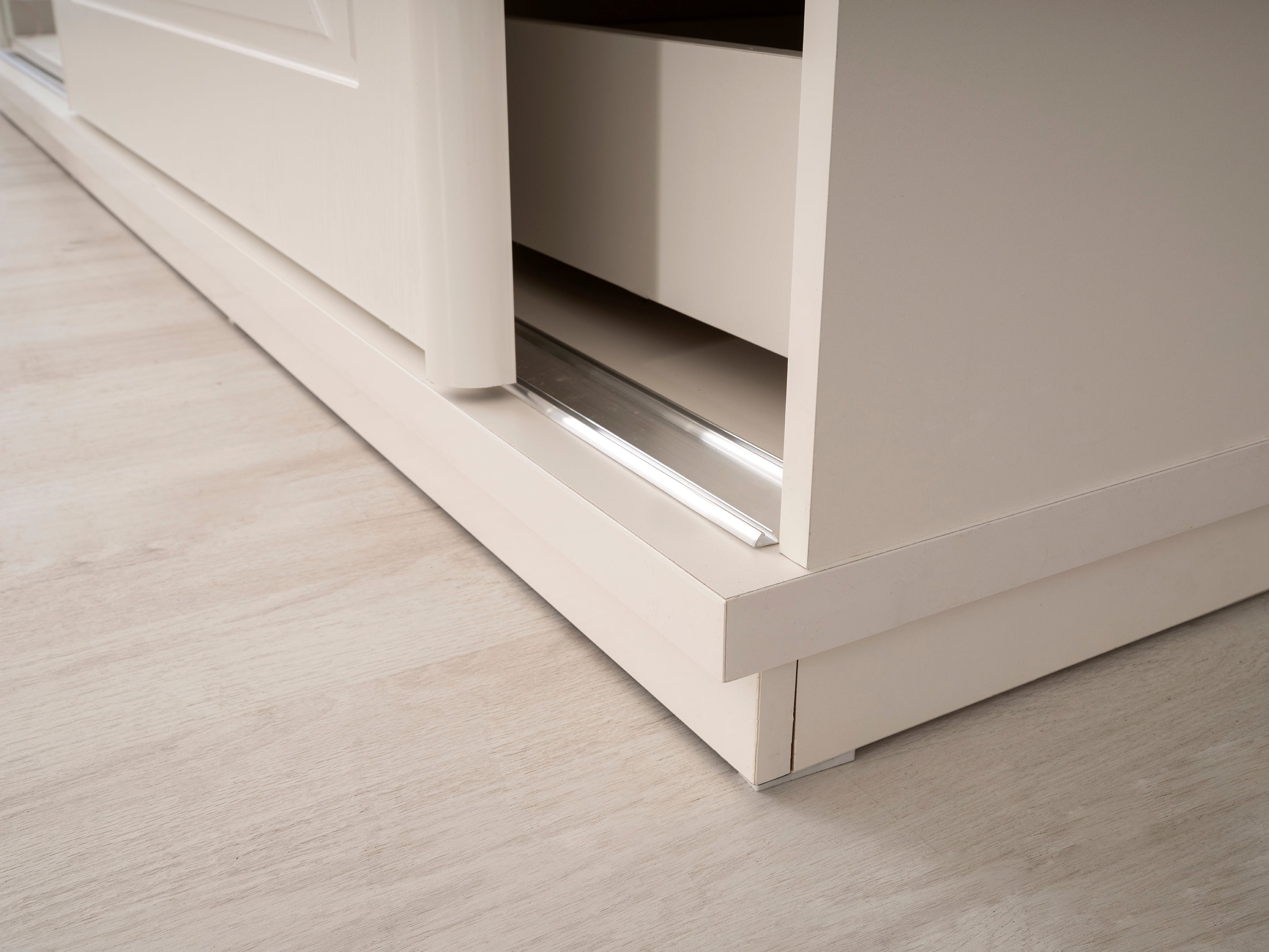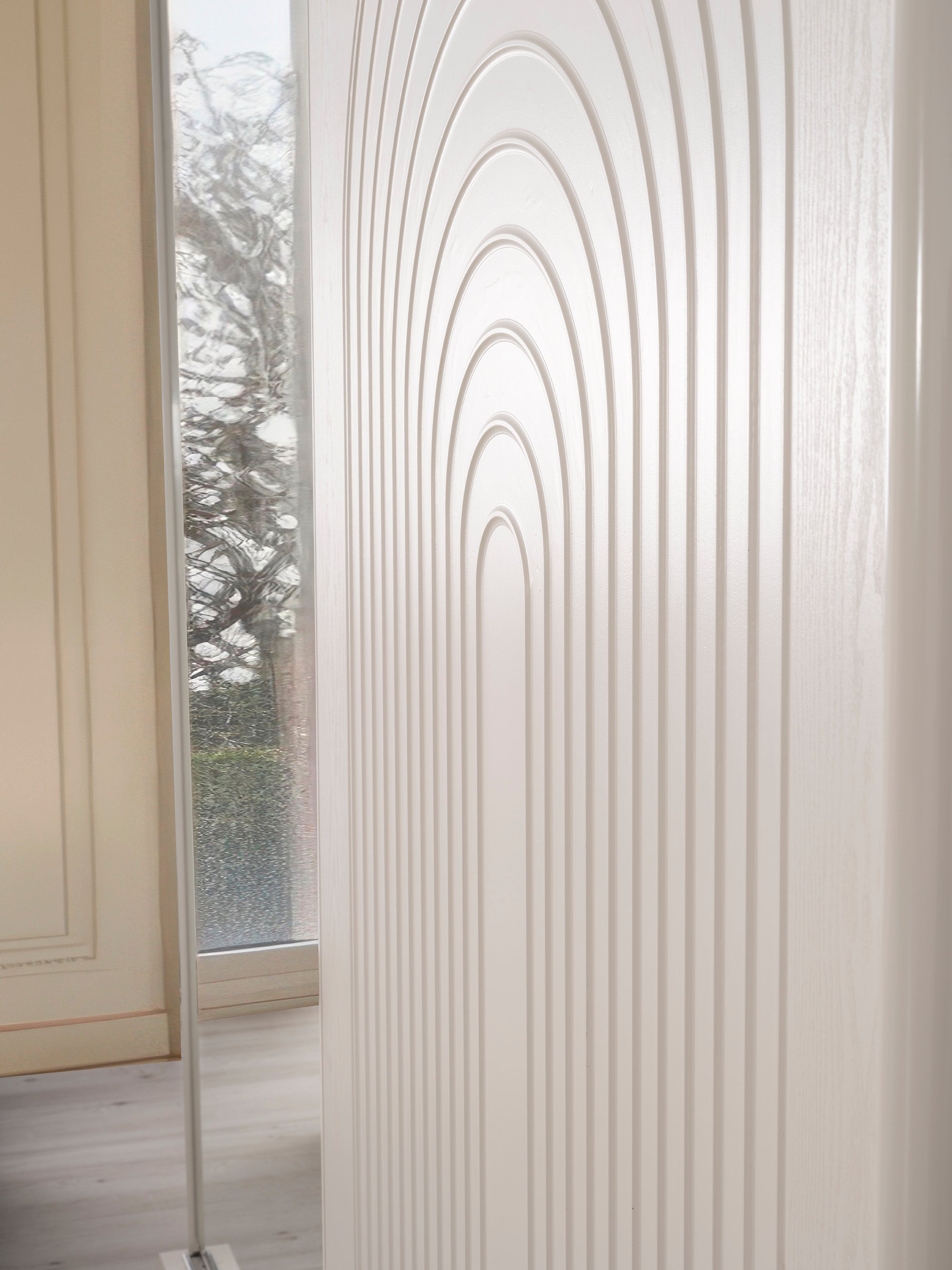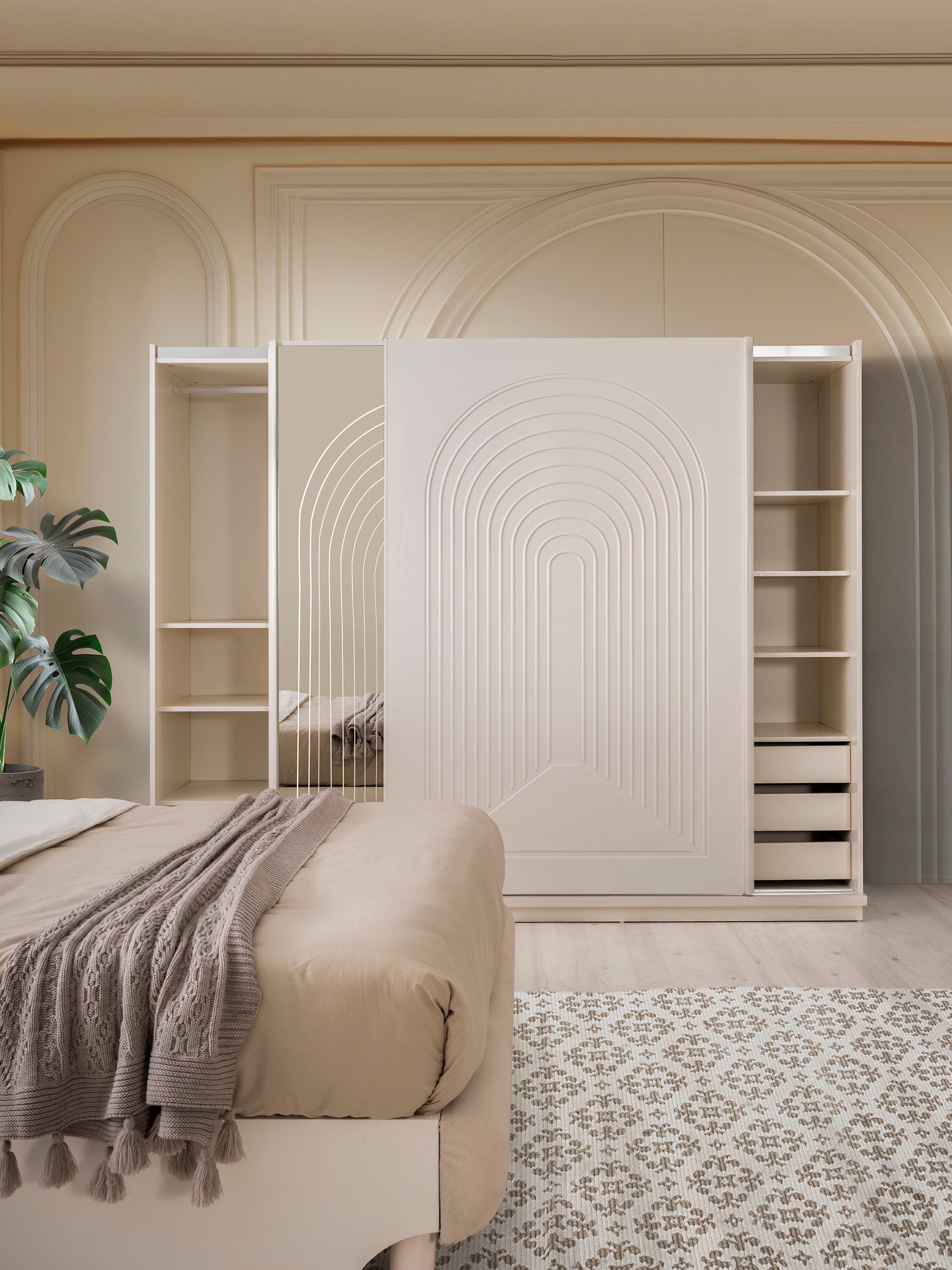 o Гардероб с плъзгащи врати. Едната врата е с огледало, а другата е с декоративни вдлъбнатини в долната част.