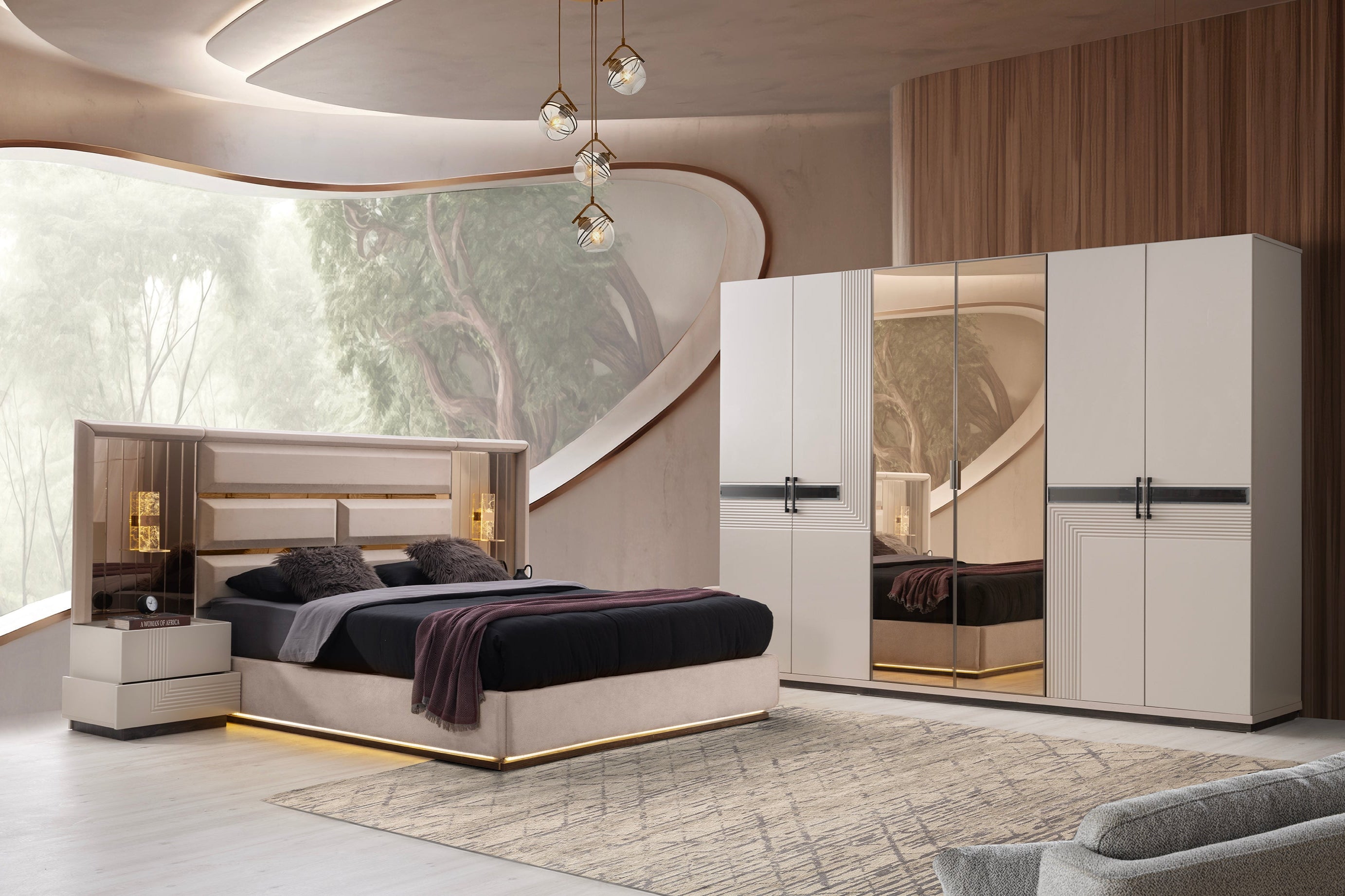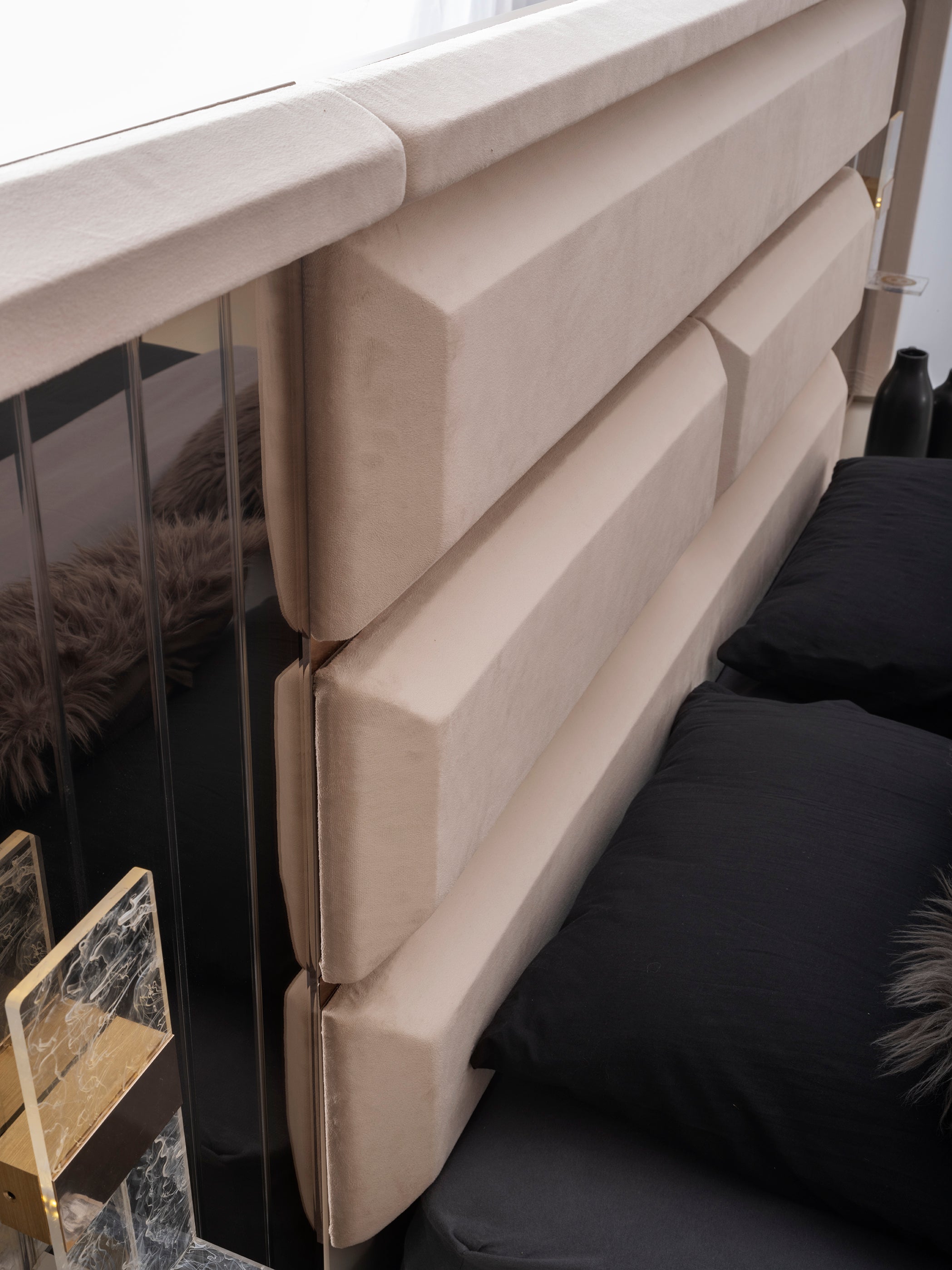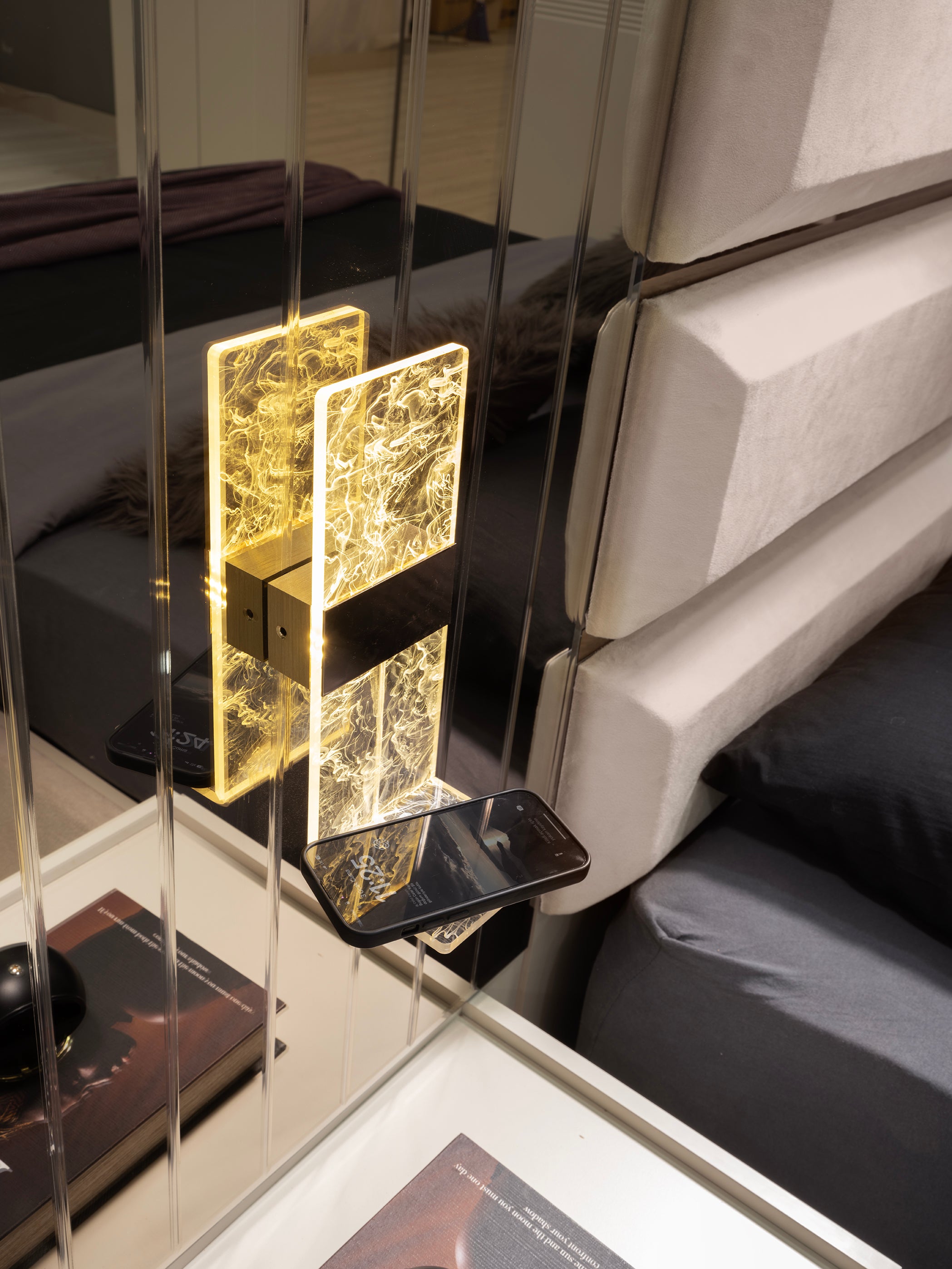 Легло с тапицирана табла с геометрични форми. Таблата има огледални панели и вградени осветителни тела с уникален дизайн.