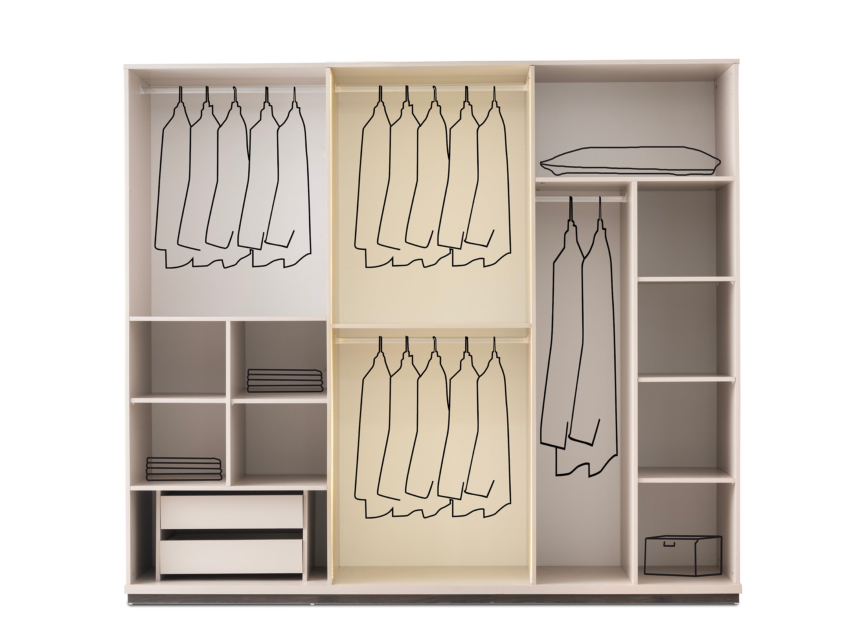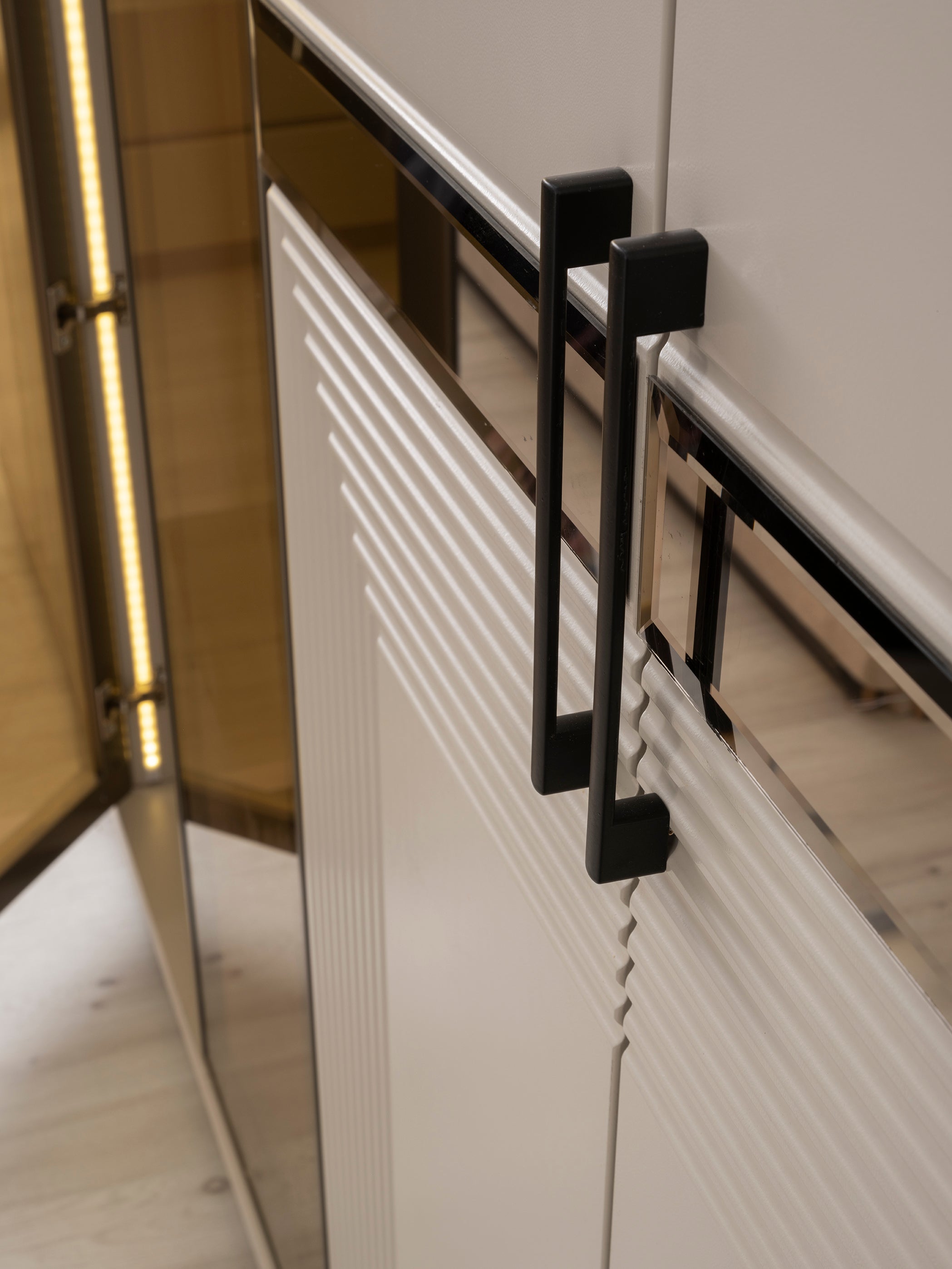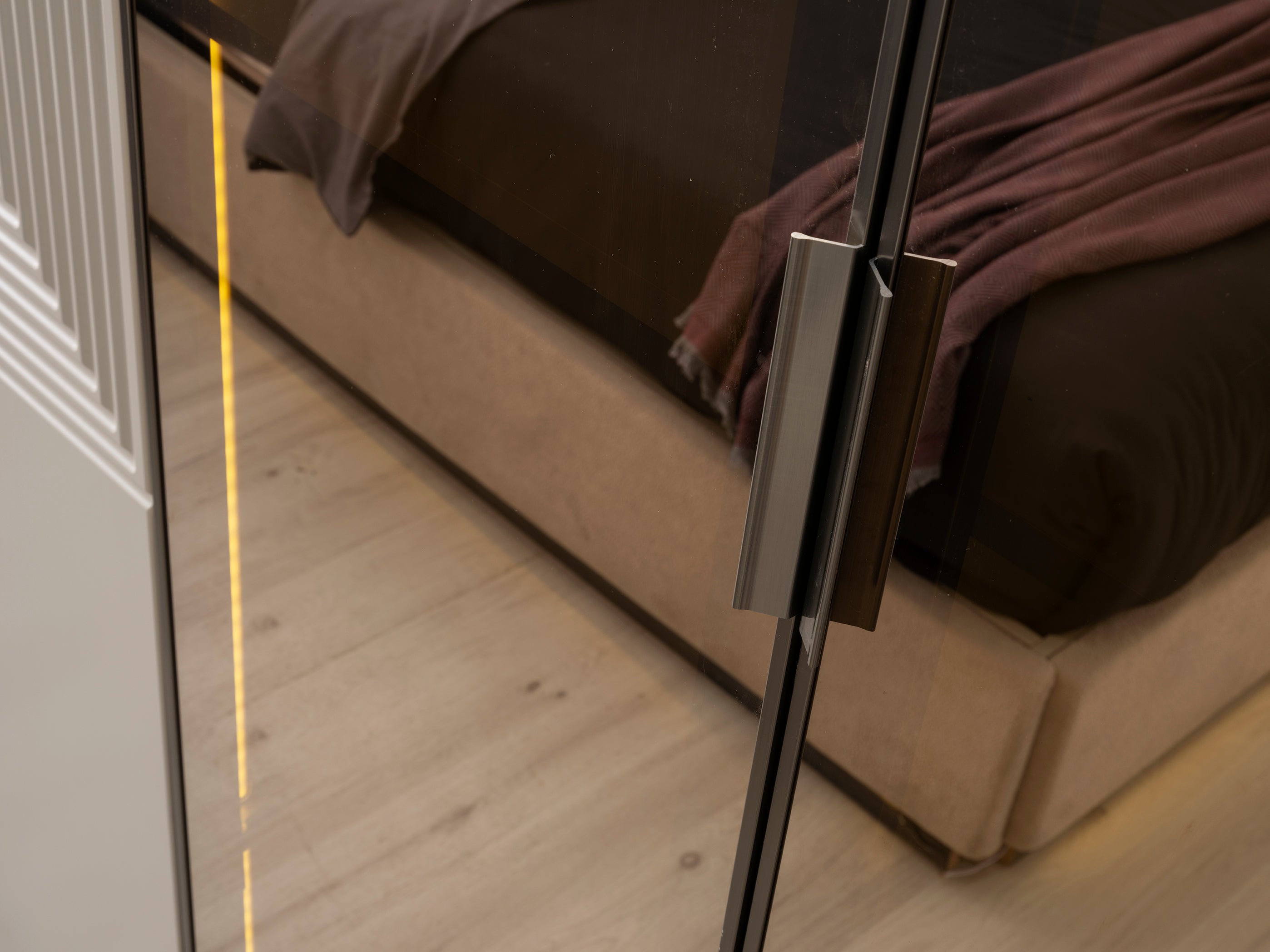 Голям гардероб с комбинирани врати - огледални и в светли тонове. Дръжките са в черен цвят.