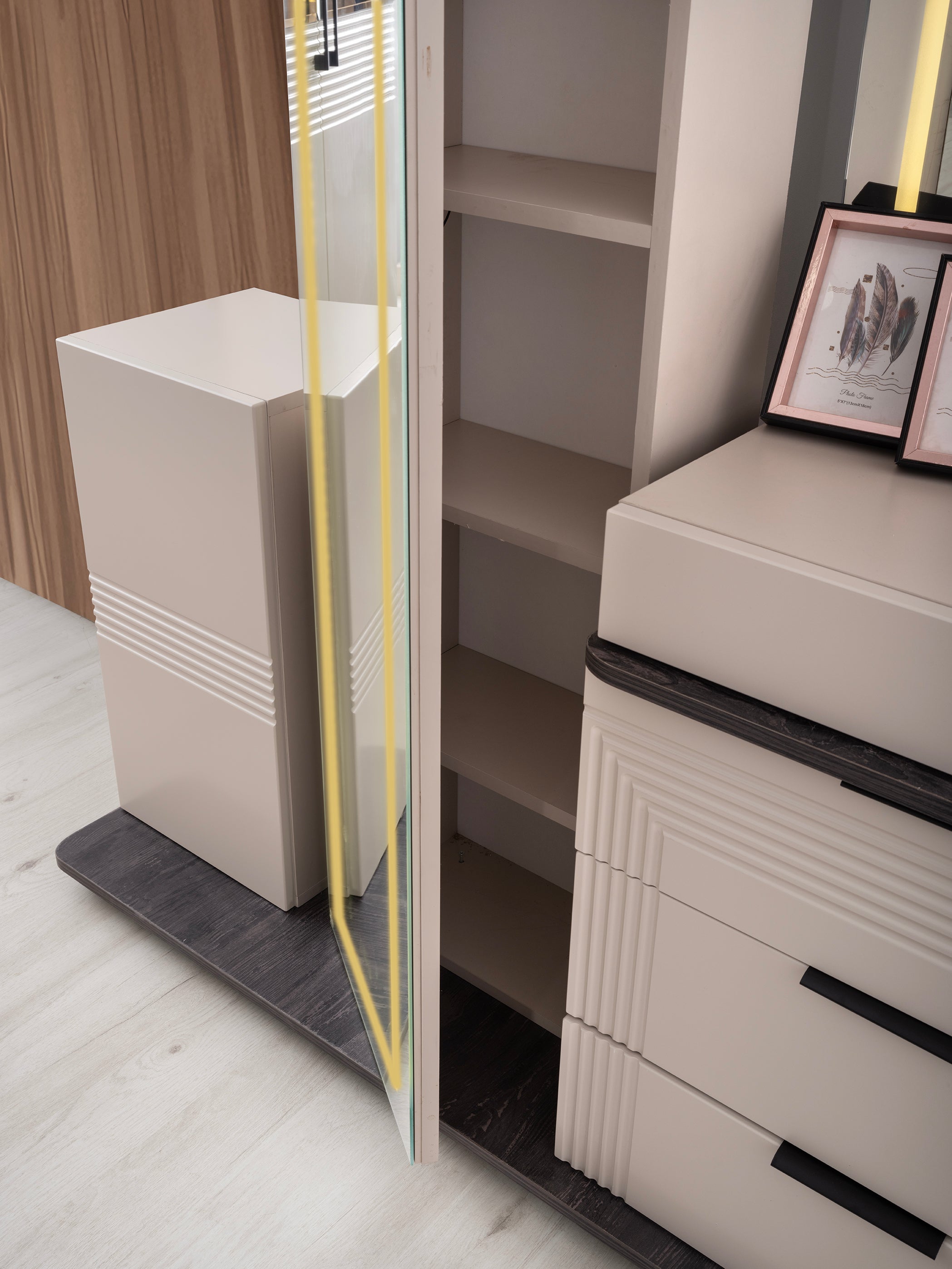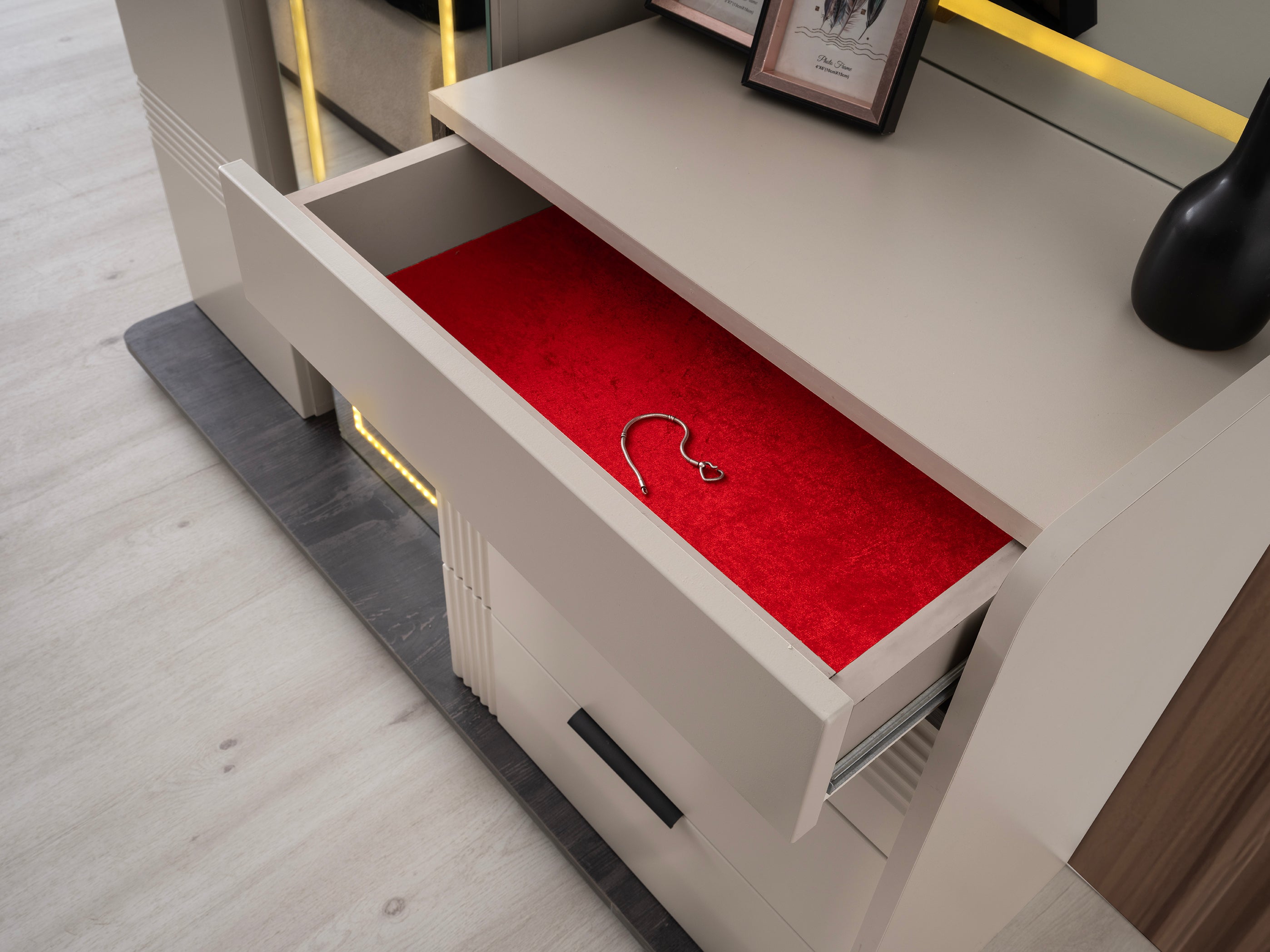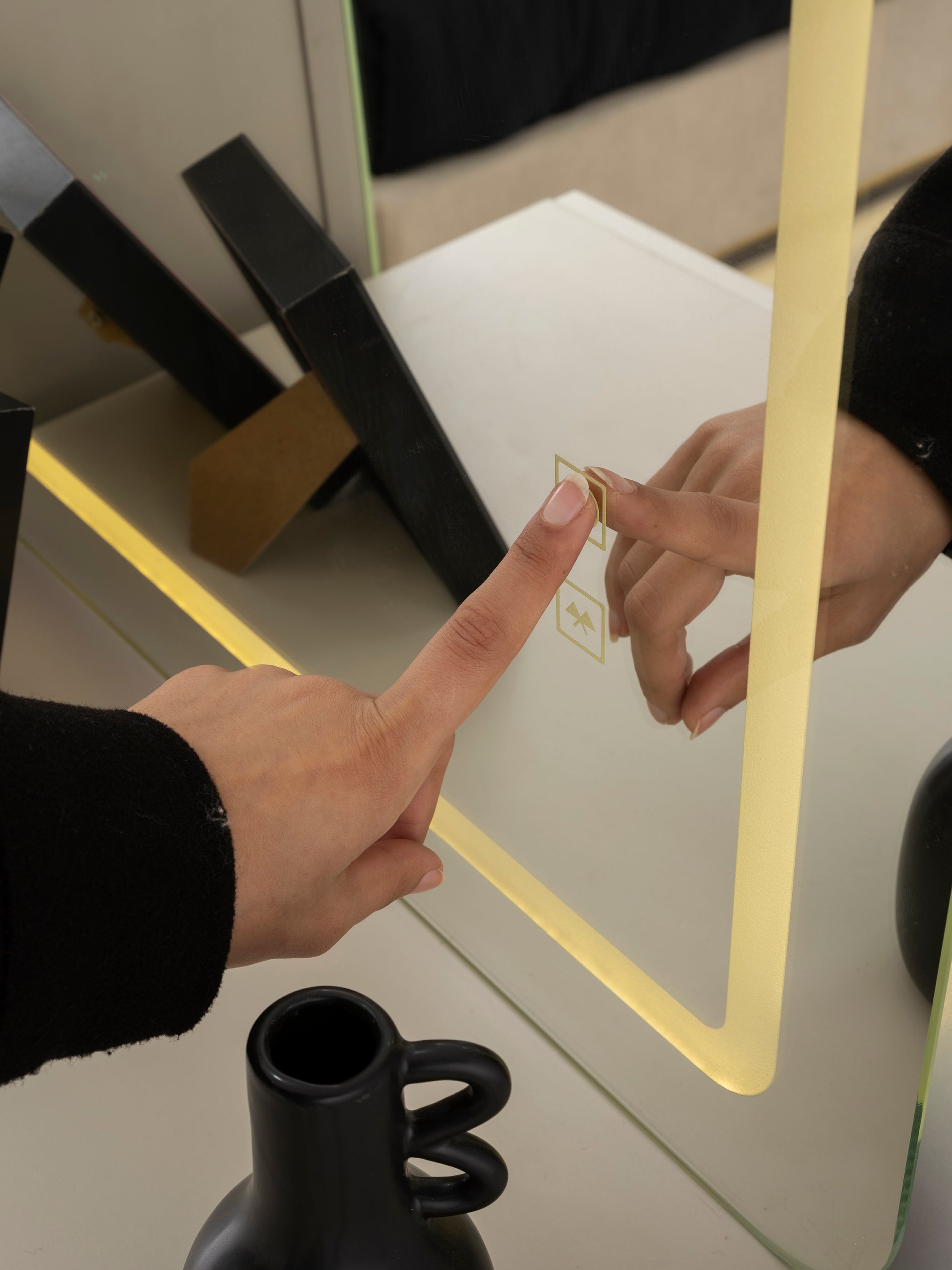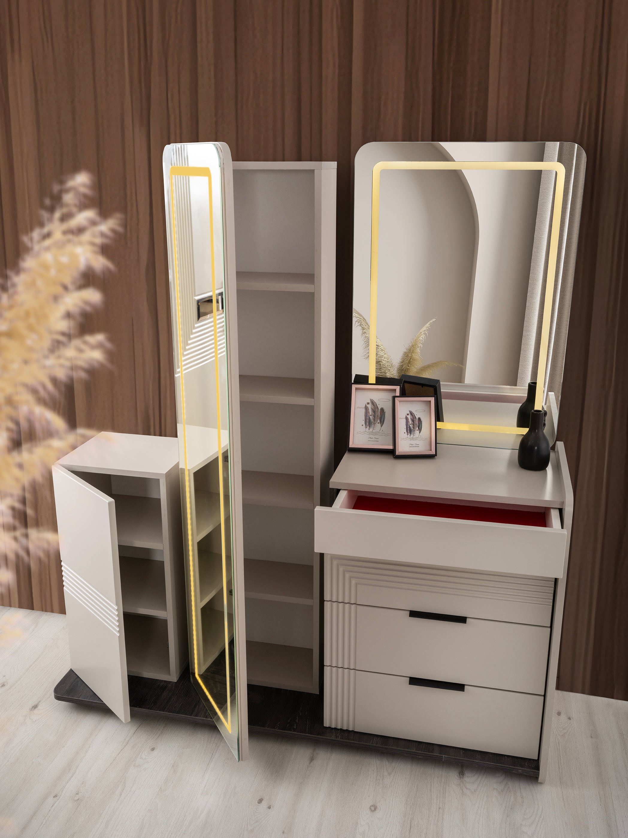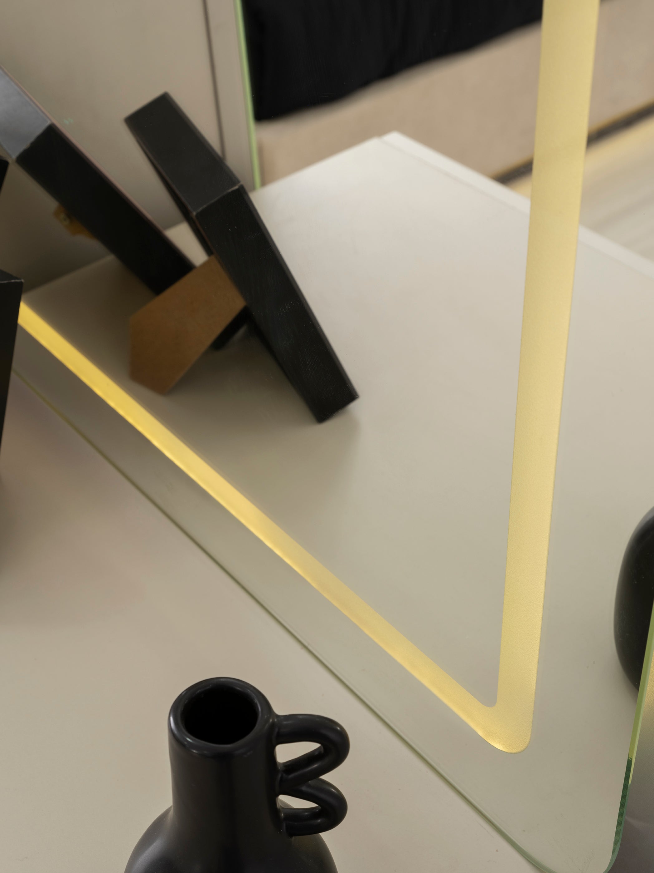 Маса с огледало от три части. Страничните огледала имат вградено осветление.