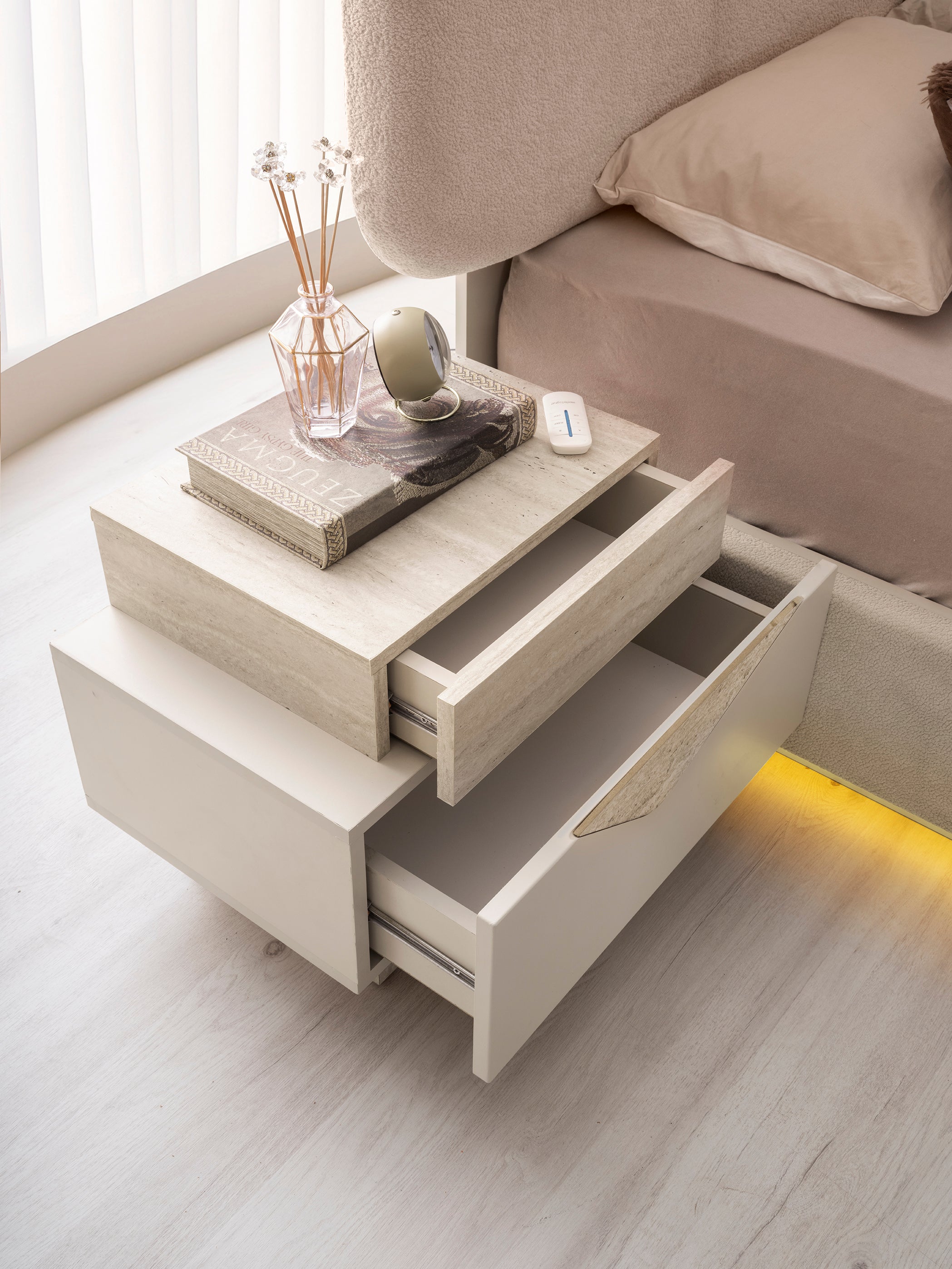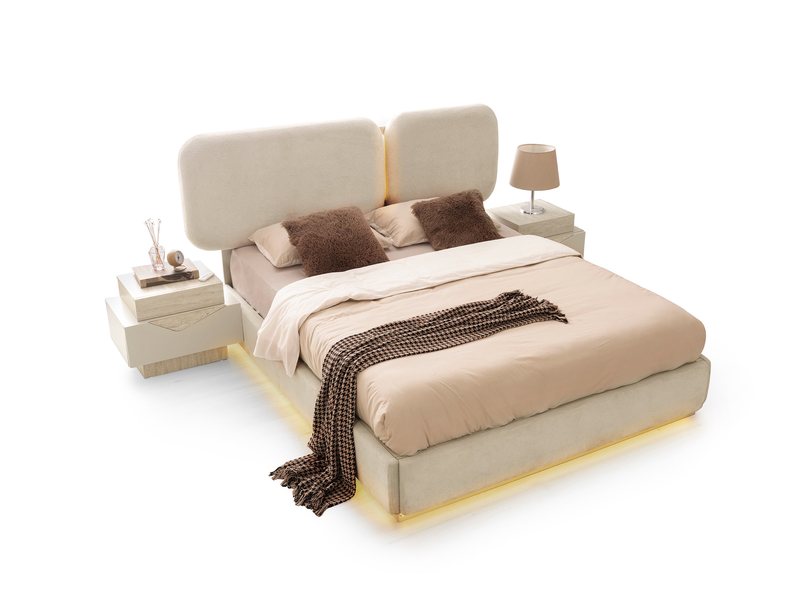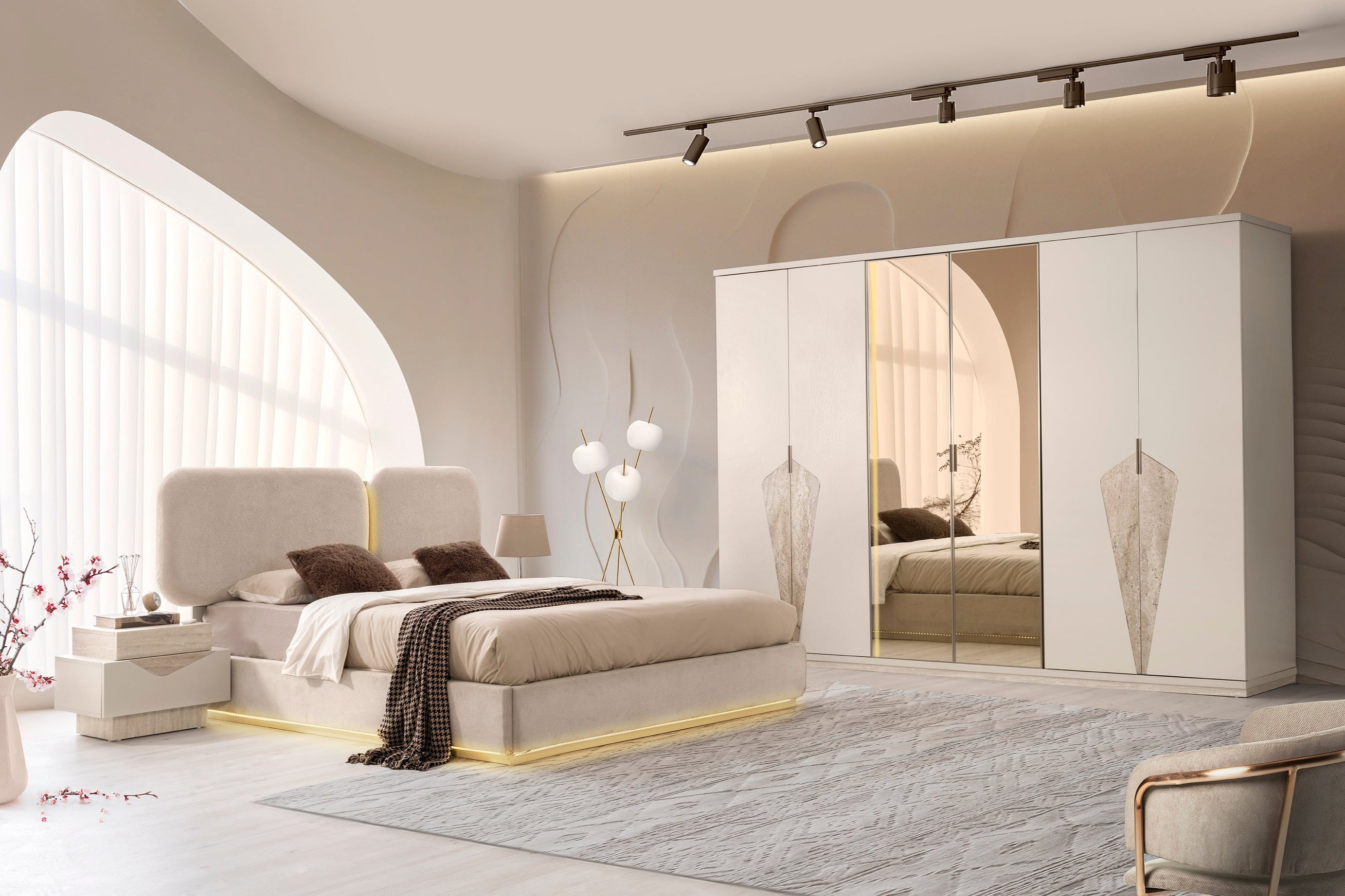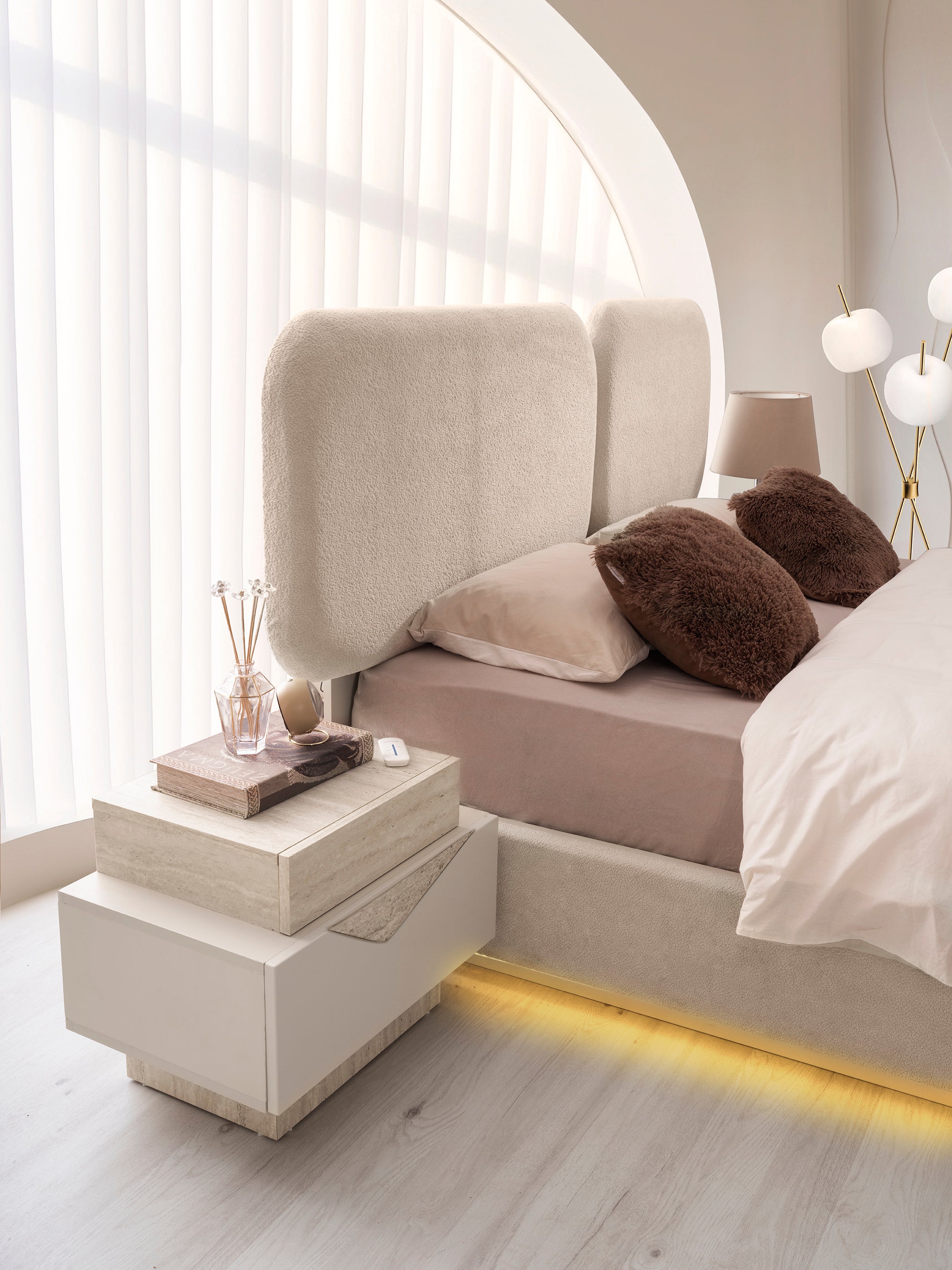 Спален комплект Фас е с модерен и мек дизайн, вдъхновен от органични форми. Комплектът включва легло, гардероб и нощни шкафчета. Мебелите са в светли, неутрални тонове с уникални текстурирани детайли и вградено LED осветление.
