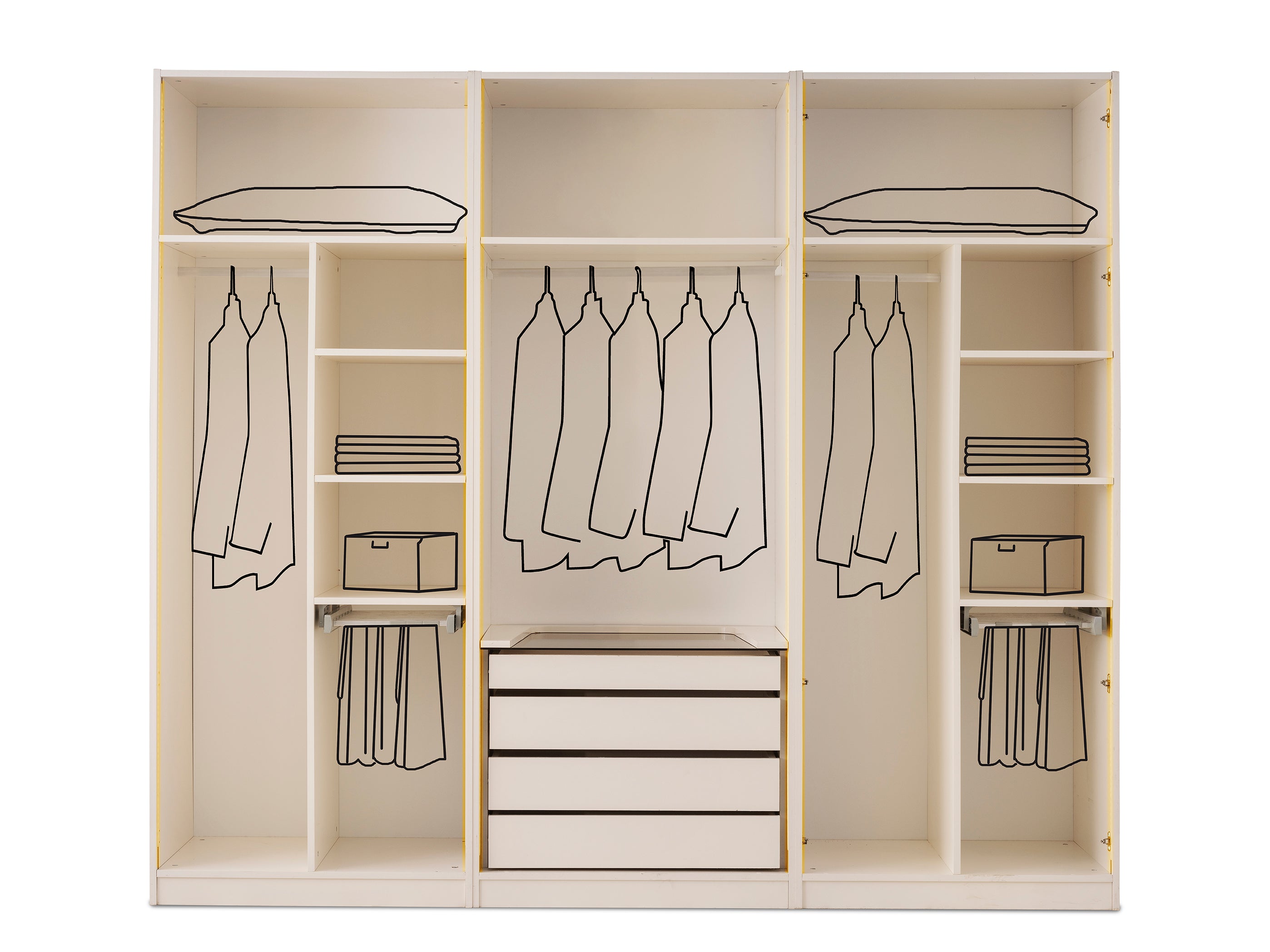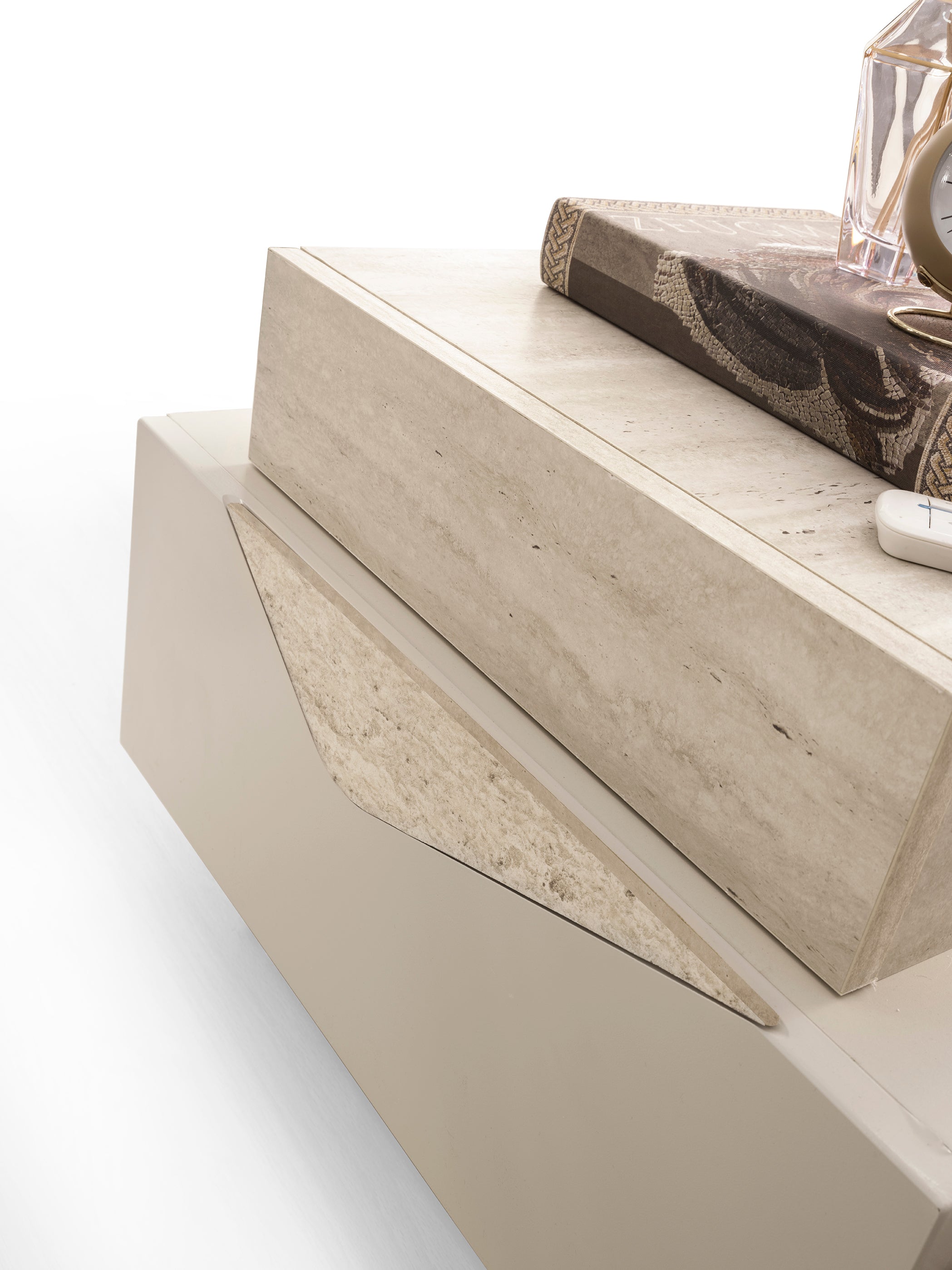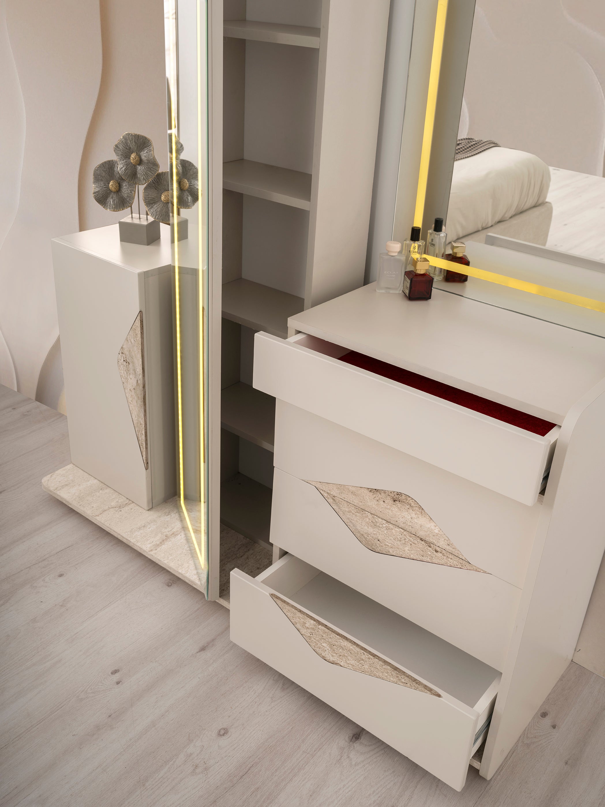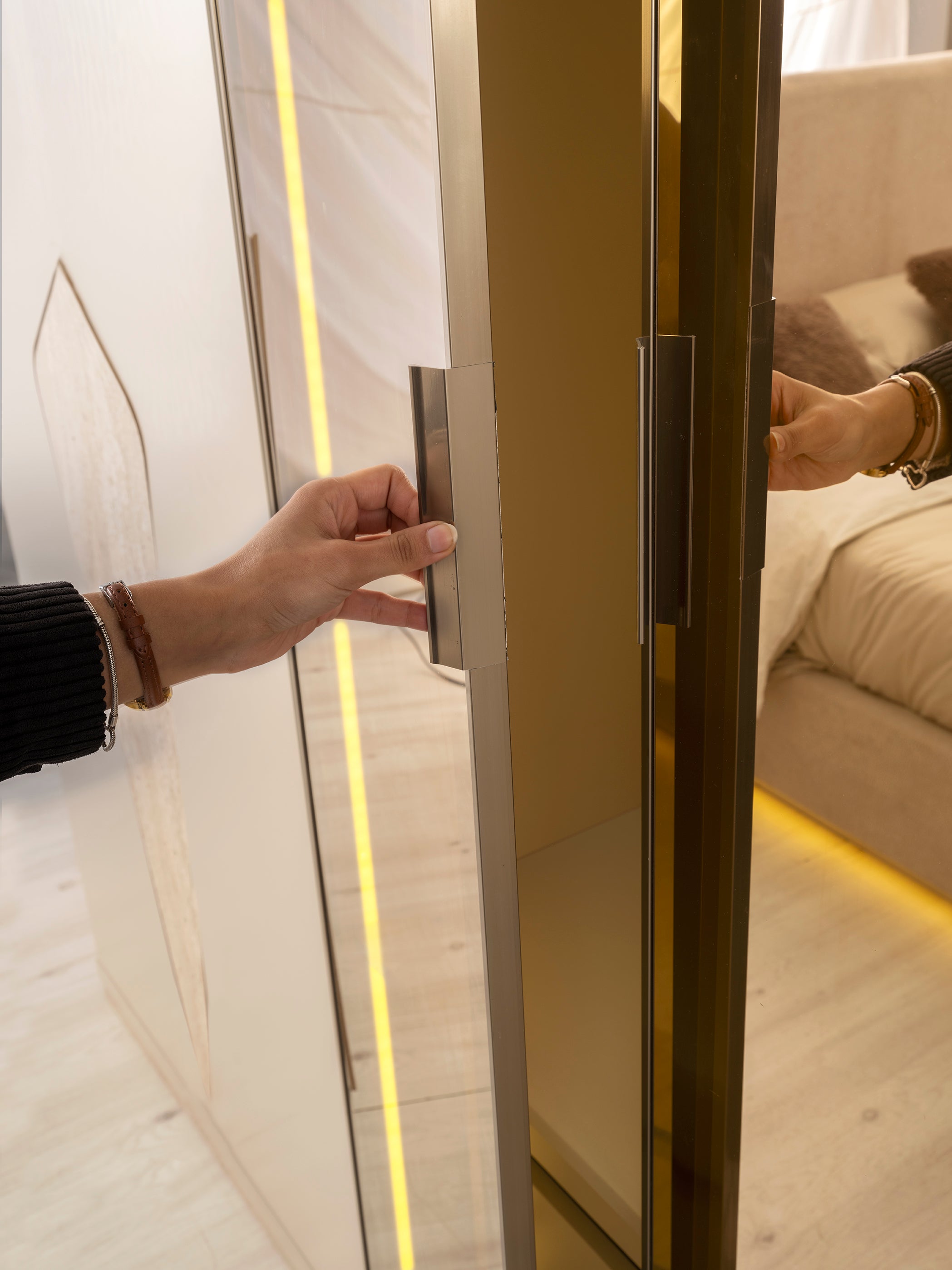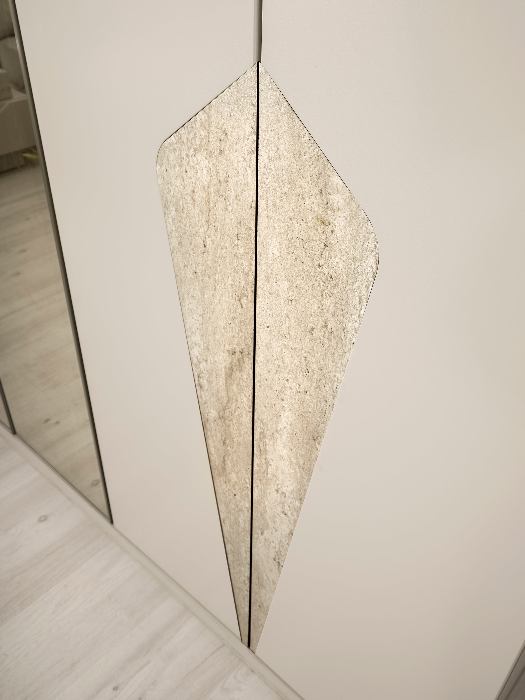 Спален комплект Фас е с модерен и мек дизайн, вдъхновен от органични форми. Комплектът включва легло, гардероб и нощни шкафчета. Мебелите са в светли, неутрални тонове с уникални текстурирани детайли и вградено LED осветление.