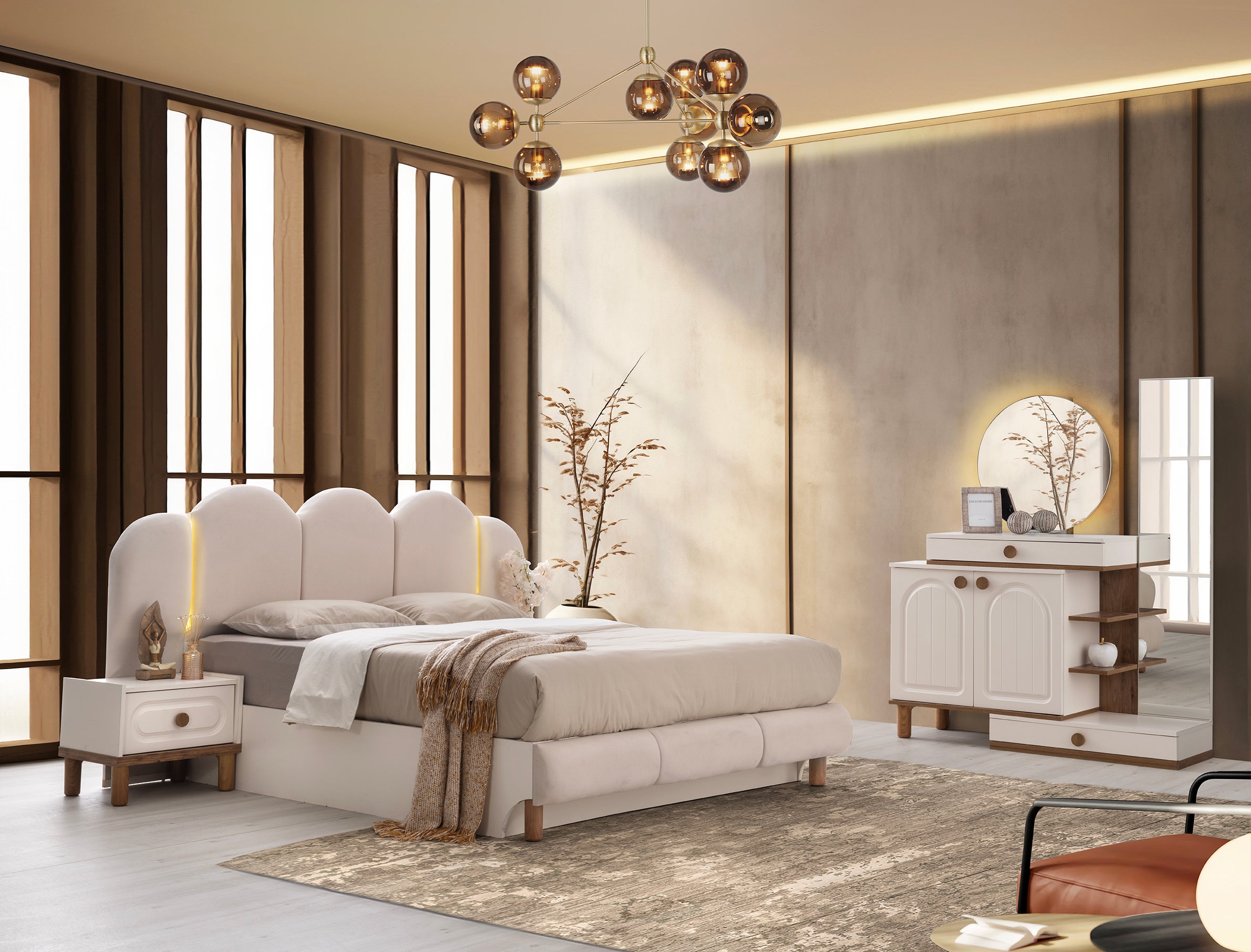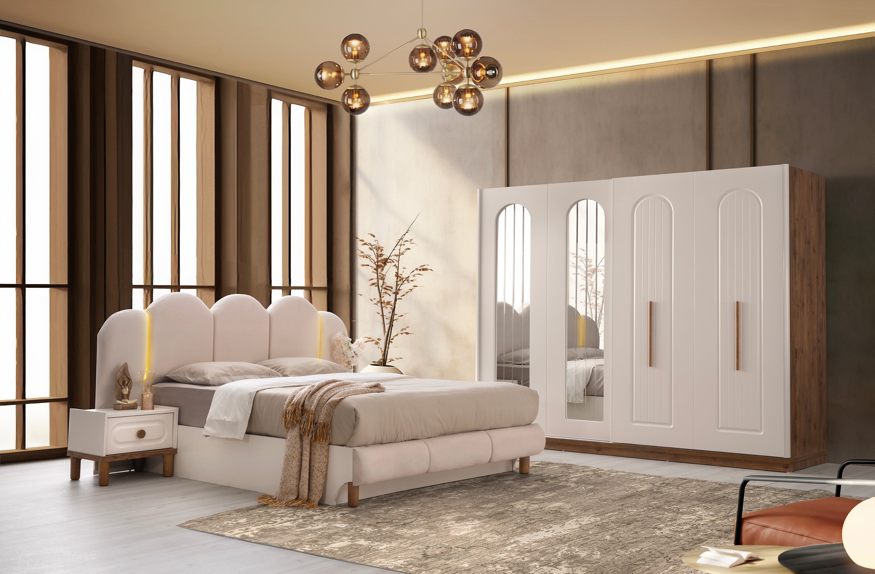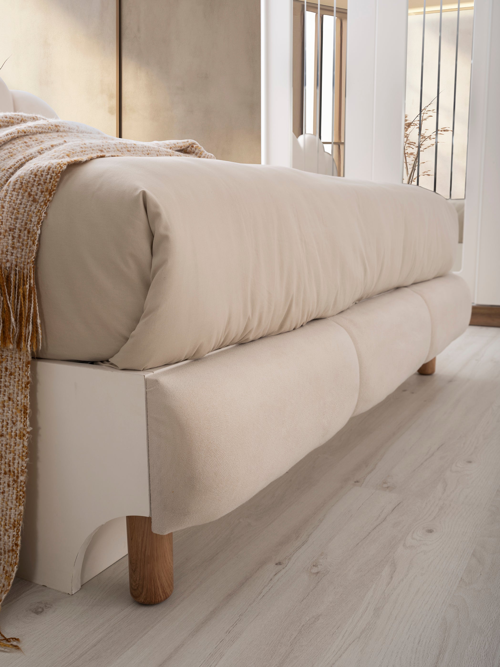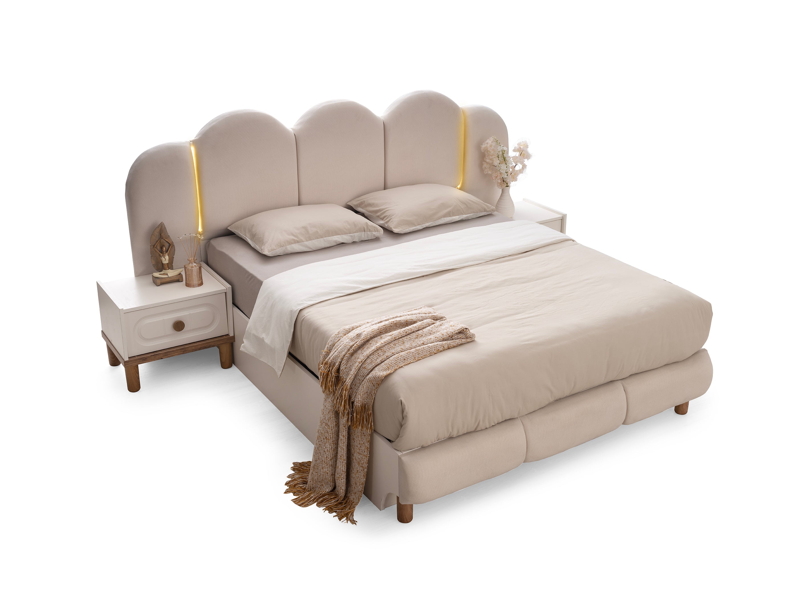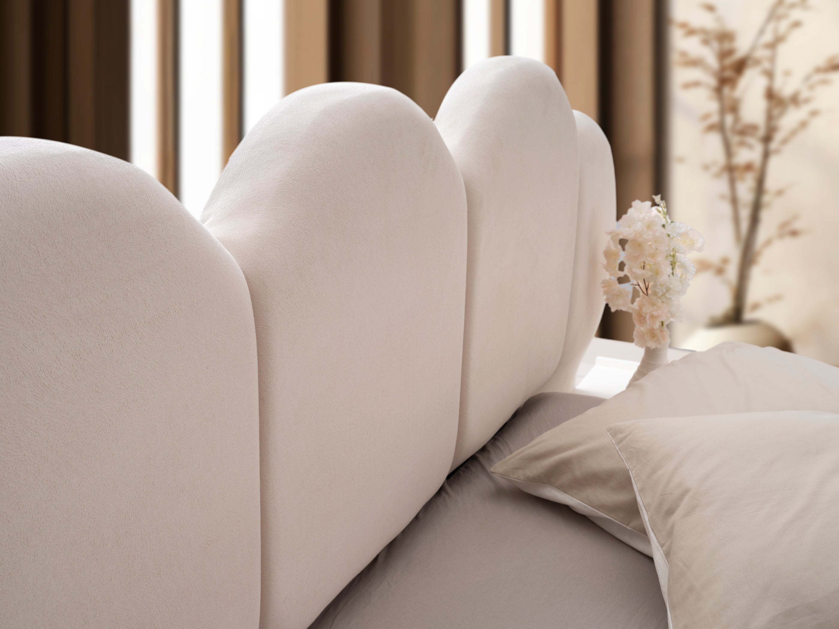 o Легло с висока табла, която е тапицирана с ромбовидна капитонация. Страничните части на леглото имат декоративни детайли.