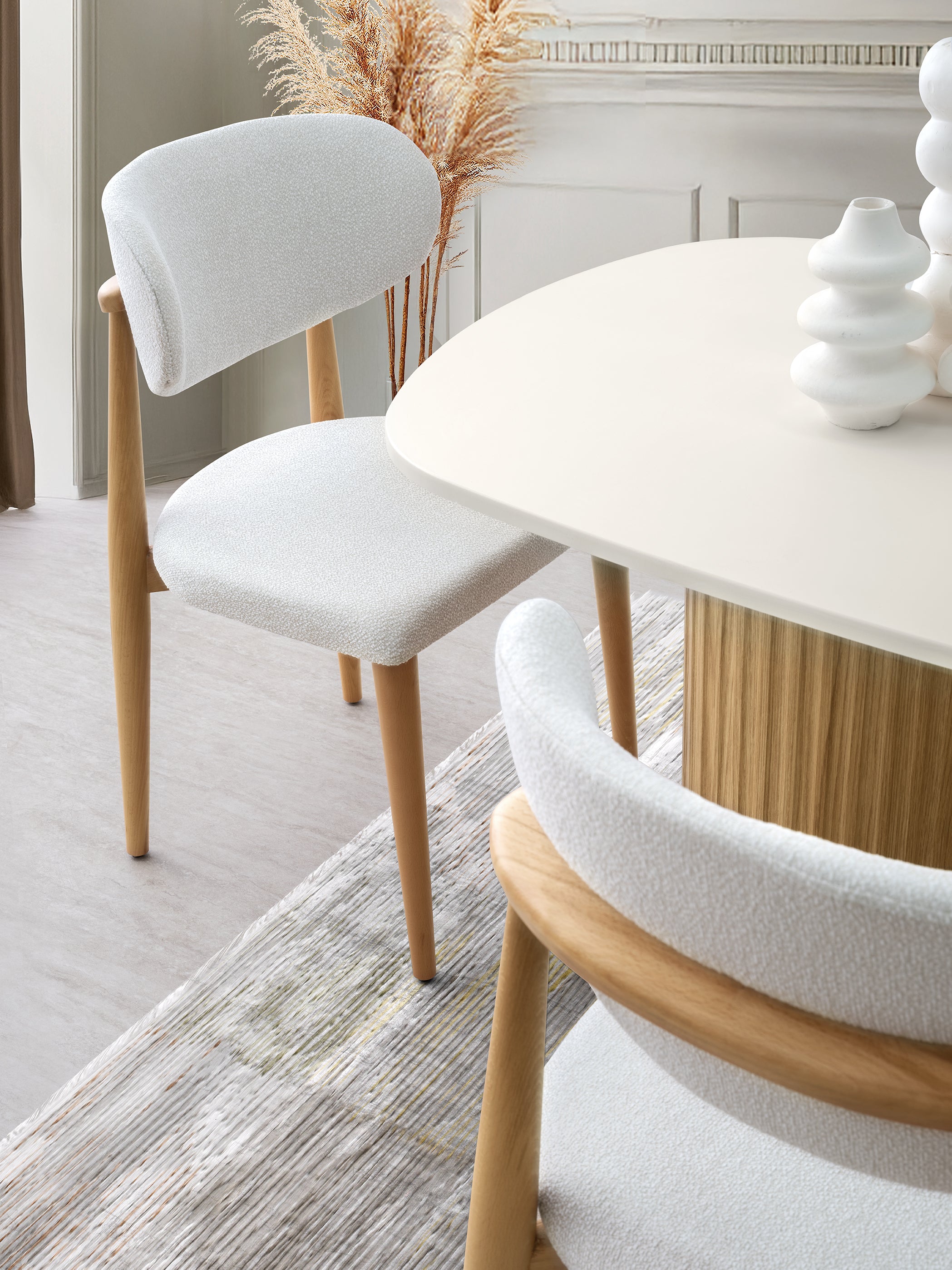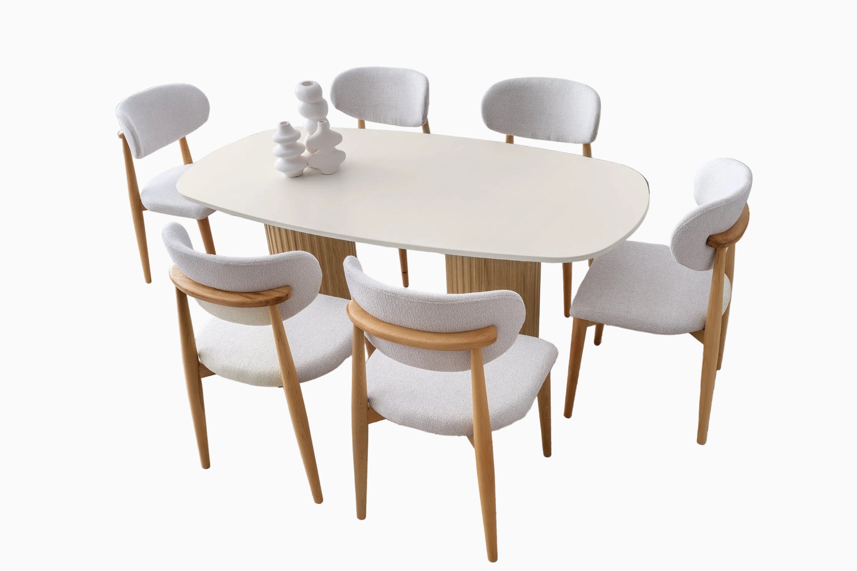 Столовете са проектирани с фокус върху комфорта и естетиката – разполагат с мека тапицерия от висококачествен текстил и ергономично извити дървени облегалки, които следват линията на тялото. Тази конфигурация от маса с 6 стола е идеалното решение за семейни вечери и стилни събирания.
